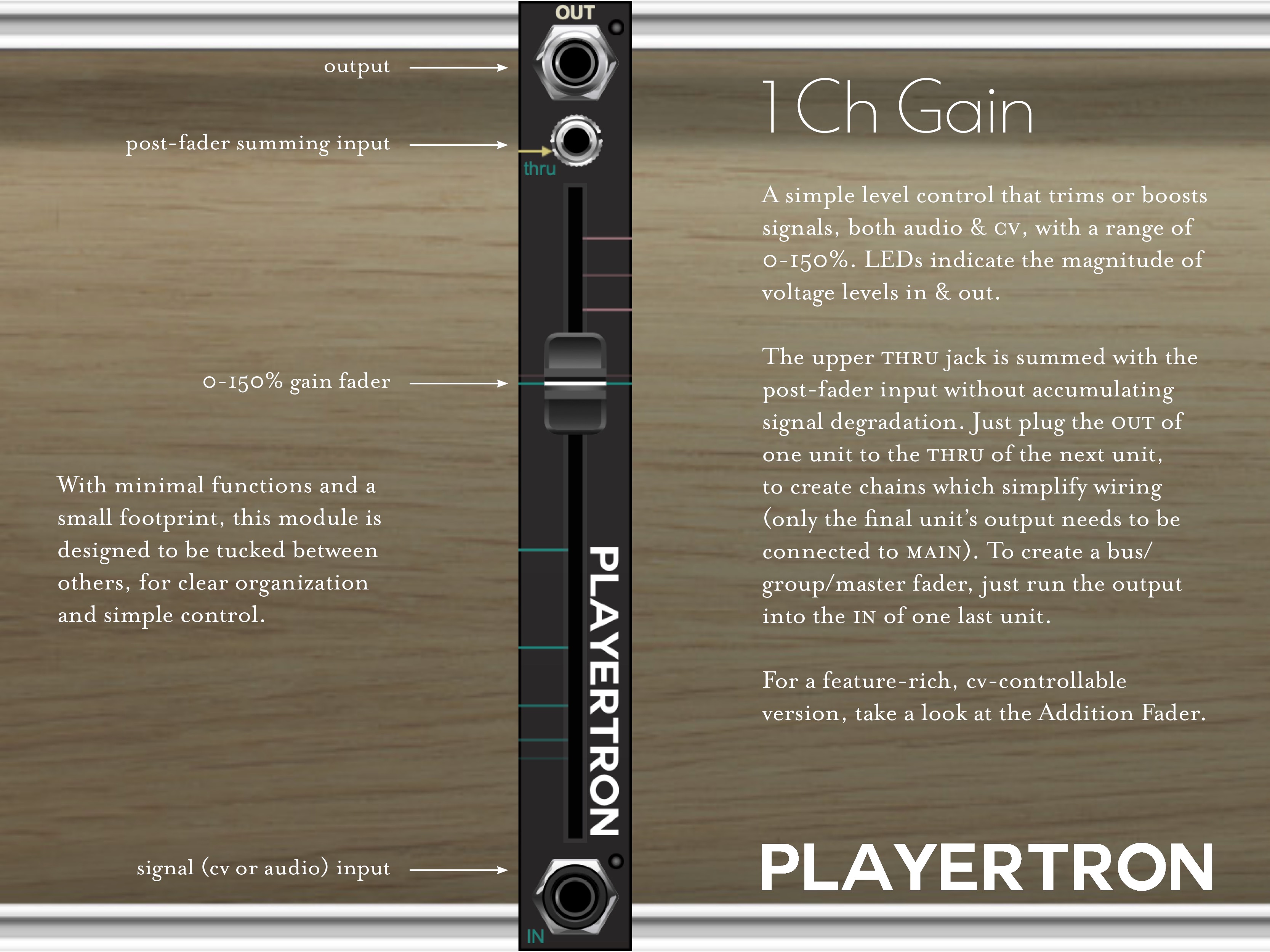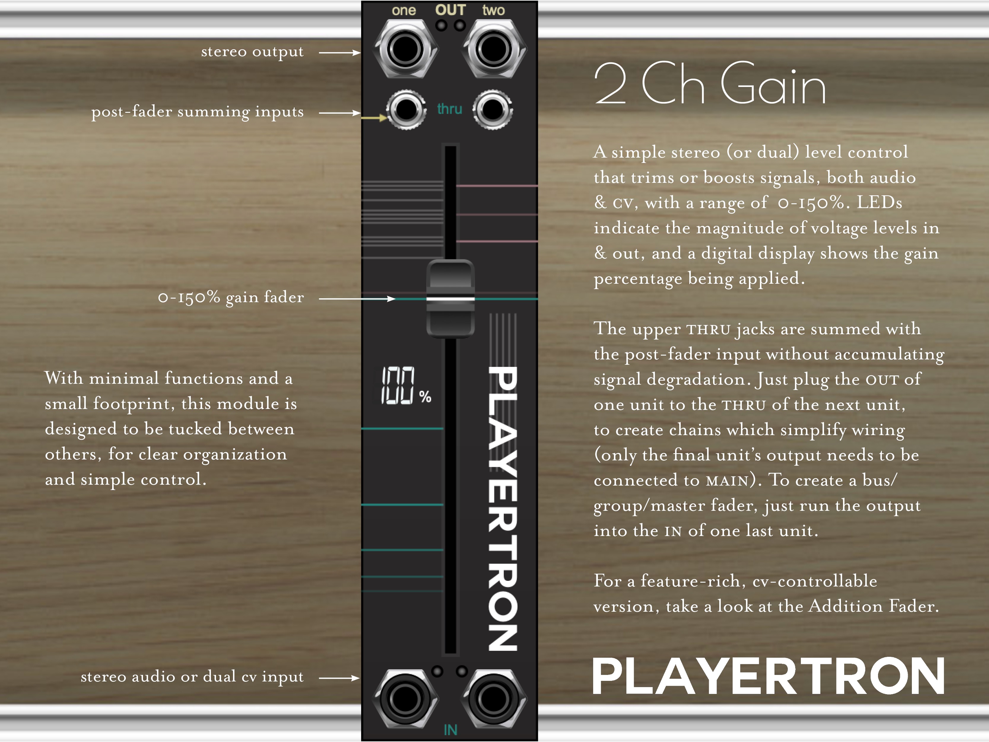 1 Channel Gain & 2 Channel Gain offer simple audio or cv level control, with a small footprint to easily squeeze alongside the source which it is trimming/amplifying. It is available in mono or stereo/dual.