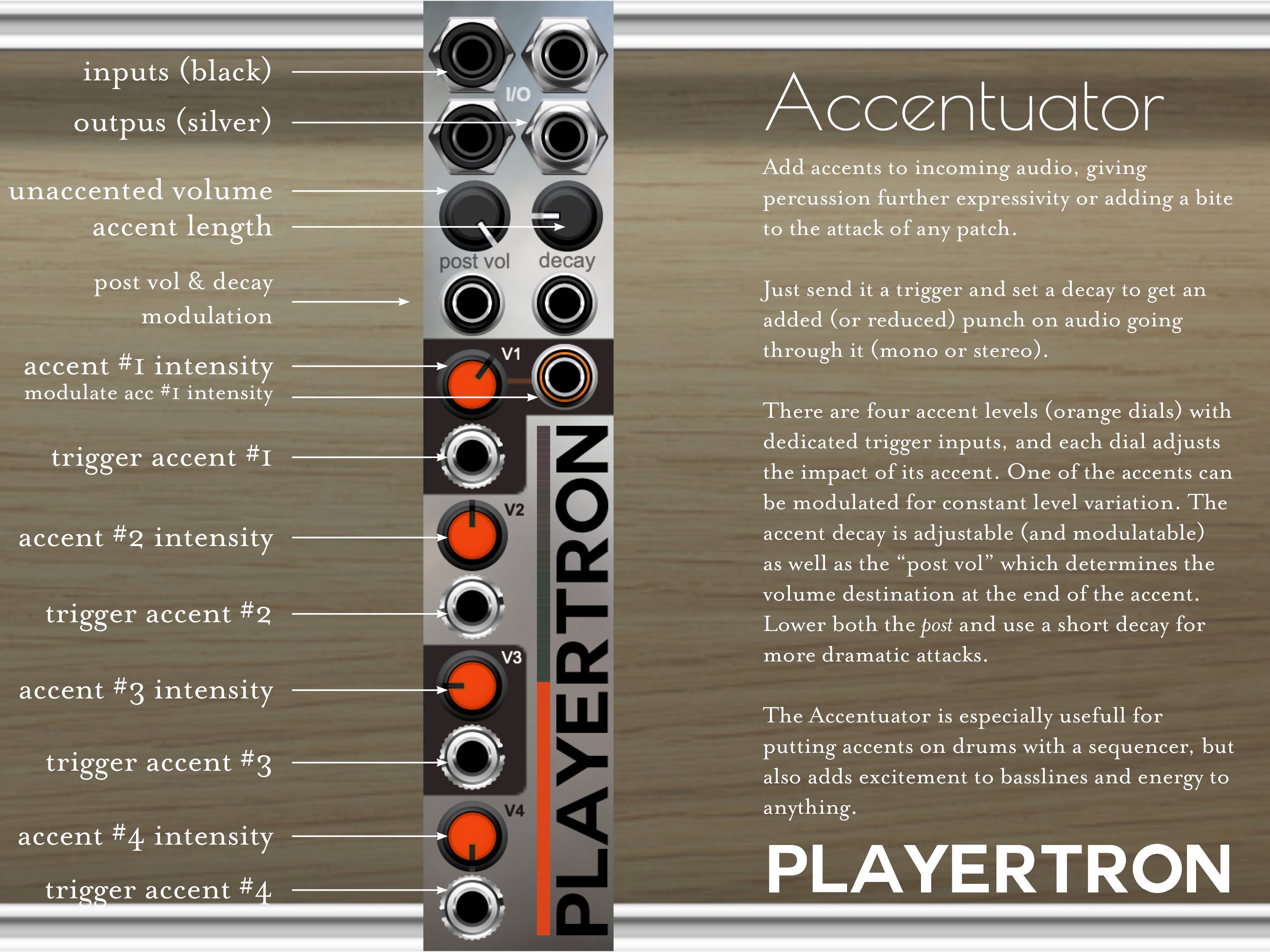 This is the middle sibling between the Accentuator & the Poly Poly Accentuator – it allows a user to create accents on audio with a trigger to any of its four mono pulse inputs, corresponding to different accent levels.