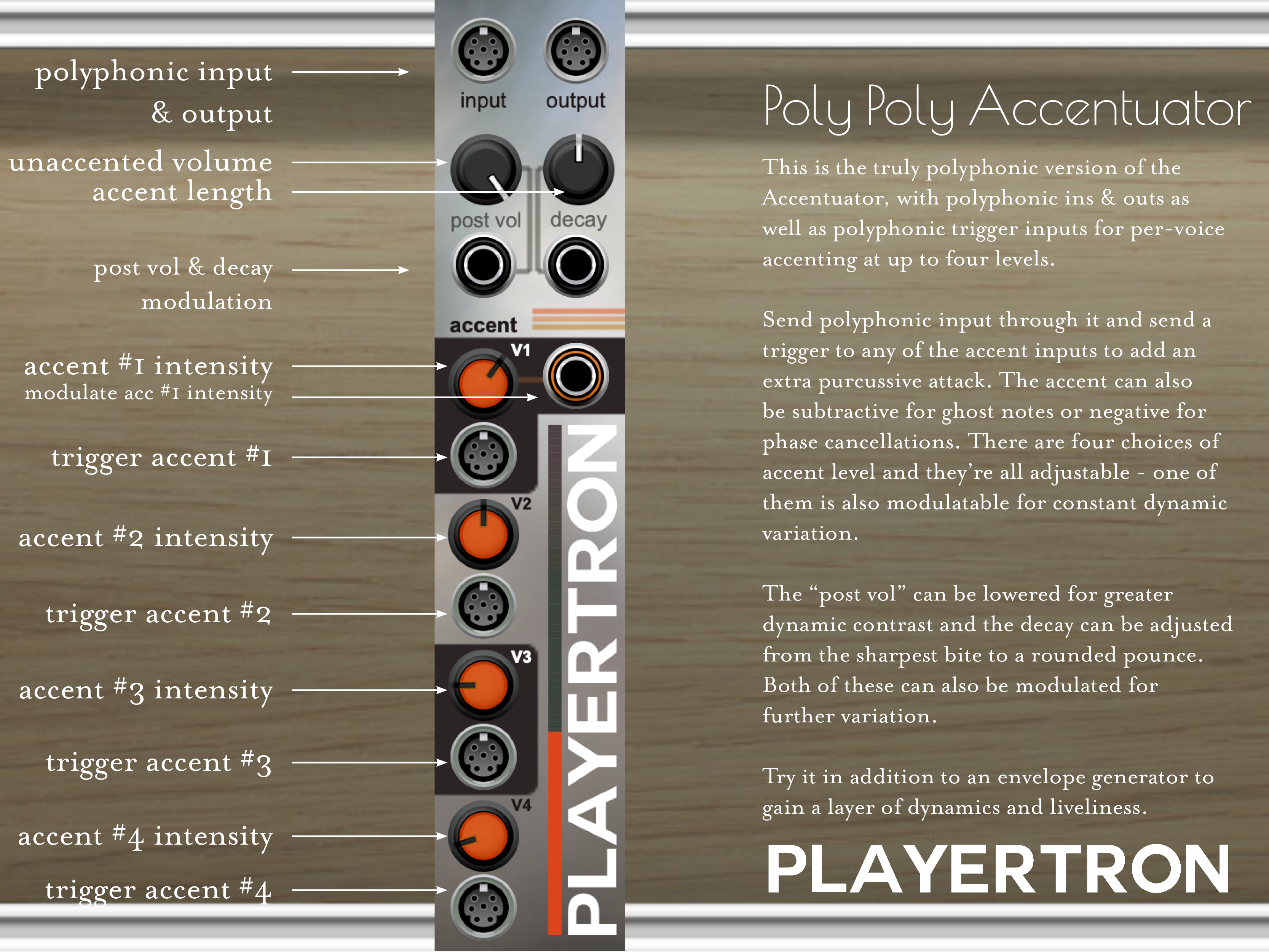 This is the truly polyphonic version of the Accentuator, with polyphonic ins & outs as well as polyphonic trigger inputs for per-voice accenting at up to four levels.