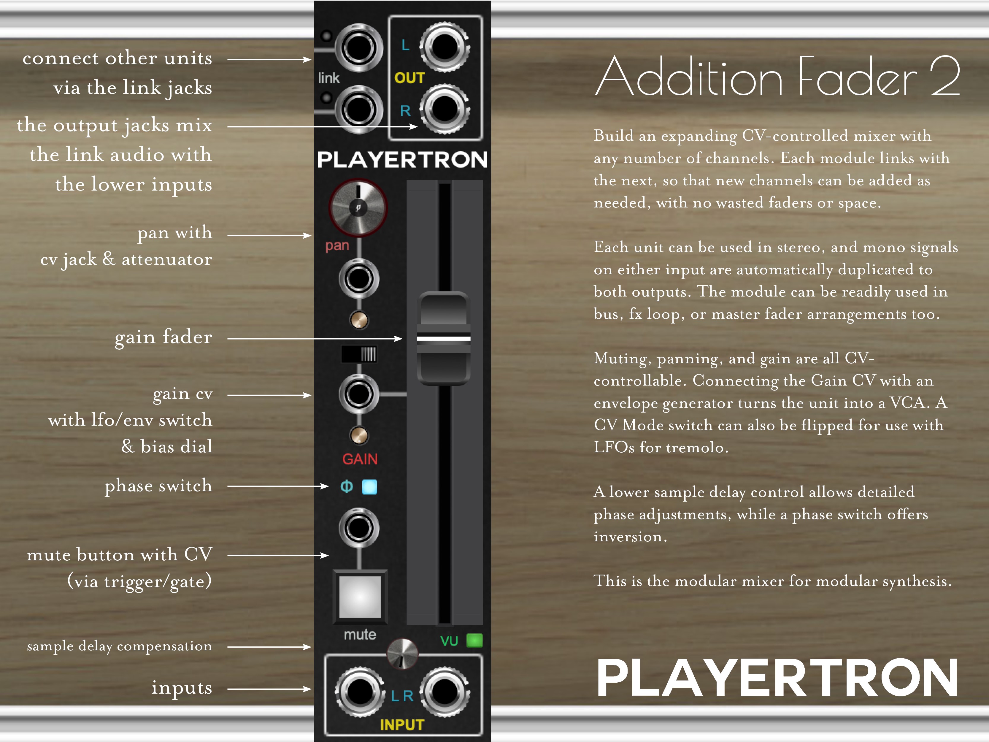 Each unit can be used in stereo, and mono signals on either input are automatically duplicated to both outputs. The module can be readily used in bus, fx loop, or master fader arrangements too. Go ahead and use it for audio and cv alike.