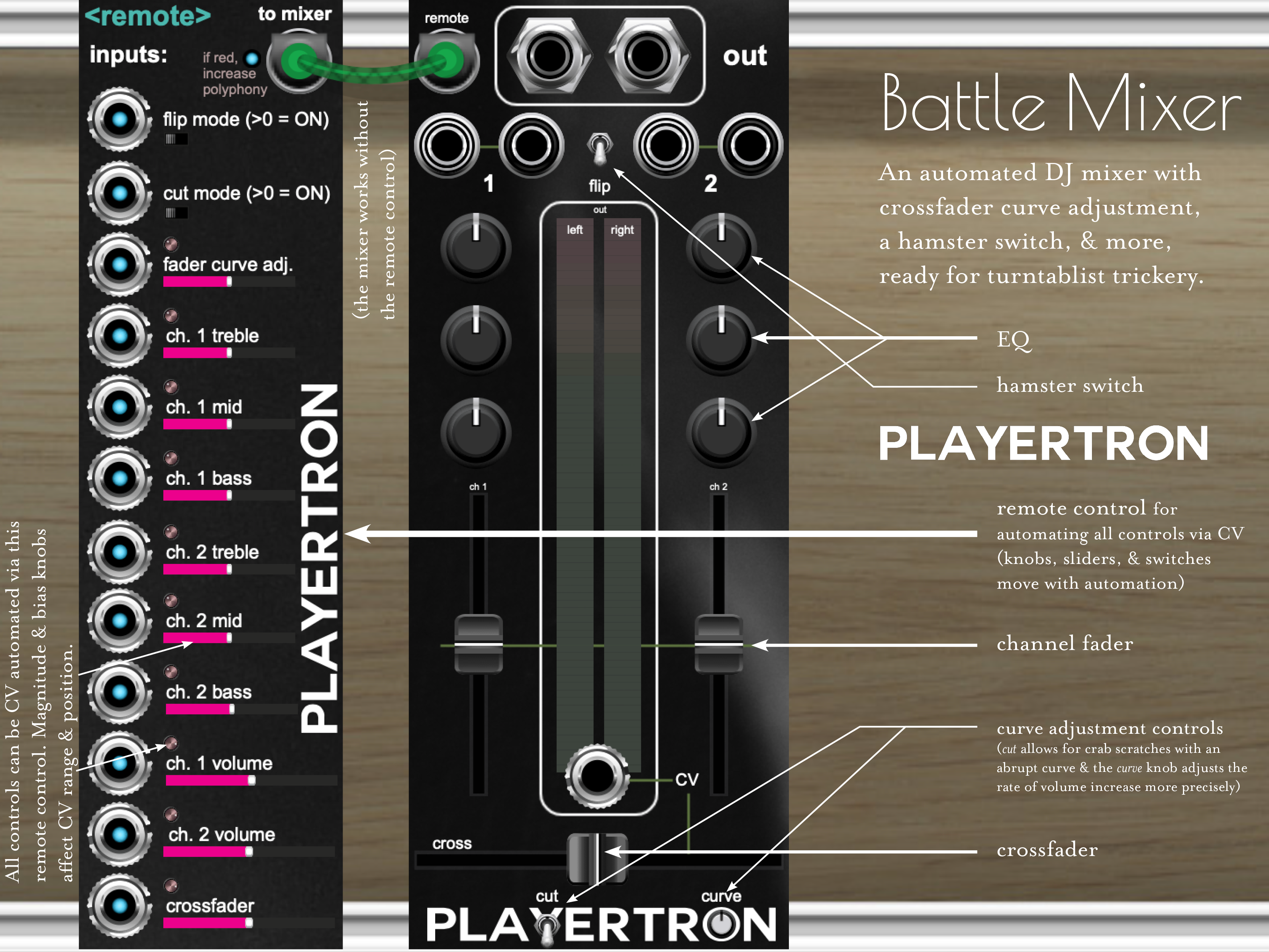 The crossfader is CV controllable (lower center jack) and a jack for remote control provides access to automating all controls via the Battle Mixer Remote, via a poly breakout like the Poly Collector, or (if you’re up for a little trial & error) via any poly connection.