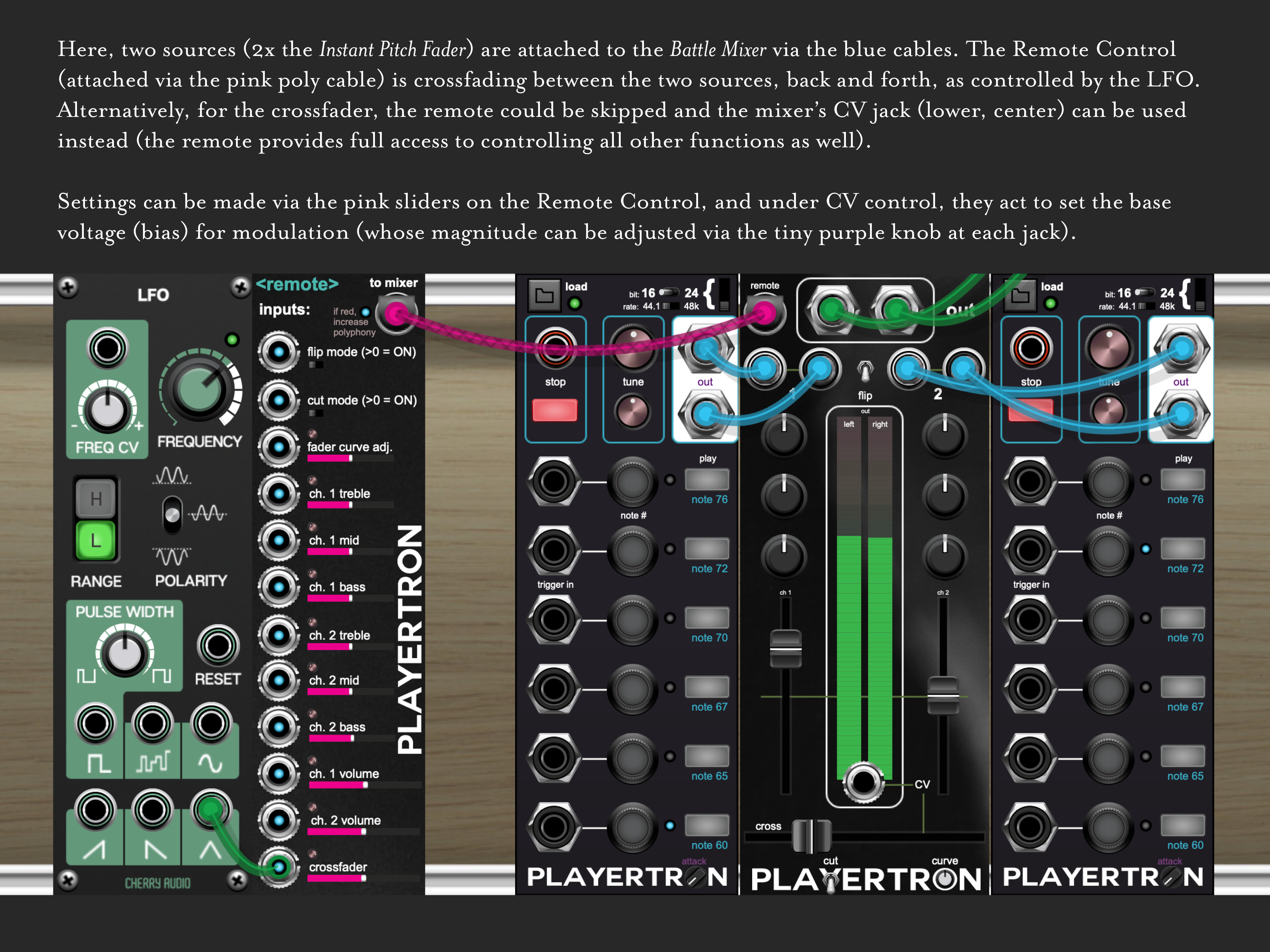 Use the Battle Mixer to simulate a DJ rig, to bring mix technique to modular synthesizers, to create tremolos/ blend tremolos/ complex EQ modulations, to morph oscillators or LFOs, to mix CV signals with precise control, and to explore all sorts of other possibilities of the mixer as an instrument in itself.