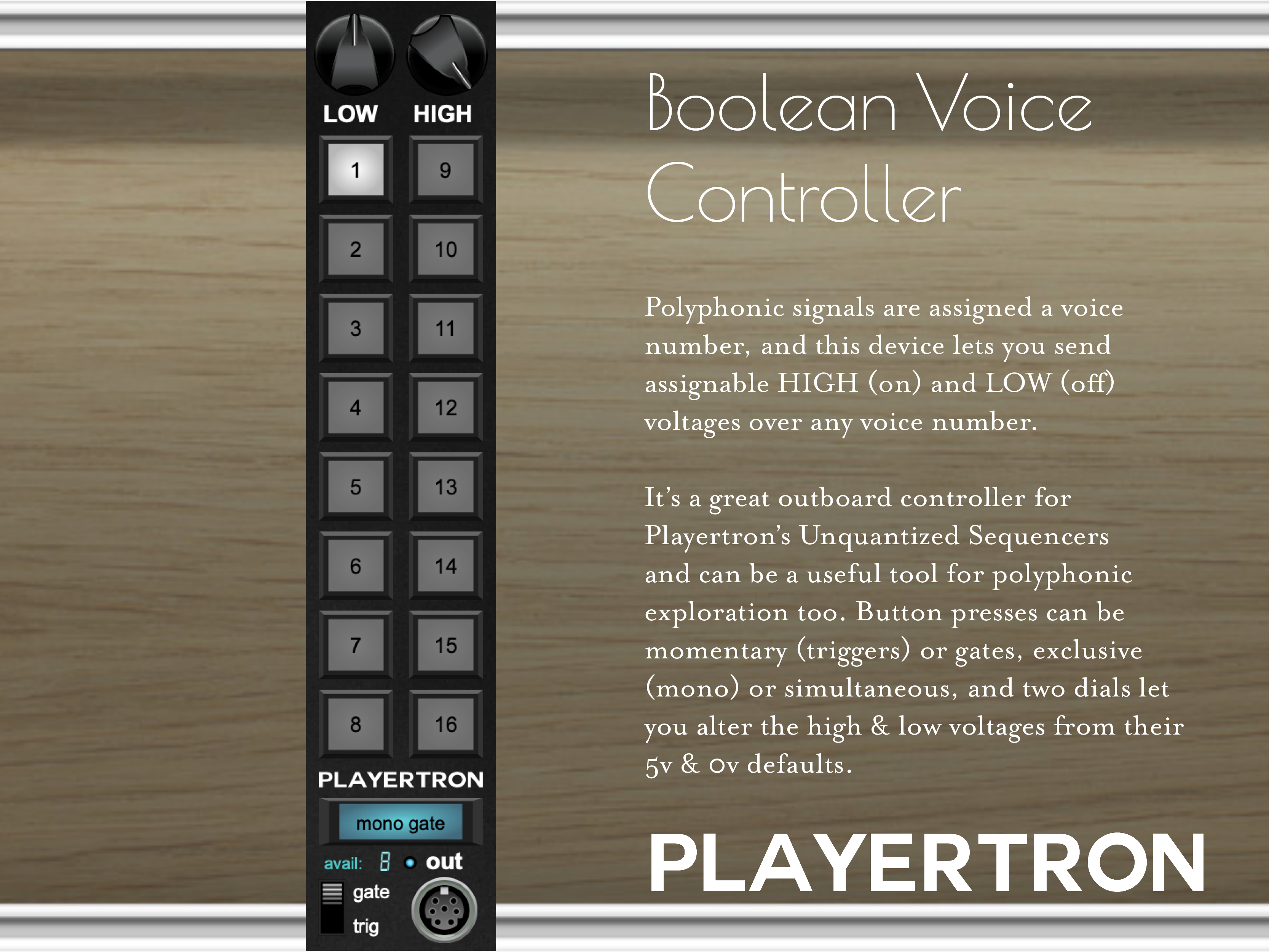 Polyphonic signals are assigned a voice number, and this device lets you send assignable HIGH (on) and LOW (off) voltages over any voice number. Button presses can be momentary (triggers) or gates, exclusive (mono) or simultaneous, and two dials let you alter the high & low voltages from their 5V & 0V defaults.
