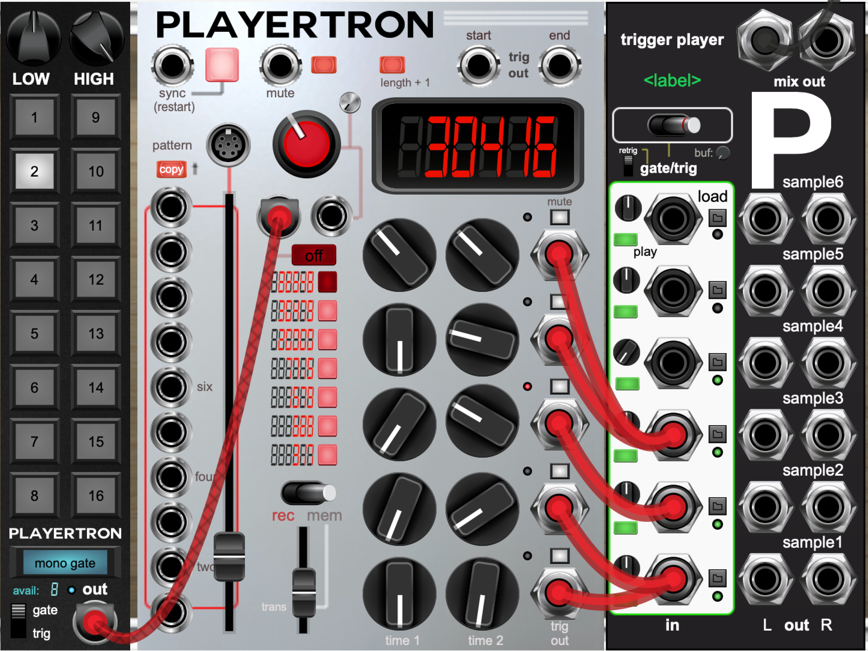 Press a numbered button and the value of the HIGH knob (5V by default) is transmitted over the corresponding voice number via the poly ouput jack. Turn the button off and it transmits the LOW knob’s value (0V by default). Both can be adjusted between -5V and +5V, and “on” needn’t be a higher voltage than “off”, saving you inverters and attenuators. In gate mode, HIGH is a constant signal, but in trigger mode (lower left switch), the HIGH signal is a short pulse (however long the button is tapped) before returning to LOW. Gate mode allows multiple buttons to be toggled simultaneously HIGH, but the mono gate button (large, blue, toward the bottom) makes them exclusive, where turning one on shuts the previous one off.
