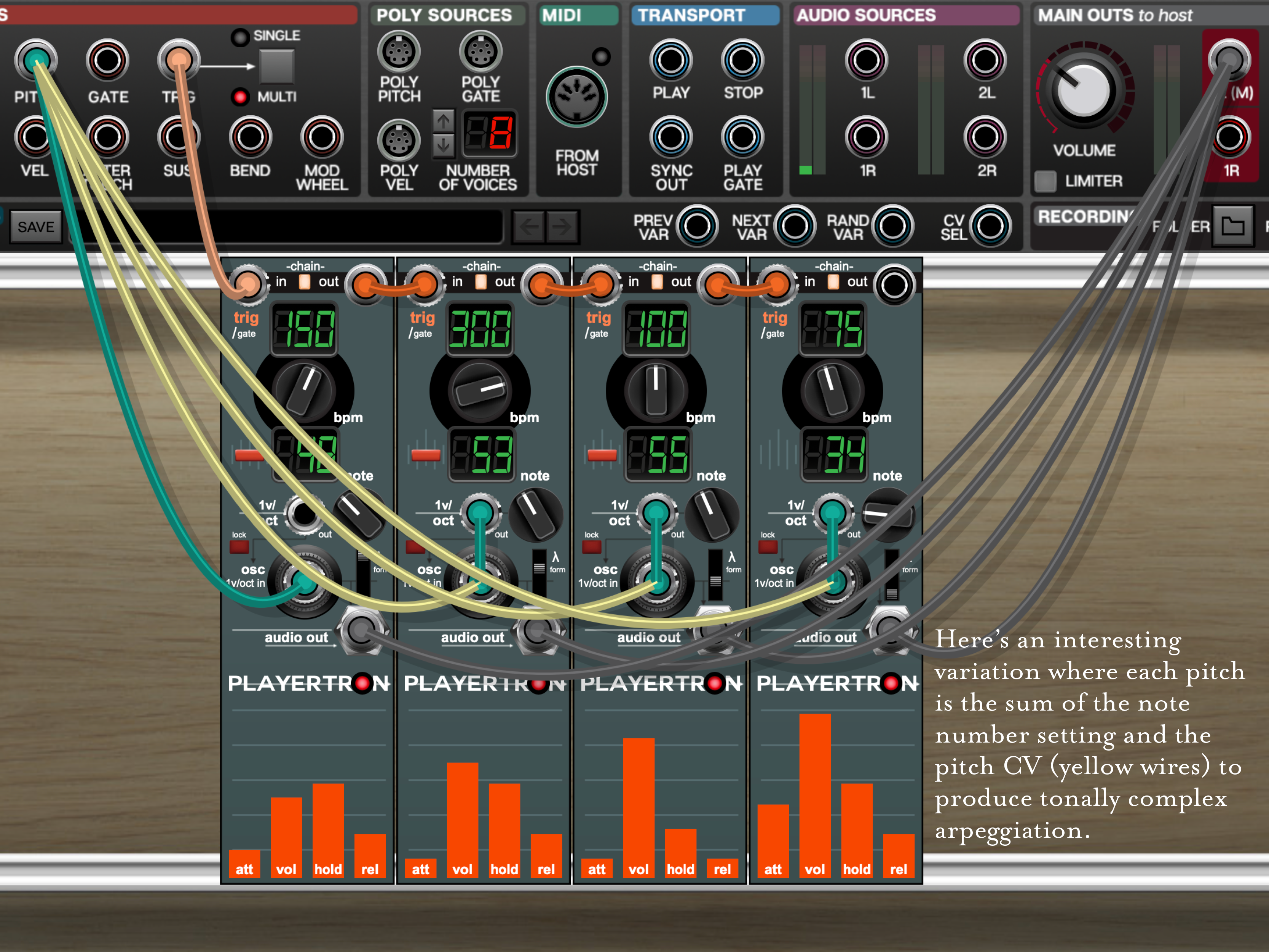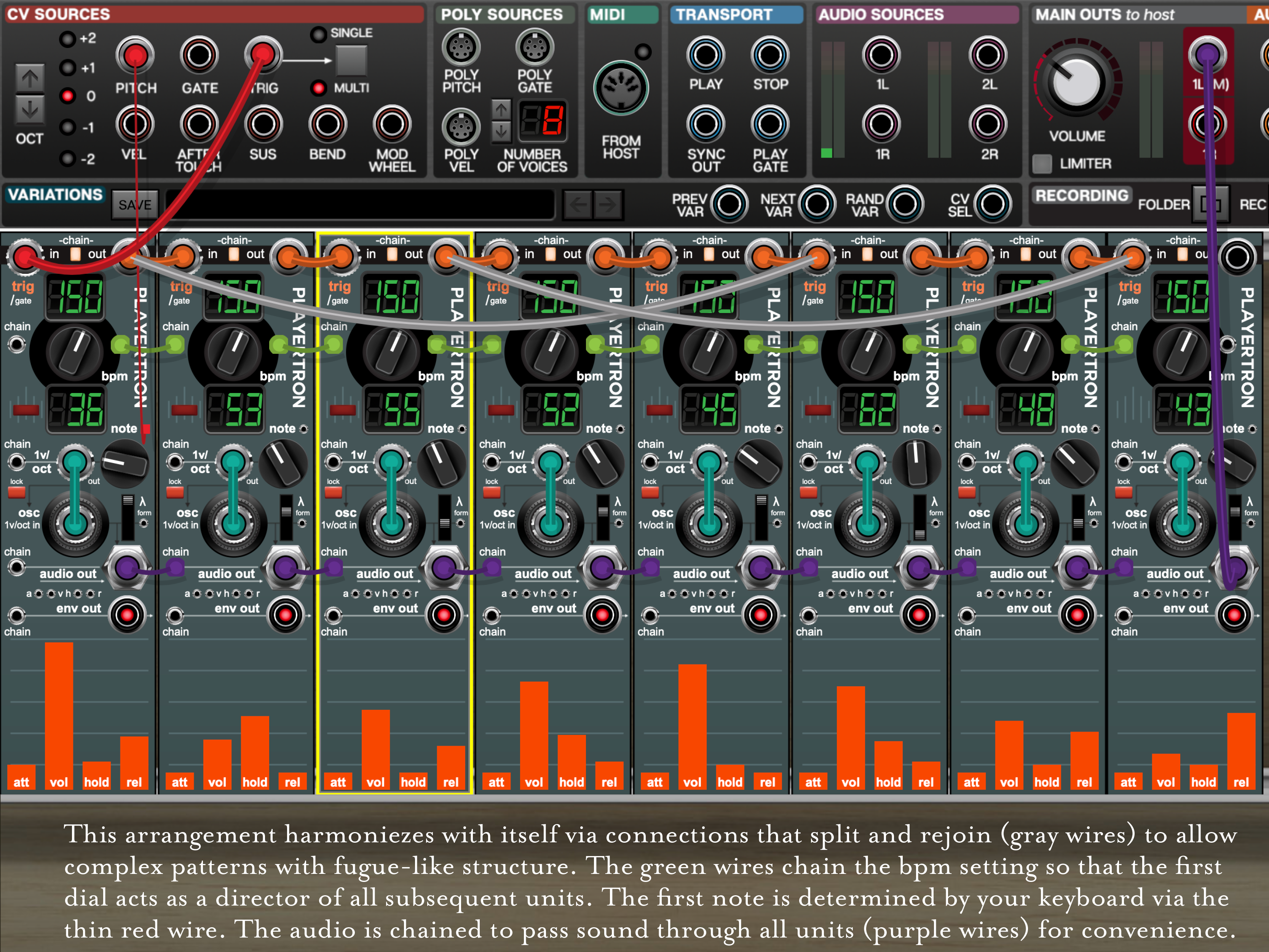 With CV control of note value, waveform, attack, volume, hold, and release, units can mutate with modulation and evolve over time. As more complex networks of connections grow, both serendipitous surprises and baroque design are possible. You can sequence songs or set up generative automata.