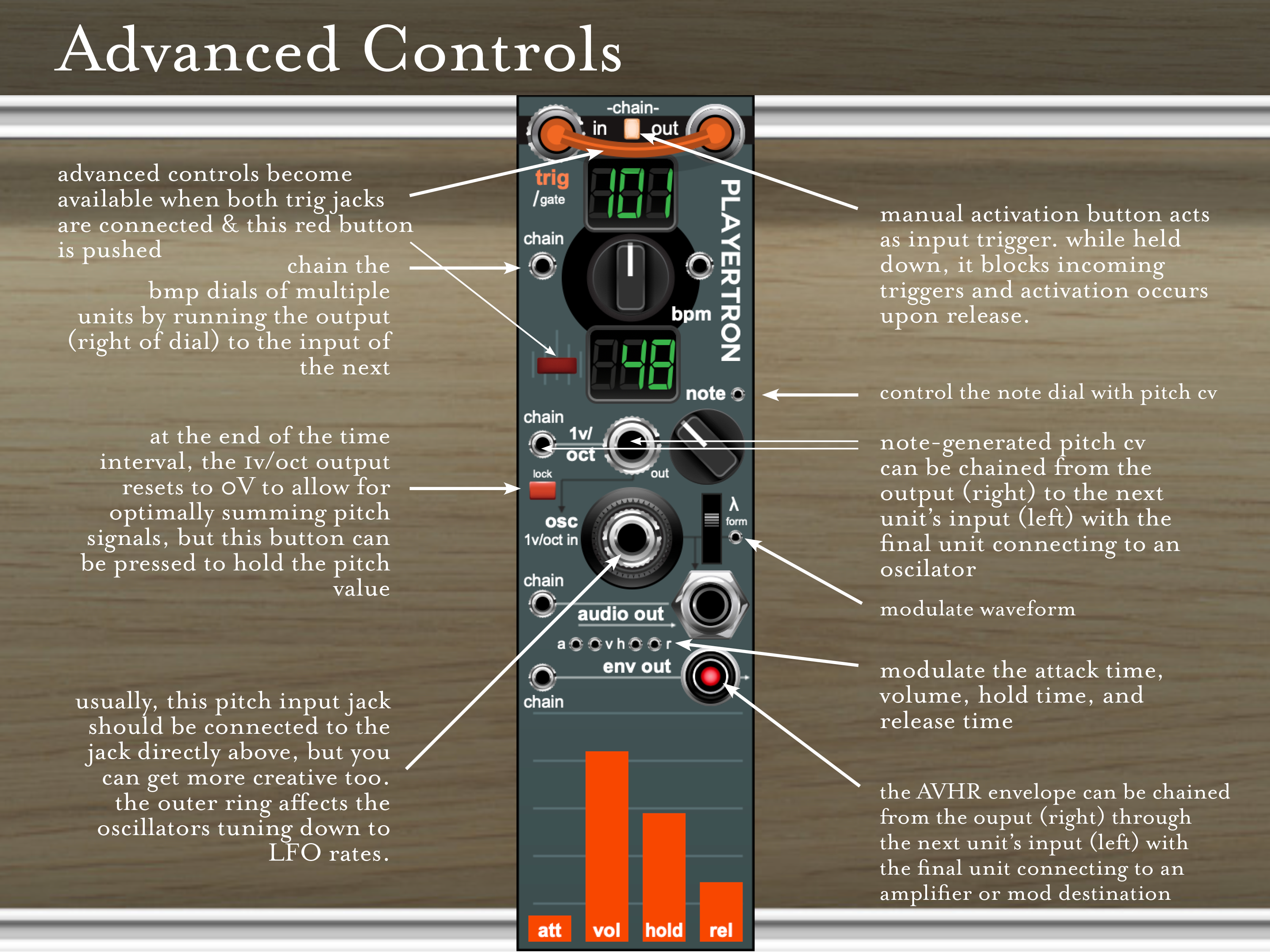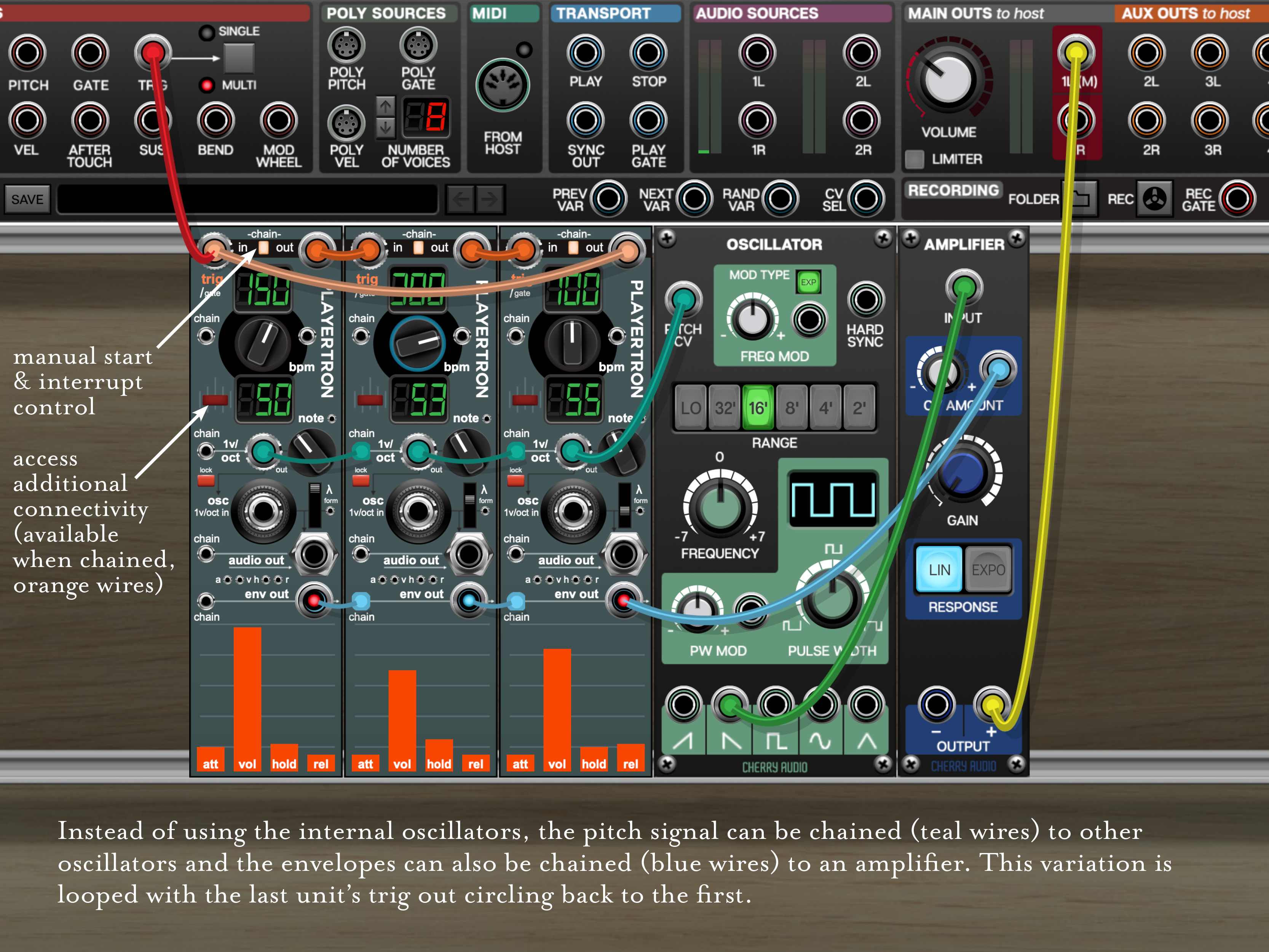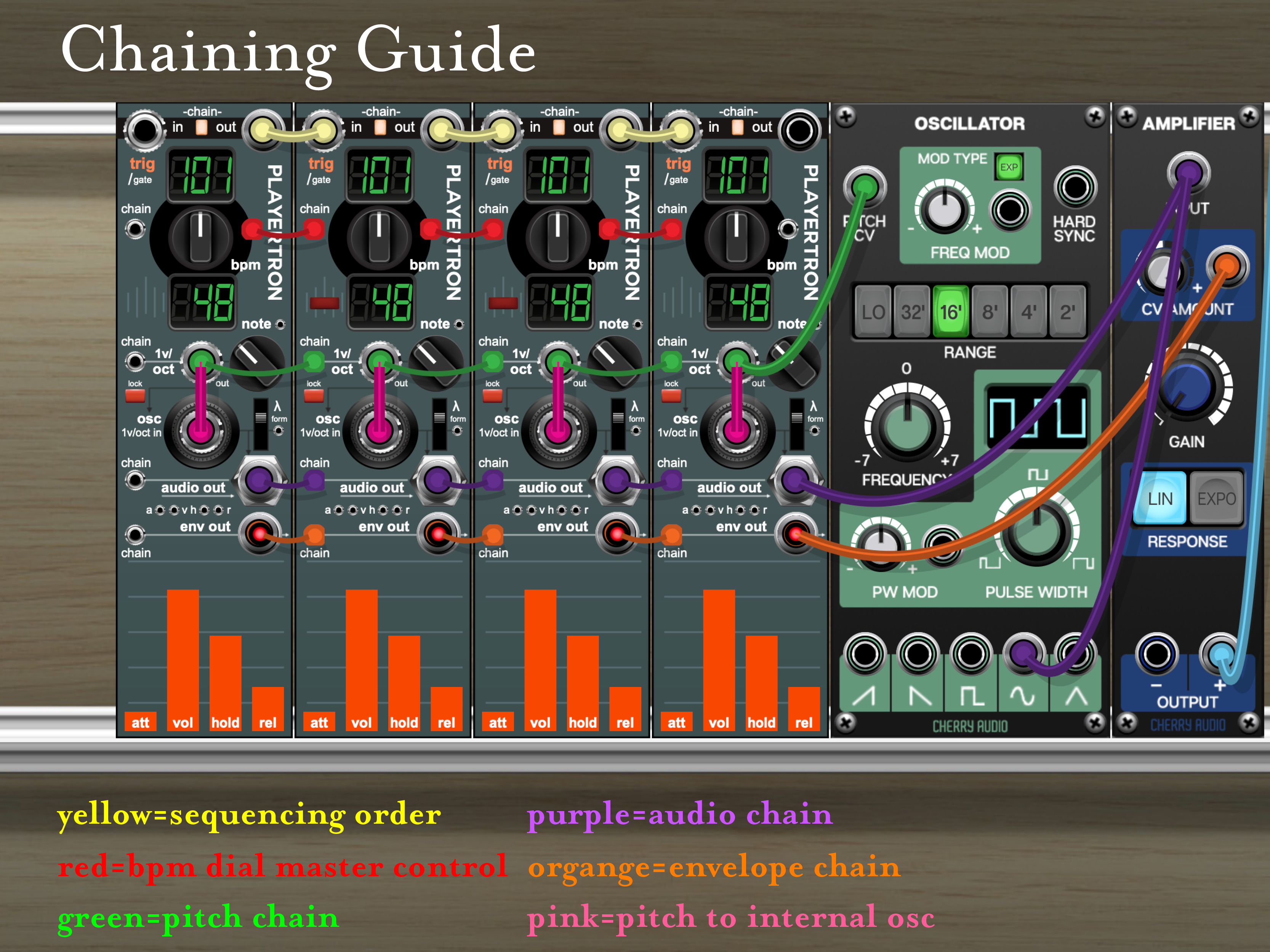 When a unit is triggered, it outputs pitch CV, oscillator audio, an envelope, and a trigger pulse at the end of a single beat. Pitch CV can be tied together in a transmission line terminating at an oscillator, where a chain of units sequences a melody together. Alternatively, the pitch CV can be fed into its own tunable oscillator to output sound directly. With four waveforms and its own envelope, units can be differentiated into various types of tones, whose audio can be chained, integrating into a single output. Linking the modules like this is like writing sheet music or a piano roll. The oscillator can be slowed to LFO rates to build a modulation sequencer too. While the envelope automatically acts on the oscillator output, its independent output can also be chained toward an amplifier or to trigger and control other devices.