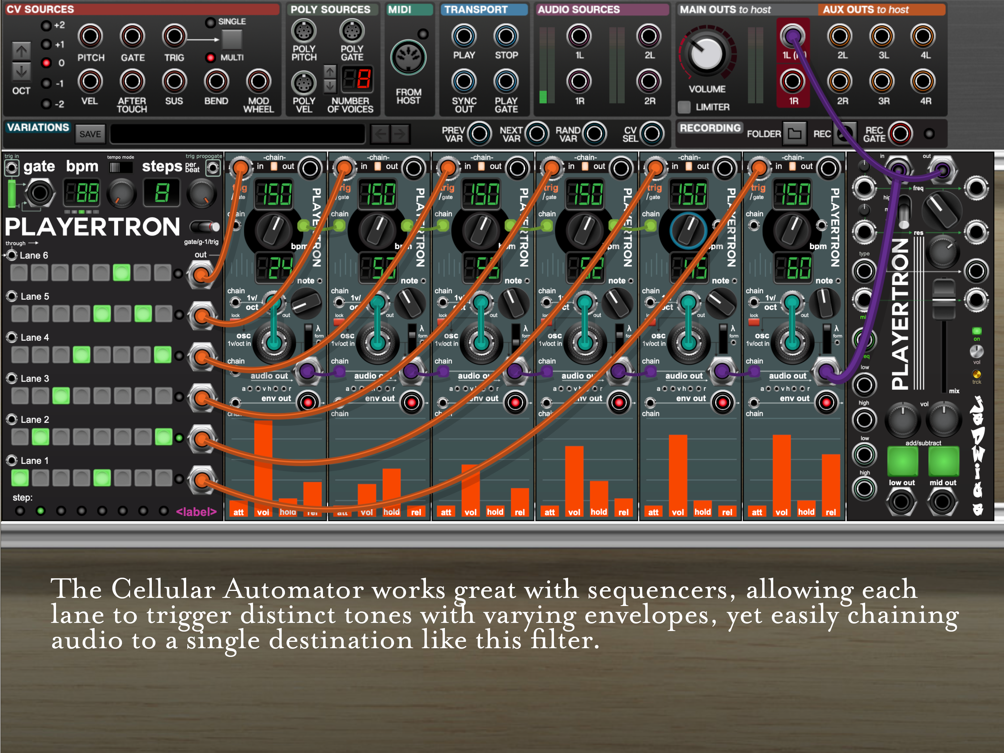 Mutually-organizing oscillator, chain-reaction sequencer, and cascading-signal envelope, the Cellular Automator is designed to parallel the cell and its ability to assemble into multicellular complexes for coordinated behavior. It’s both a versatile utility for achieving precise aims, and an experimental apparatus that gives you the freedom to concoct surprises. The device makes possible multiples types of network based on rhythm, pitch, audio, and envelope generation. Sequencing chain connections order each unit like dominoes, each knocking into the next one based on their BPM values. They can be arranged in infinite loops, bifurcating branches, and webs of paths.