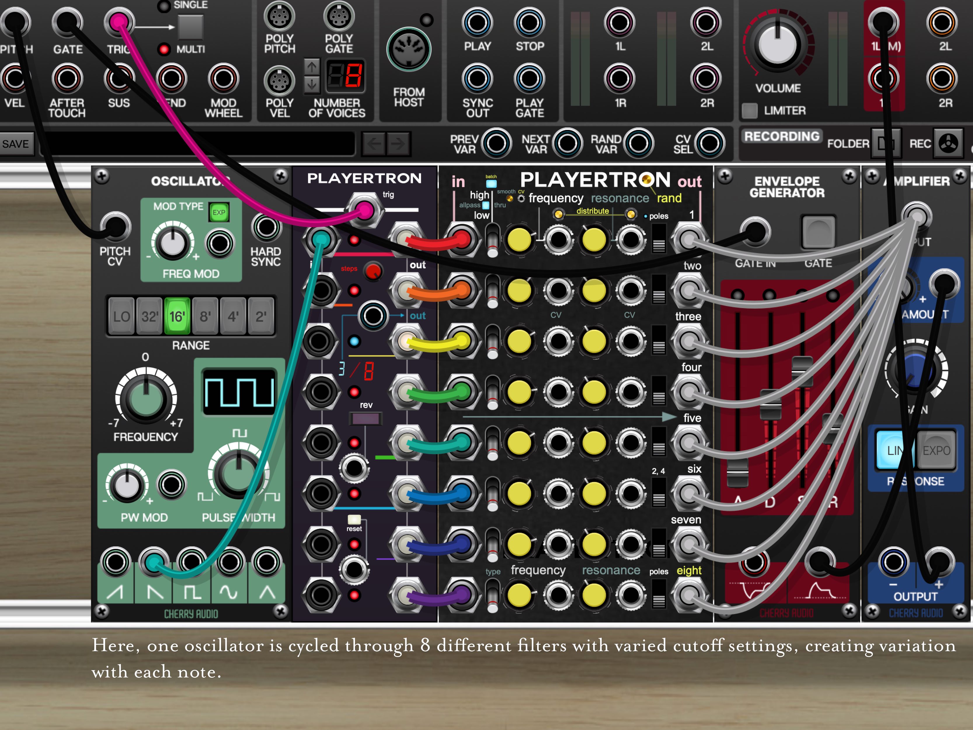 Send oscillators through a round robin of filters, send drums through a sequence of mix channels at different volumes, and create a sequence of signal paths. You can also flip-flop stereo, rotate poly signals (with a poly distributor/collector), and perform sequential switch duties.