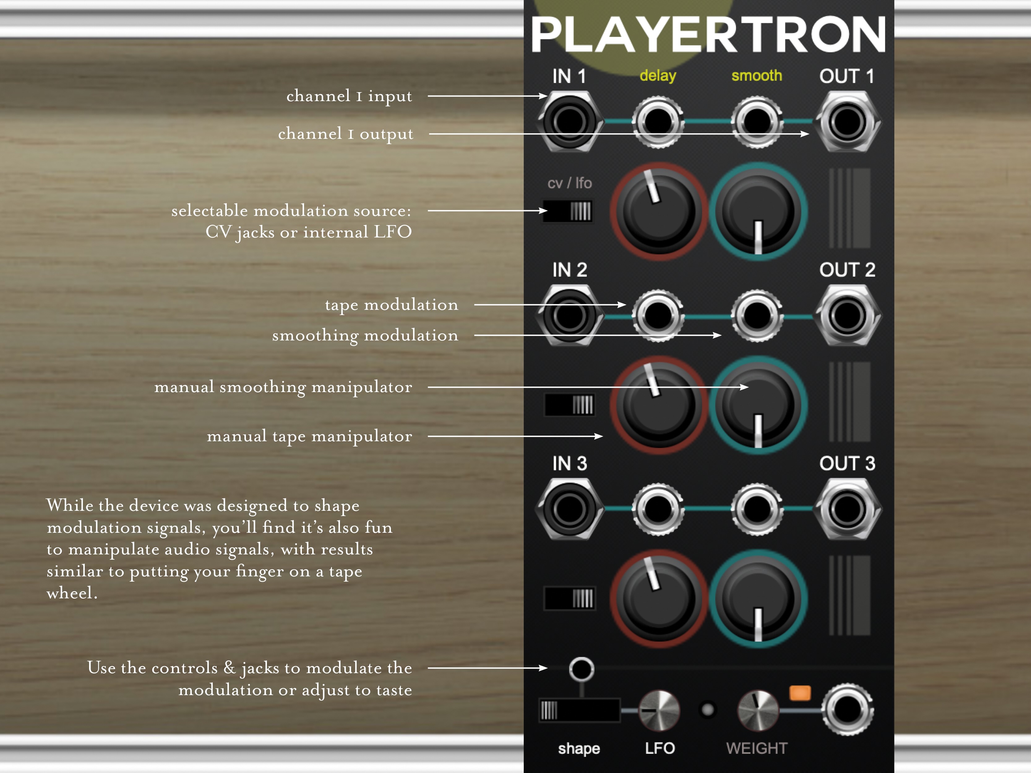 A simple way to take an uninteresting modulation source and present a little chaos, the CV Lag Operator records incoming signal onto a short stretch of tape and simply doesn’t advance the tape with consistency. The result resembles the ebb and flow of the original, but provides regular surprises, organic variation, and complex paths.