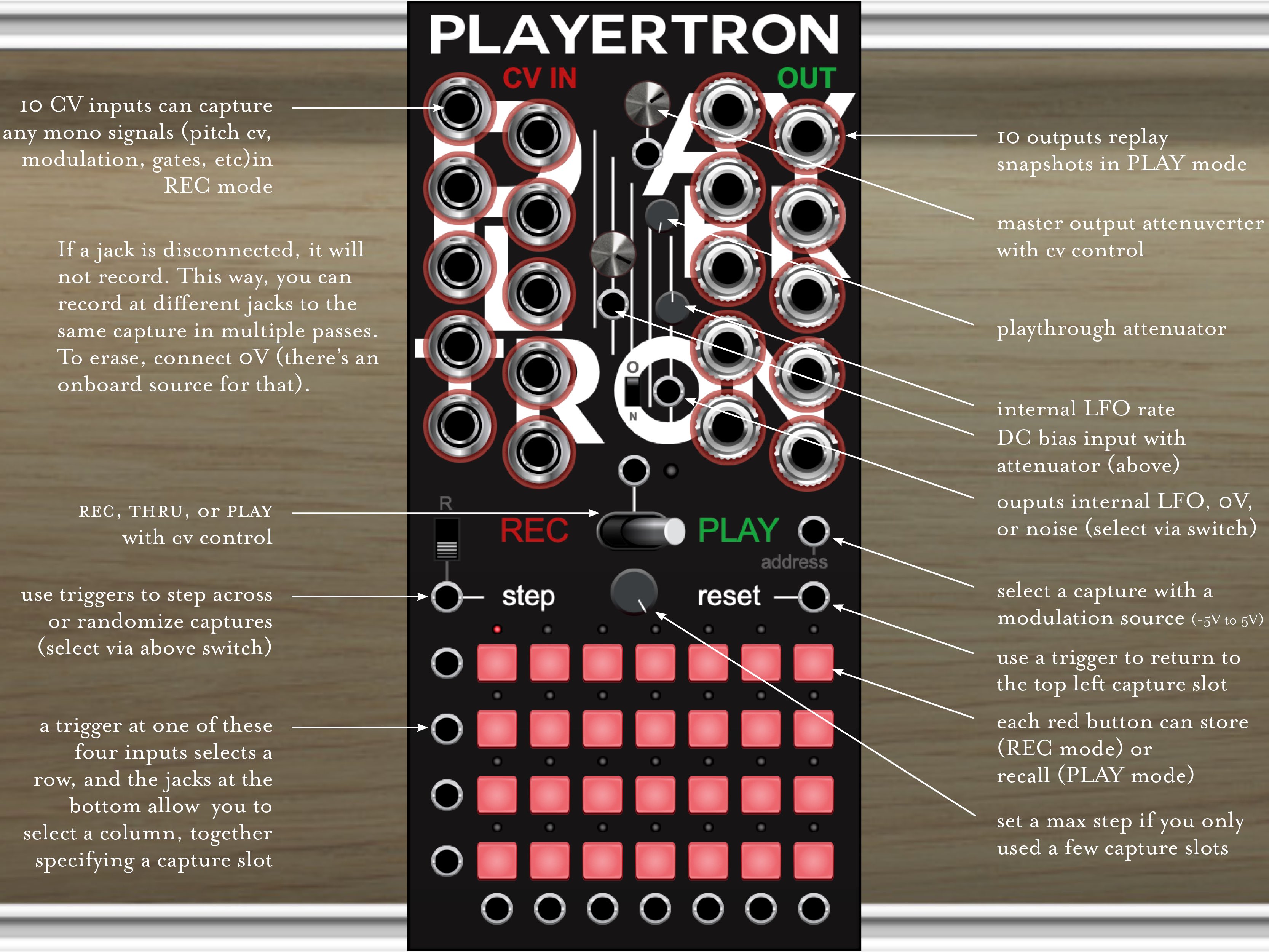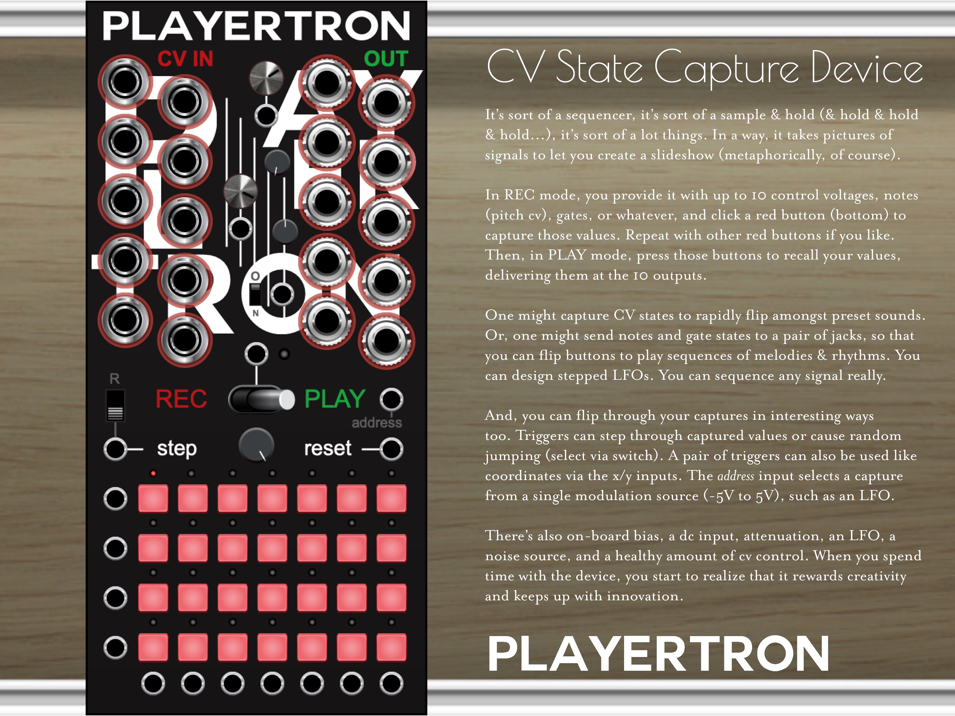 Record snapshots of signals and play them back. It’s like a camera and slide show, only your pictures can be modulation states, pitch cv, gate signals, or… whatever.