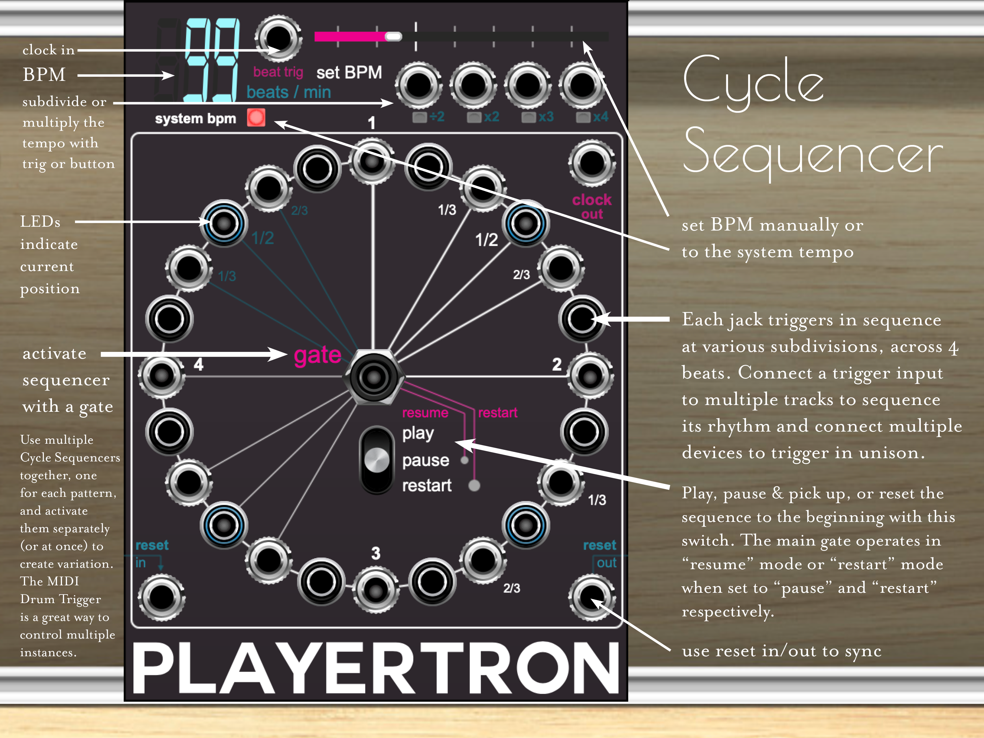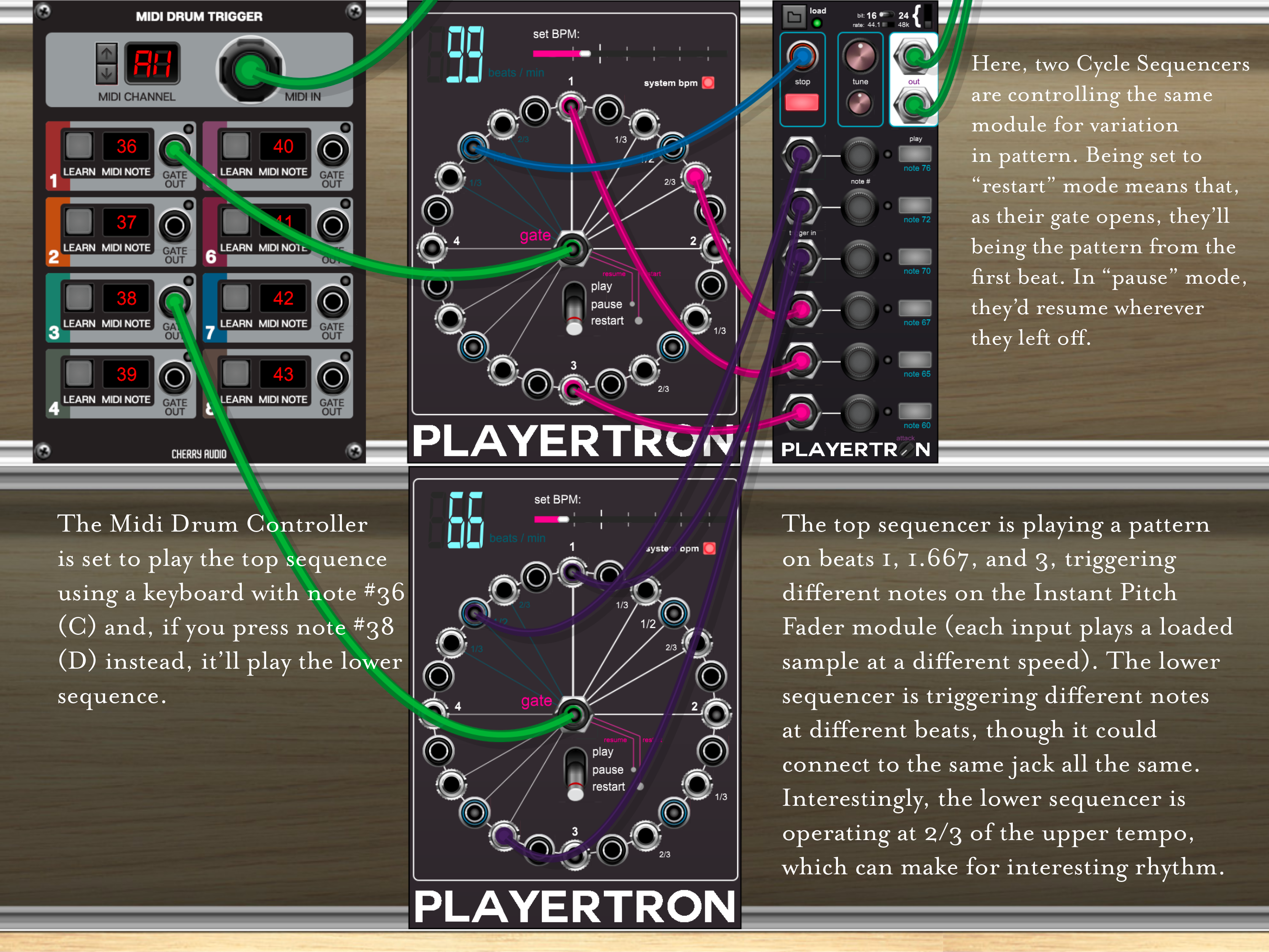 The sequencer is activated by a gate input (center) that either resumes from where it left of (pause mode) or begins at the beginning each time (restart mode). The Midi Drum Trigger is a great way to coordinate multiple sequencers being activated by various notes on the keyboard, but also the sequencers can be sequenced by other sequencers that have gate outputs or they can sort of always tag along whenever a given gated signal is on (or perhaps an LFO).