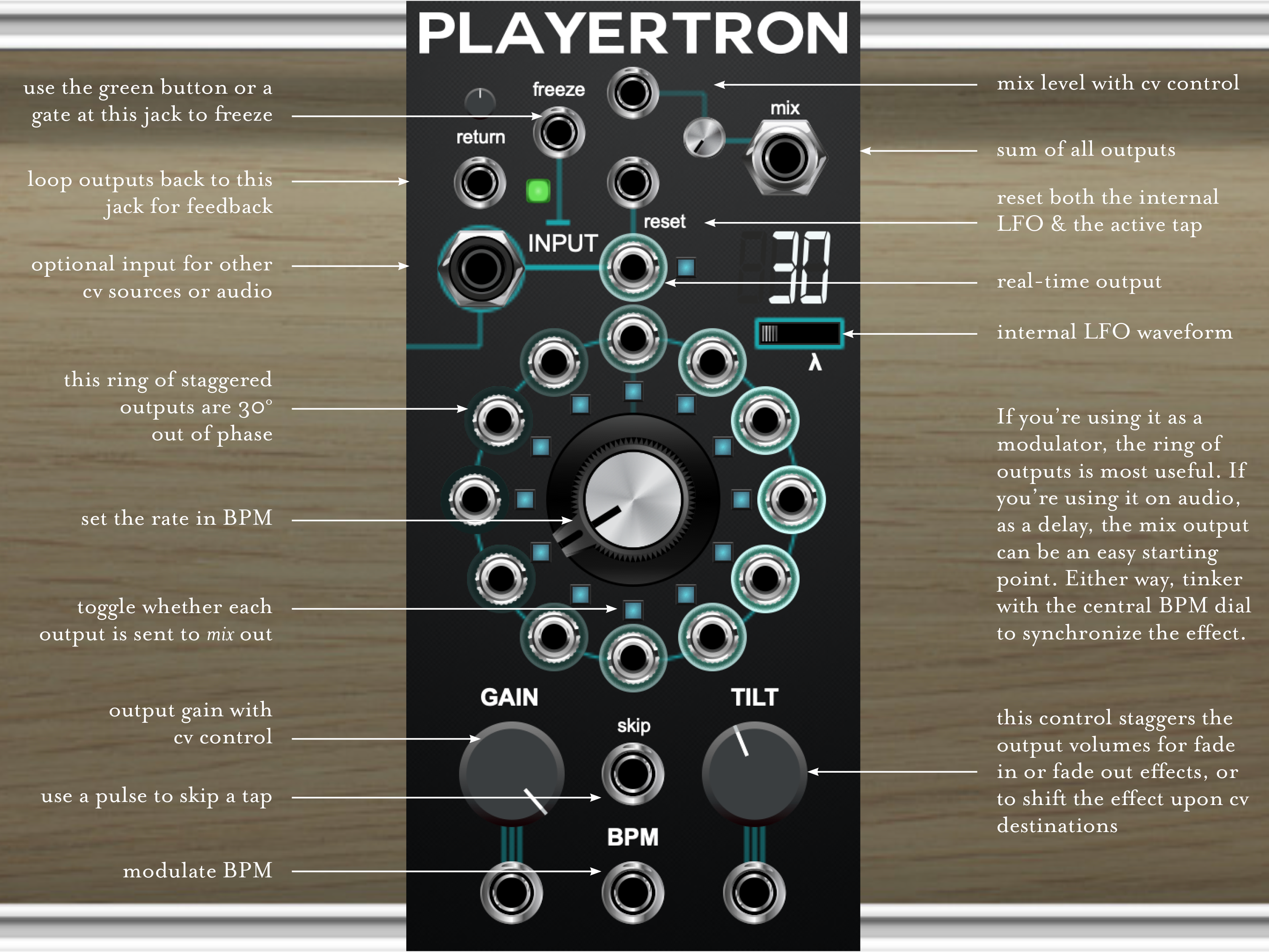 It’s a 12-tap delay and it’s an LFO with twelve staggered outputs, 30 degrees out of phase with each other. Whether you’re using it for rapid stutters or a wash of modulation, the Dodecahedral Phased LFO & Delay produces intriguing results.