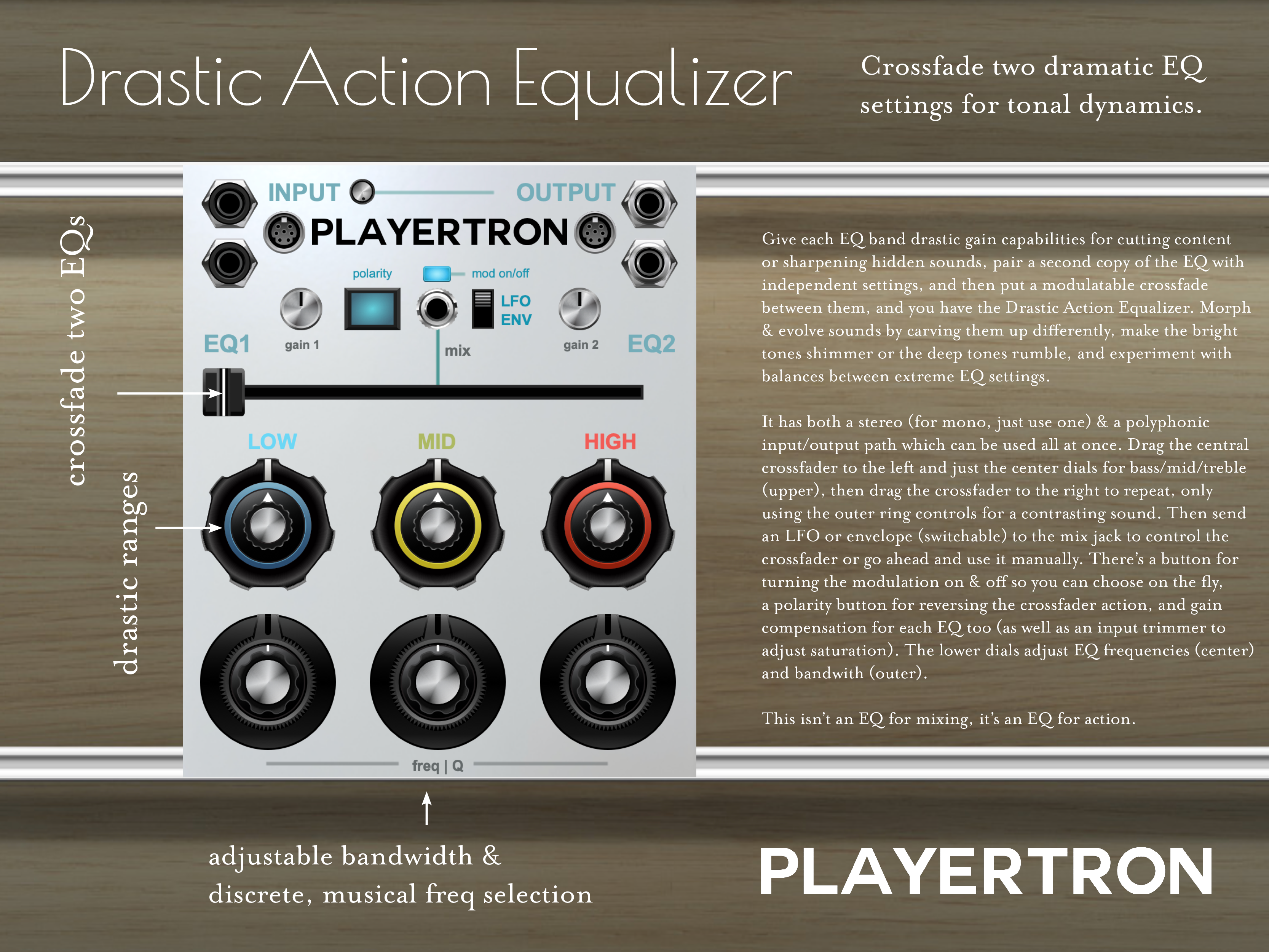 Take a DJ-style cut EQ/filter & take it further in that the direction, then make it a pair of EQs with a crossfader to morph between their settings, then make it modulatable via envelopes or LFOs (or whatever, even audio), and equip it for mono/stereo/polyphonic signal paths, and you’ve got the Drastic Action Equalizer.