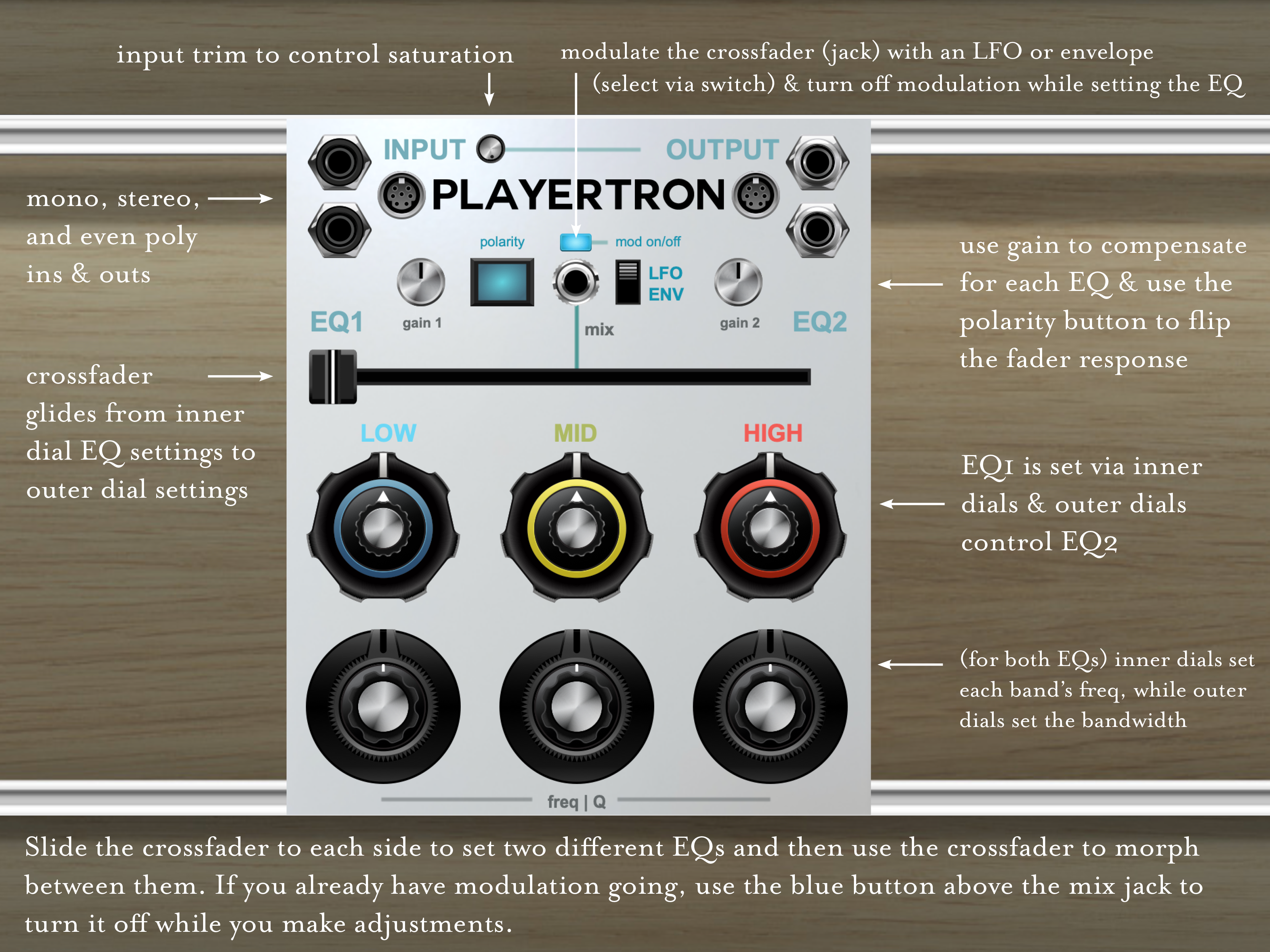 With extreme band gains, adjustable Q and musically relevant discrete frequency selection, this EQ is meant for pushing & pulling audio into new territory and uncovering secret sounds within (samples, complex oscillators, and harmonically rich content make especially great source material). And, with a crossfading pair, you can dynamically go back and forth between an original (with untouched eq settings) and newly crafted tones, or between two contrasting sets of EQ manipulations.