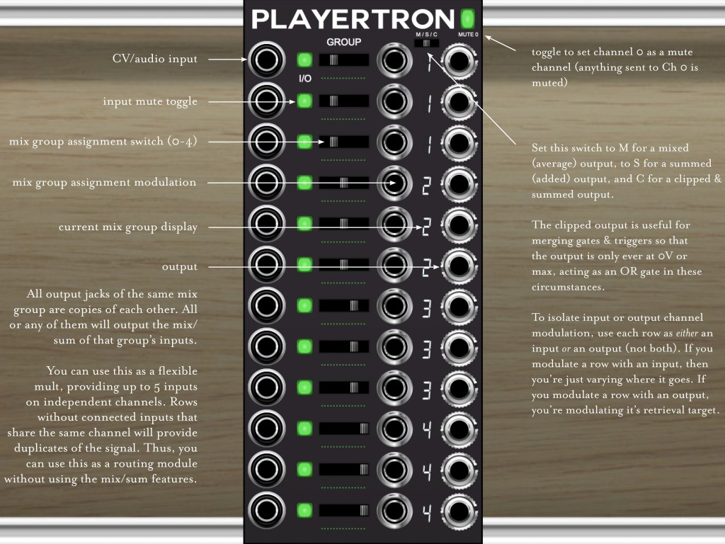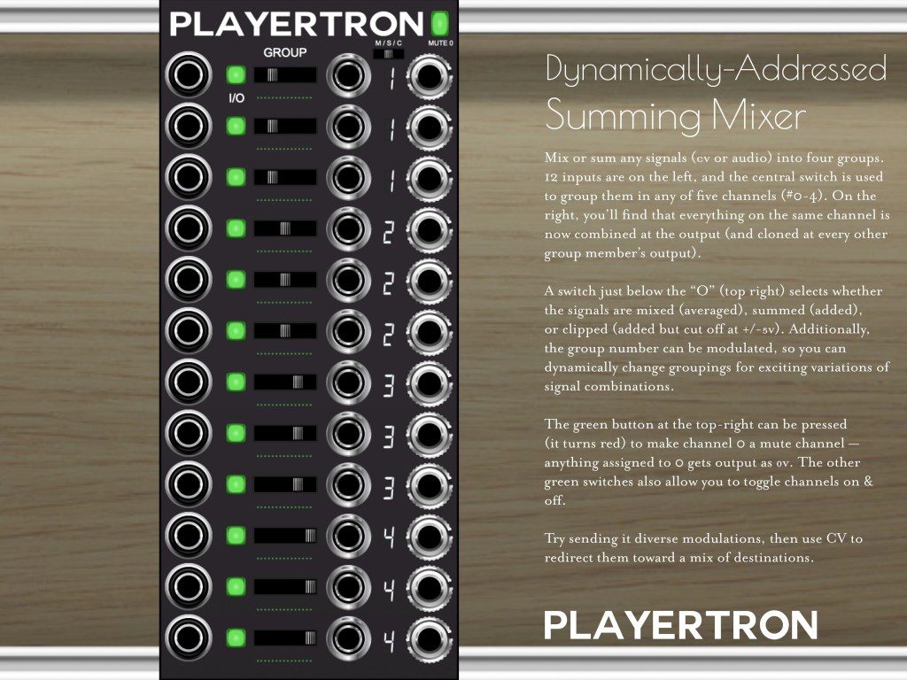 Mix or sum any signals (av or audio) into four groups. I2 inputs are on the left, and the central switch is used to group them in any of five channels (#0-4). On the right, you’ll find that everything on the same channel is now combined at the output (and cloned at every other group member’s output). A switch just below the “O” (top right) selects whether the signals are mixed (averaged), summed (added), or clipped (added but cut off at +/-5v). Additionally, the group number can be modulated, so you can dynamically change groupings for exciting variations of signal combinations. The green button at the top-right can be pressed (it turns red) to make channel o a mute channel – anything assigned to O gets output as ov. The other green switches also allow you to toggle channels on & off.