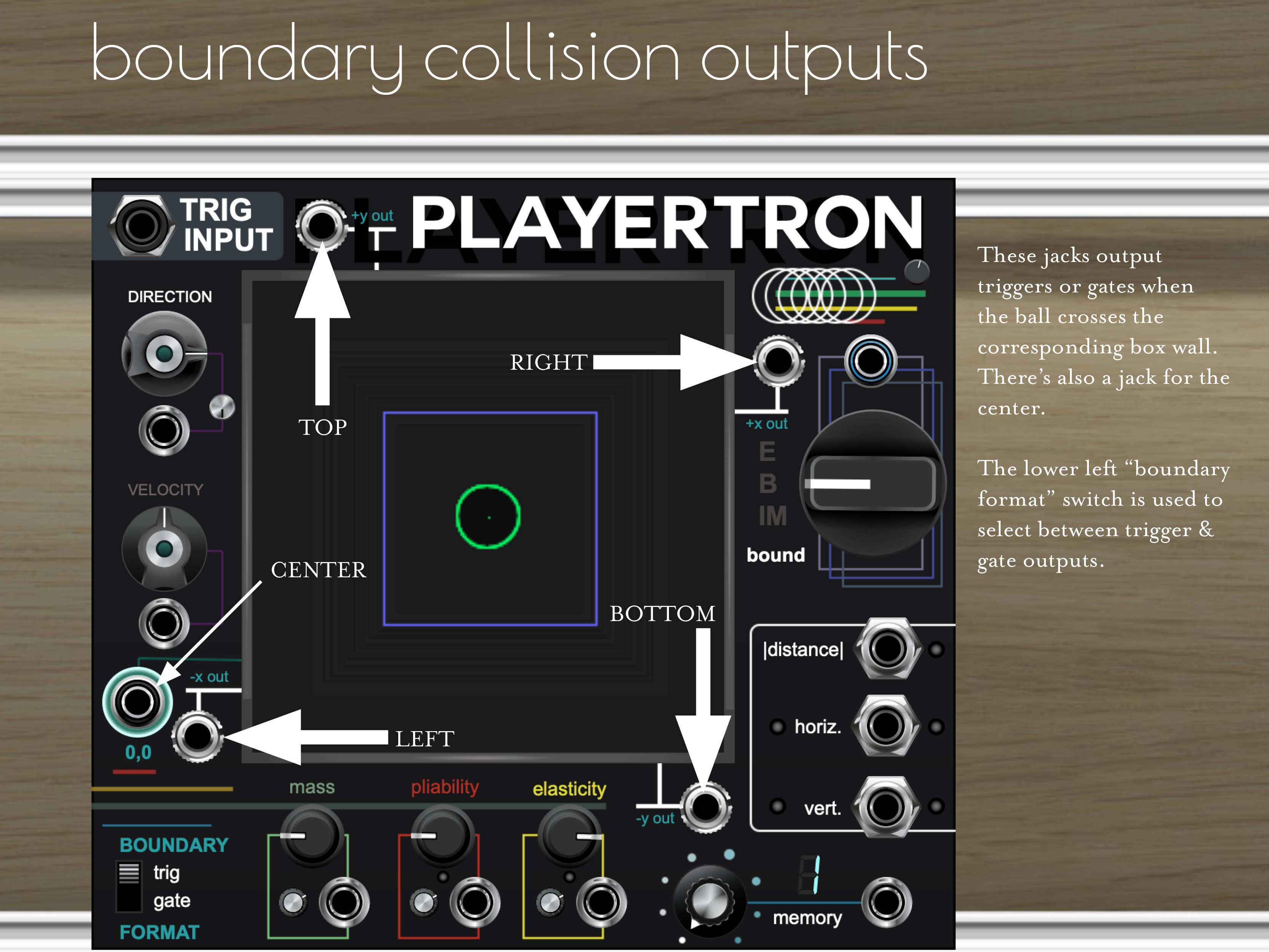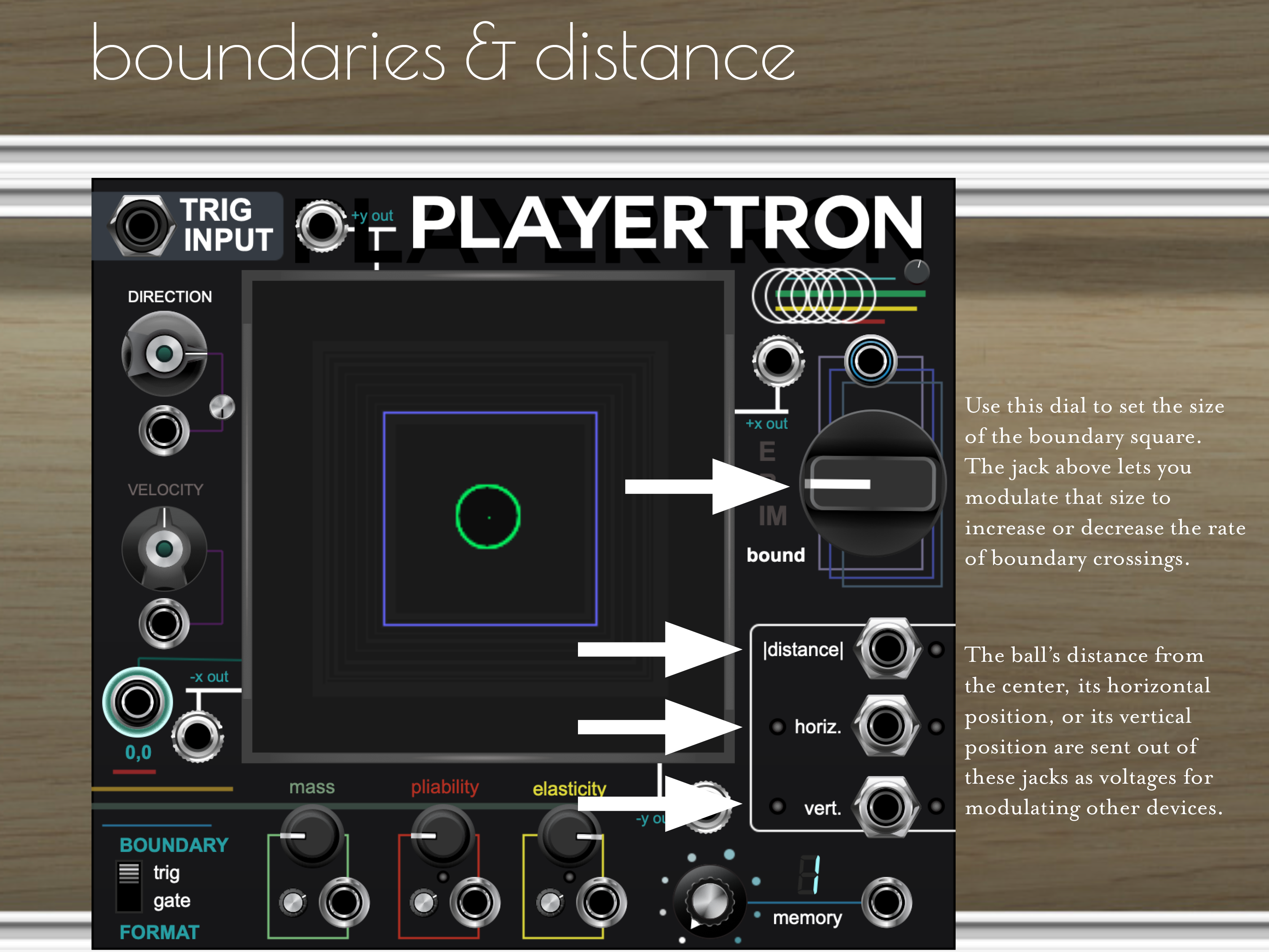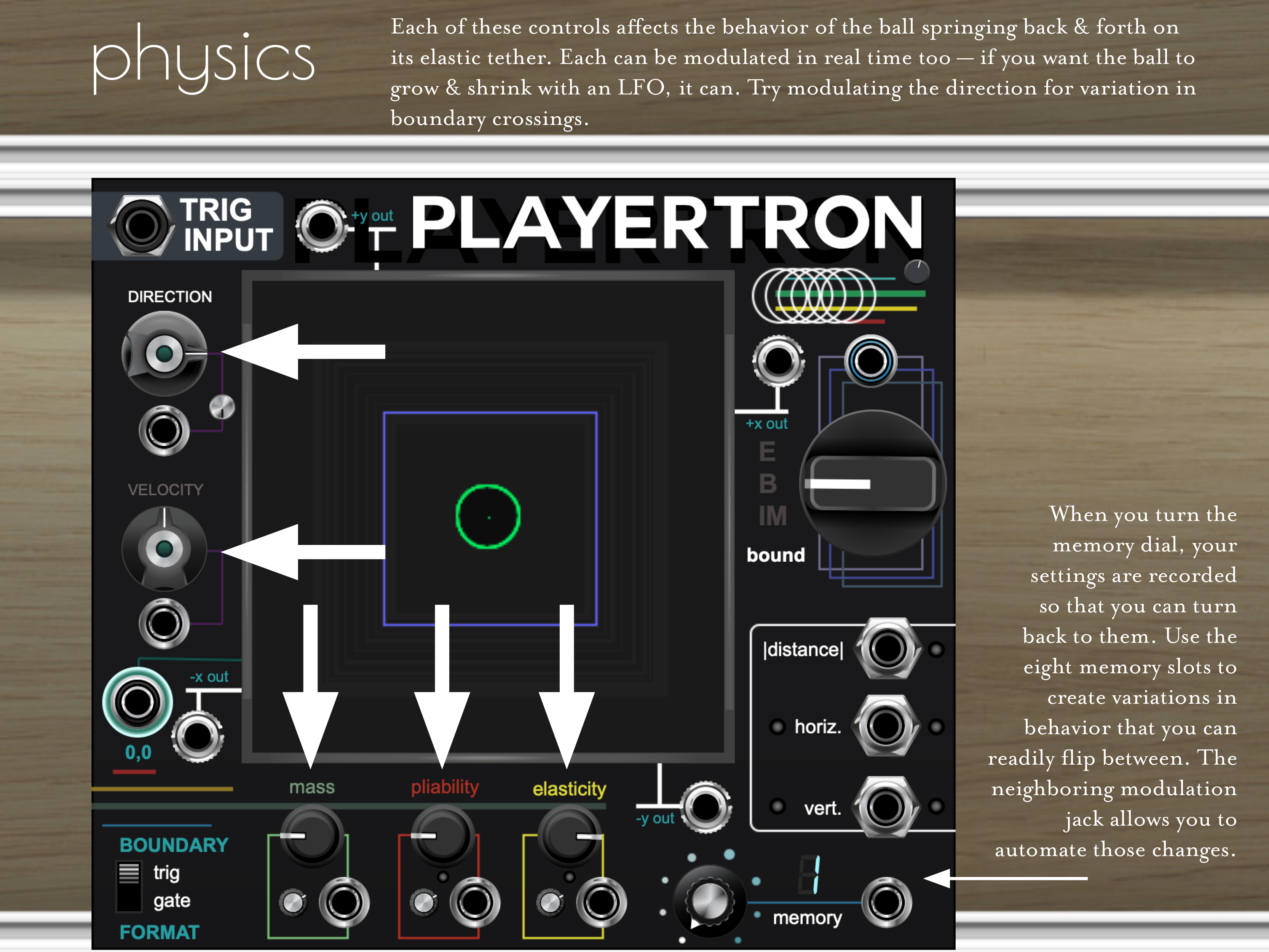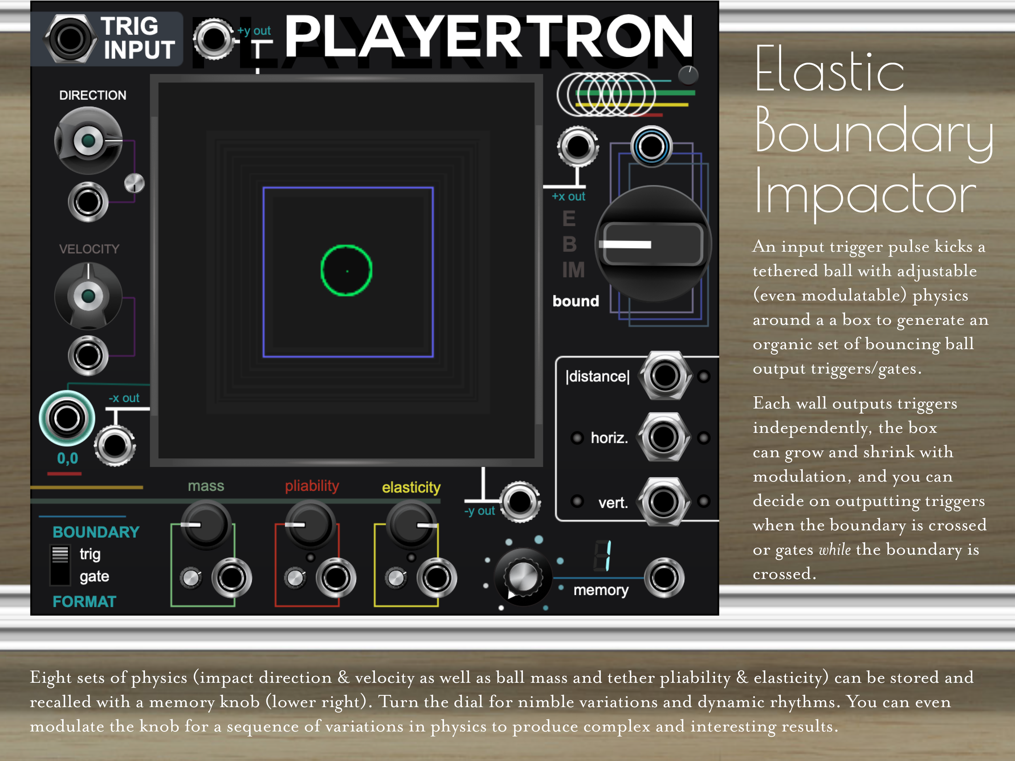 Use trigger pulses to hit a tethered ball – as its elastic snaps it back & forth, impacts with its square boundary are output as triggers/gates (1 for each wall + 1 for the center). The physics can be adjusted and modulated, which means that the ball can grow & shrink in mass while the boundary changes size and the elastic gets snappier or looser and the impact changes direction & velocity. A memory dial can store 8 sets of physics that you can deploy quickly with a turn of the knob. The ball’s distance from center, horizontal position, and vertical position can also be used to modulate other devices.