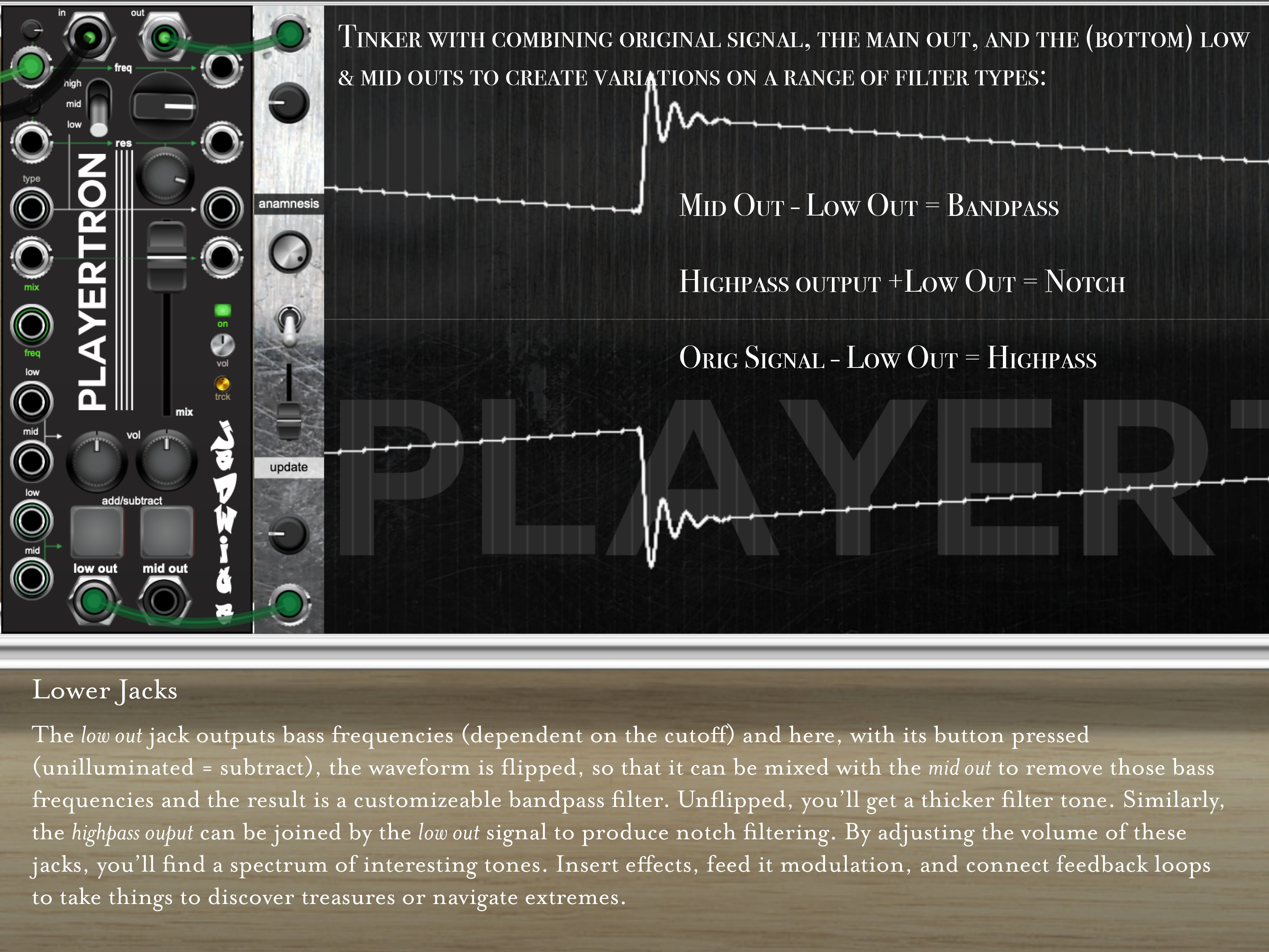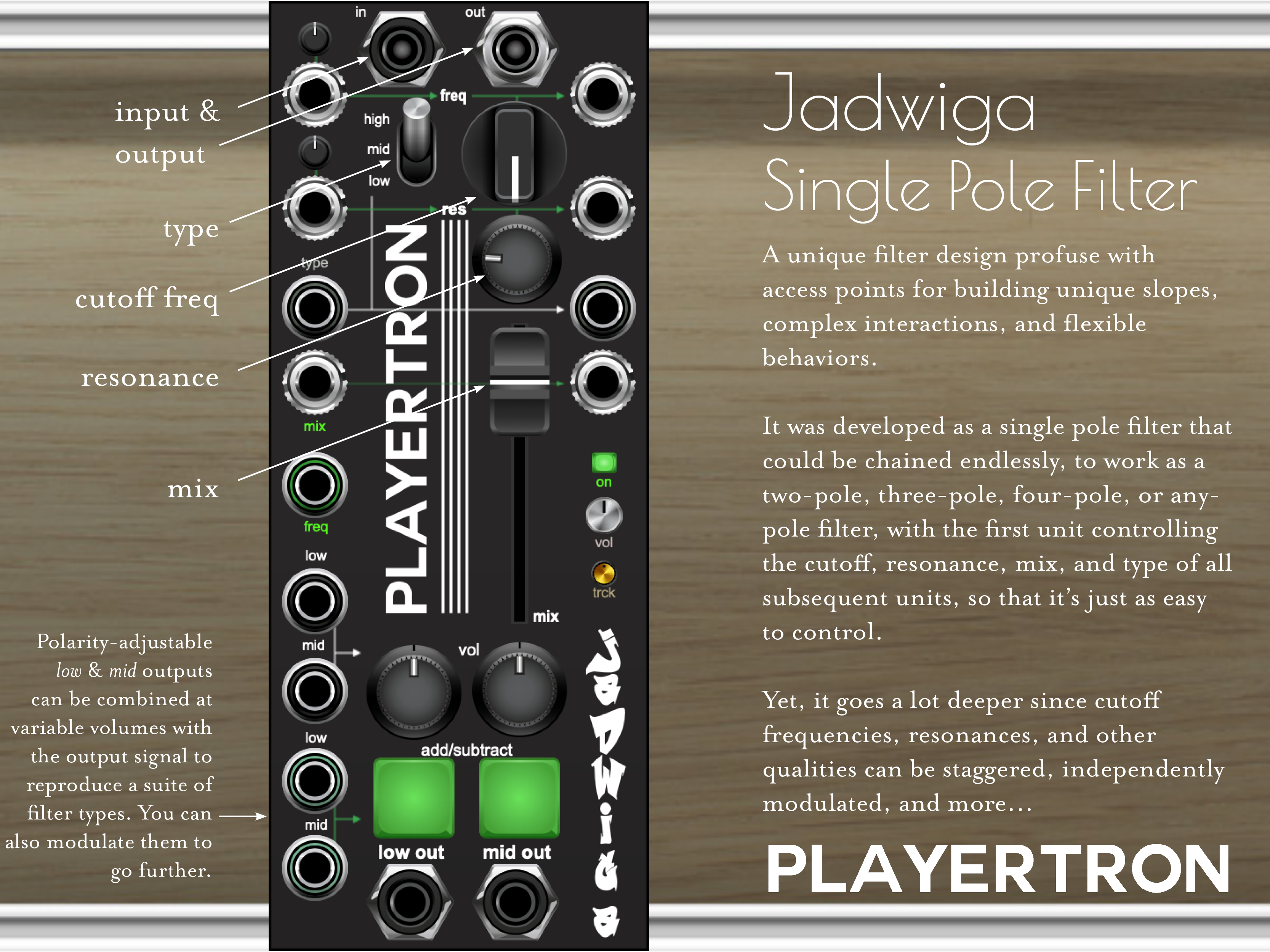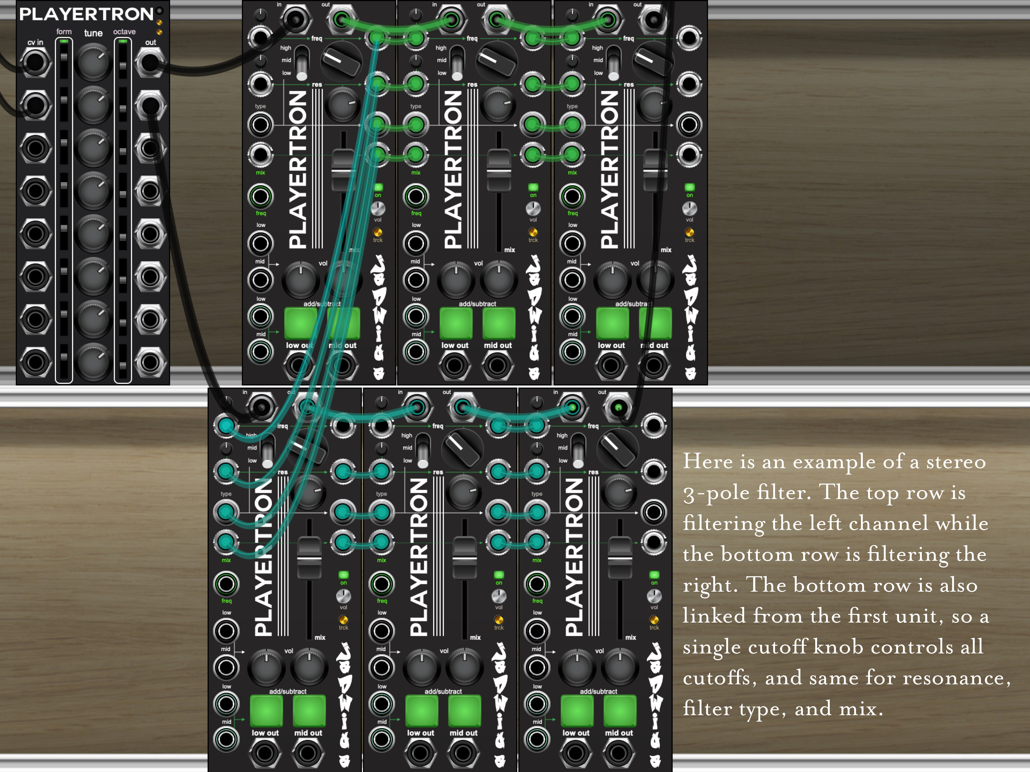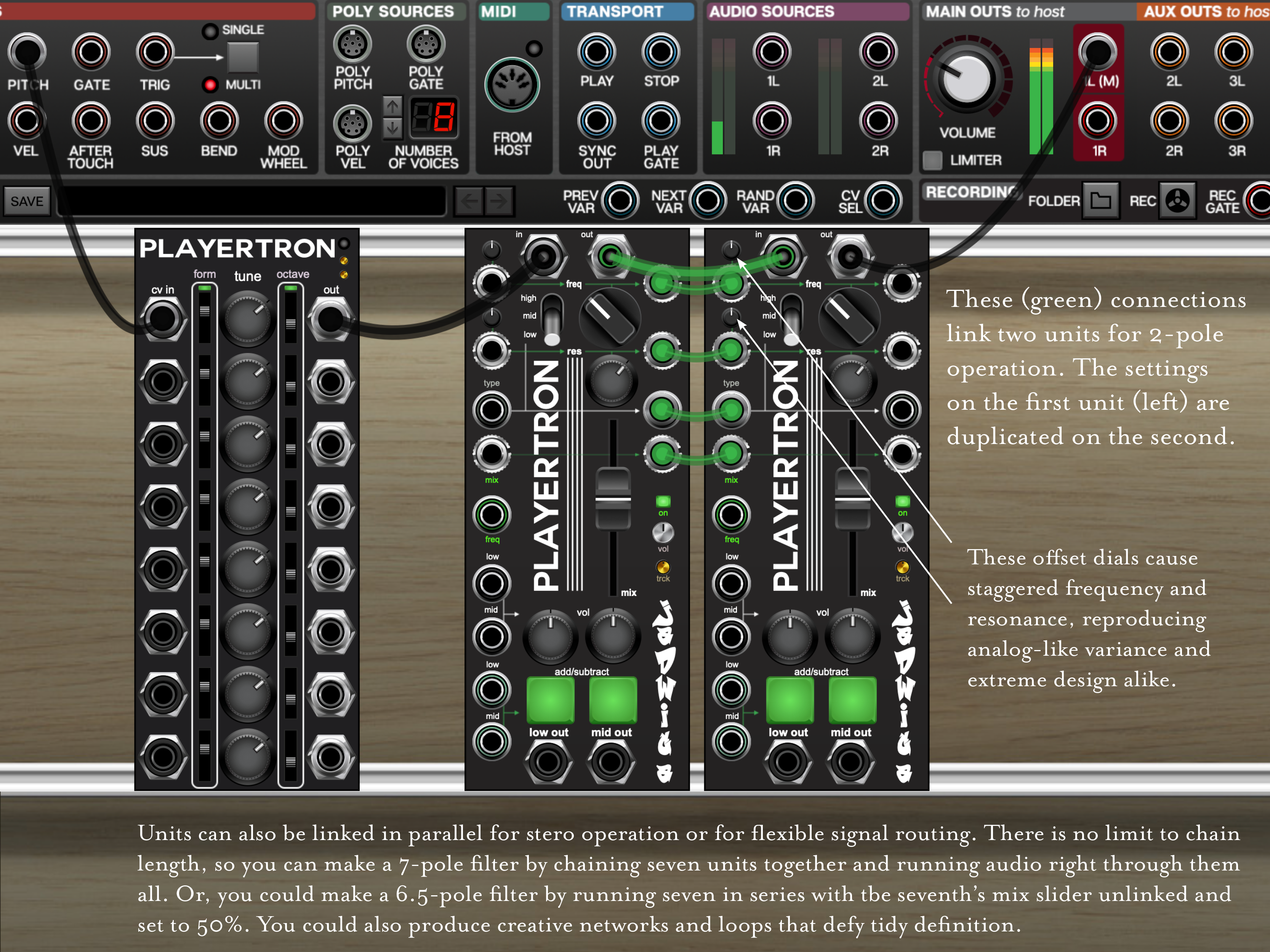 It was developed as a single pole filter that could be chained endlessly, to work as a two-pole, three-pole, four-pole, or any-pole filter, with the first unit controlling the cutoff, resonance, mix, and type of all subsequent units, so that it’s just as easy to control.