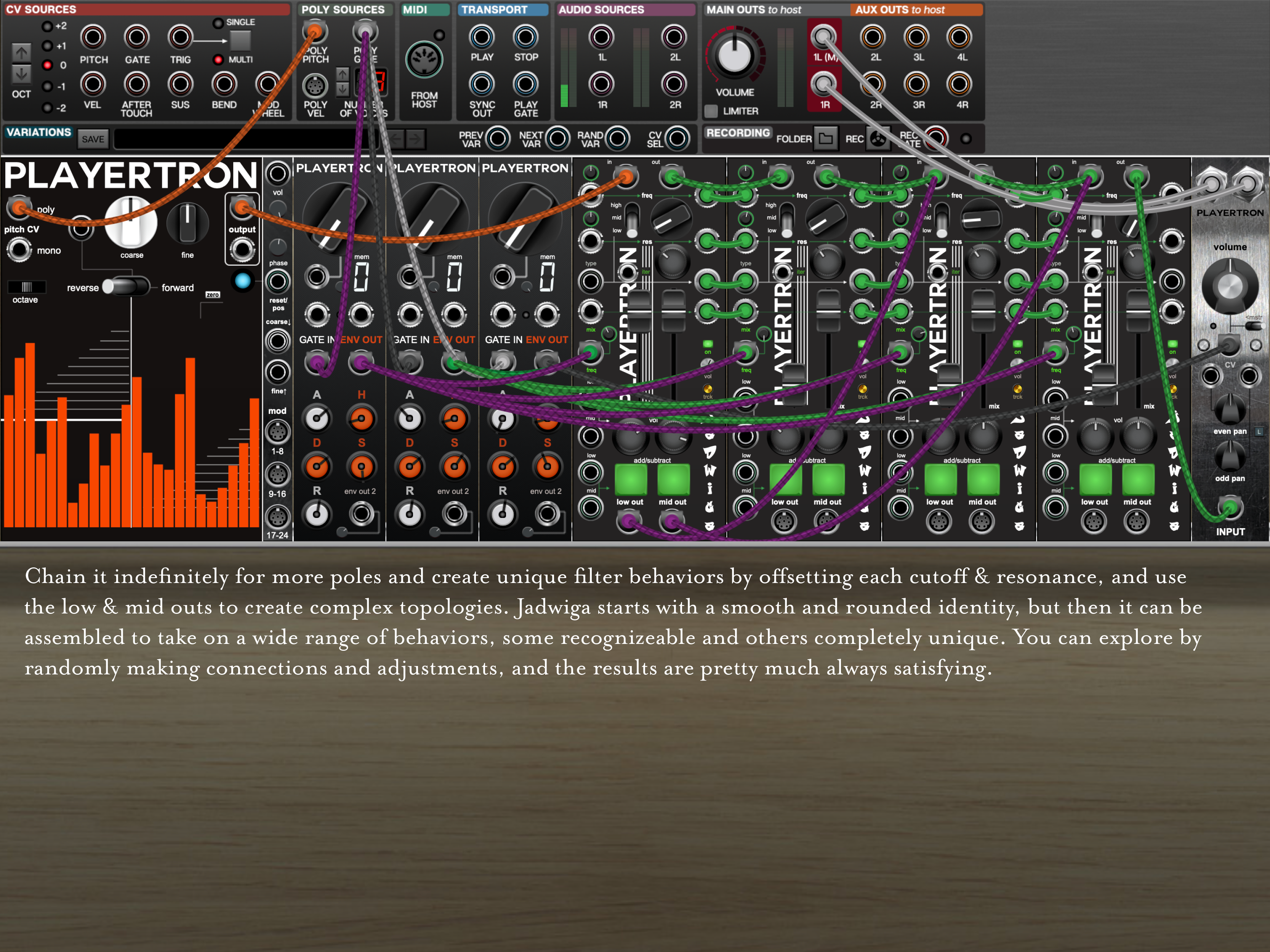 This is the polyphonic version of the Jadwiga, a unique filter design profuse with access points for building unique slopes, complex interactions, and flexible behaviors.