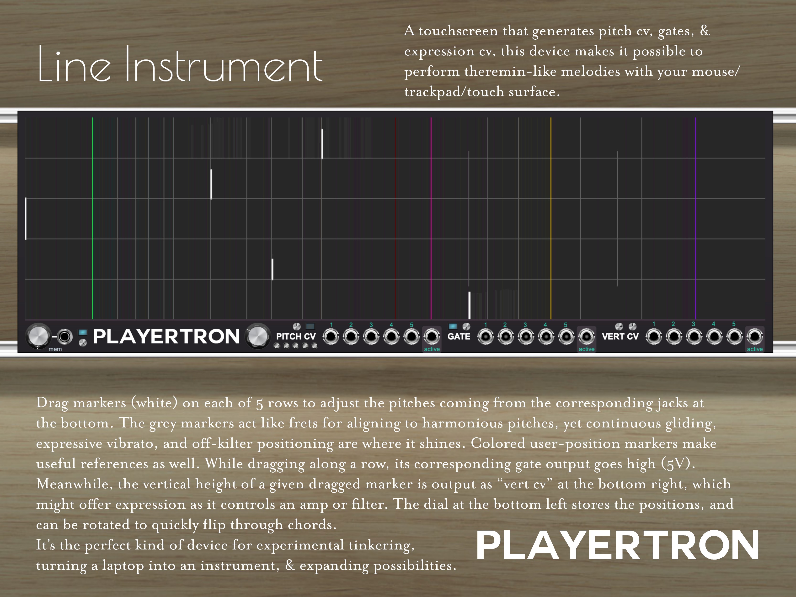 Operating like a touchscreen theremin and fretless guitar neck, the Line Instrument is a controller for performing with your trackpad/mouse/touch surface. As you drag across its screen, continuous pitches are generated as well as a gate signal to control oscillators and envelope generators. The vertical position of your mouse generates cv output too, offering additional expression.