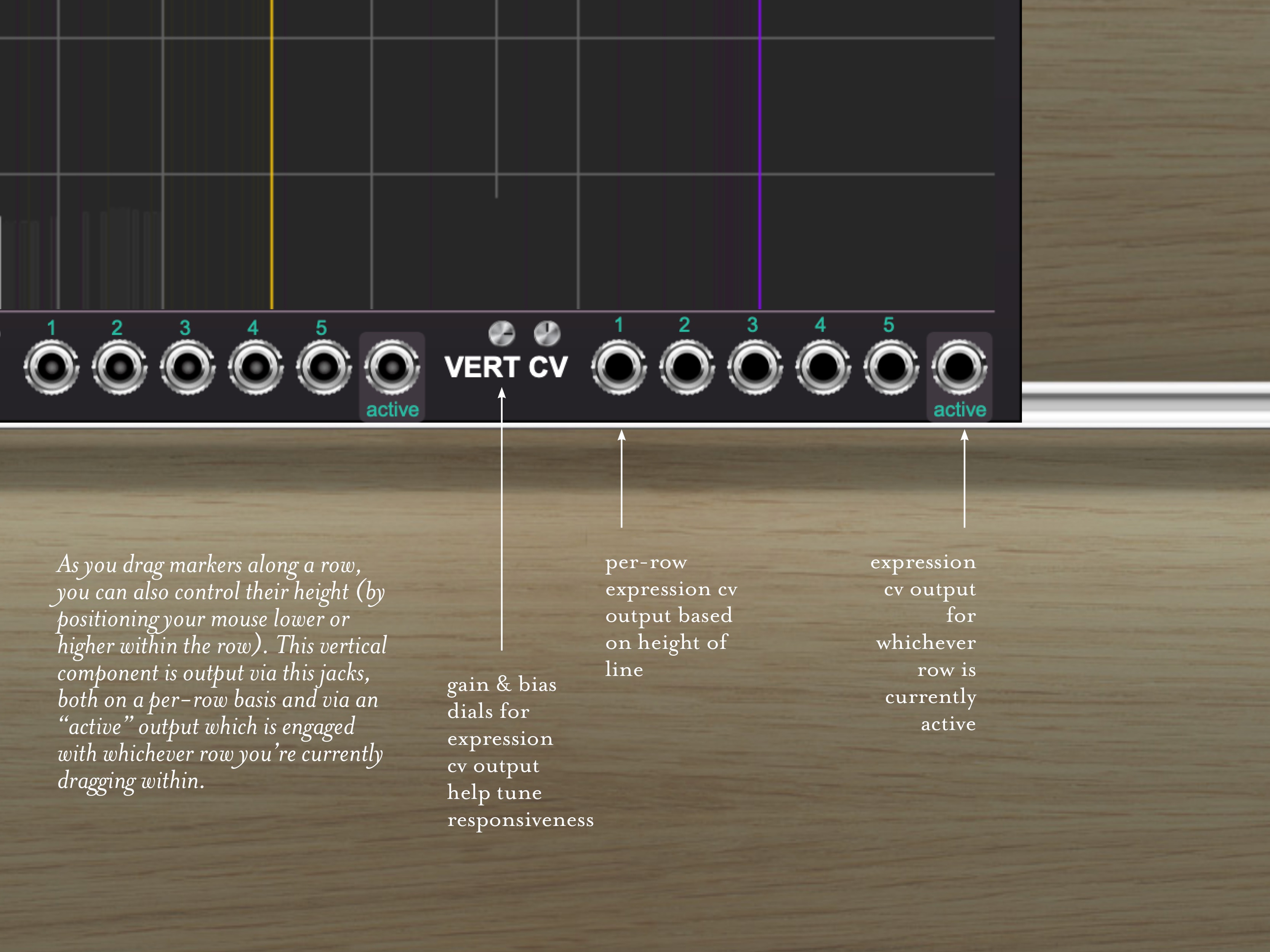 The gate outputs are likewise both individual (1 per row) and collected into an “active” output which sends a gate while you’re actively dragging on any row. The “vert CV” section outputs a CV signal corresponding to the vertical location, within a row, where you are dragging. These outputs are again both individualized for each row and collected into an “active” output.
