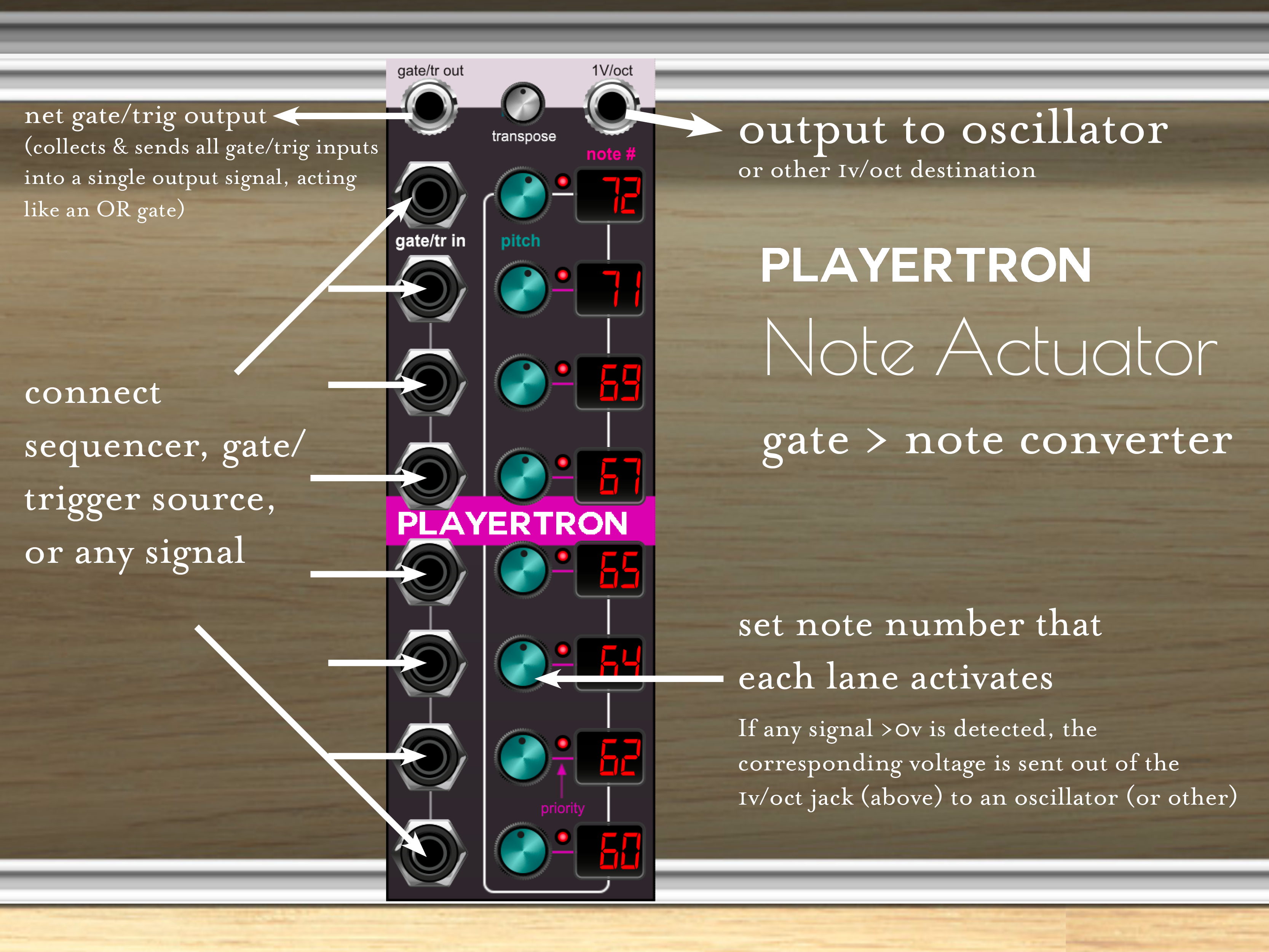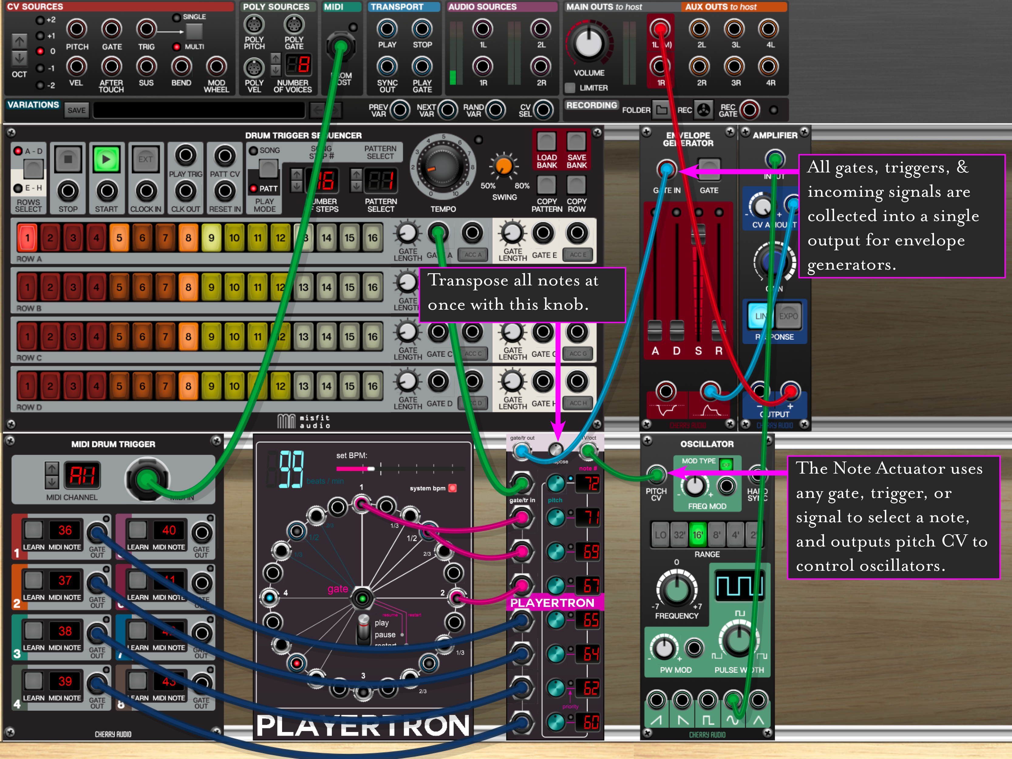 Use the Note Actuator to link oscillators to rhythm sequencers, to find strange ways to create melodies from odd sources, to scan gates for anything active, and to generate notes from signals that were never intended to specify notes. It’s a lot of fun to use with the Cycle Sequencer too.