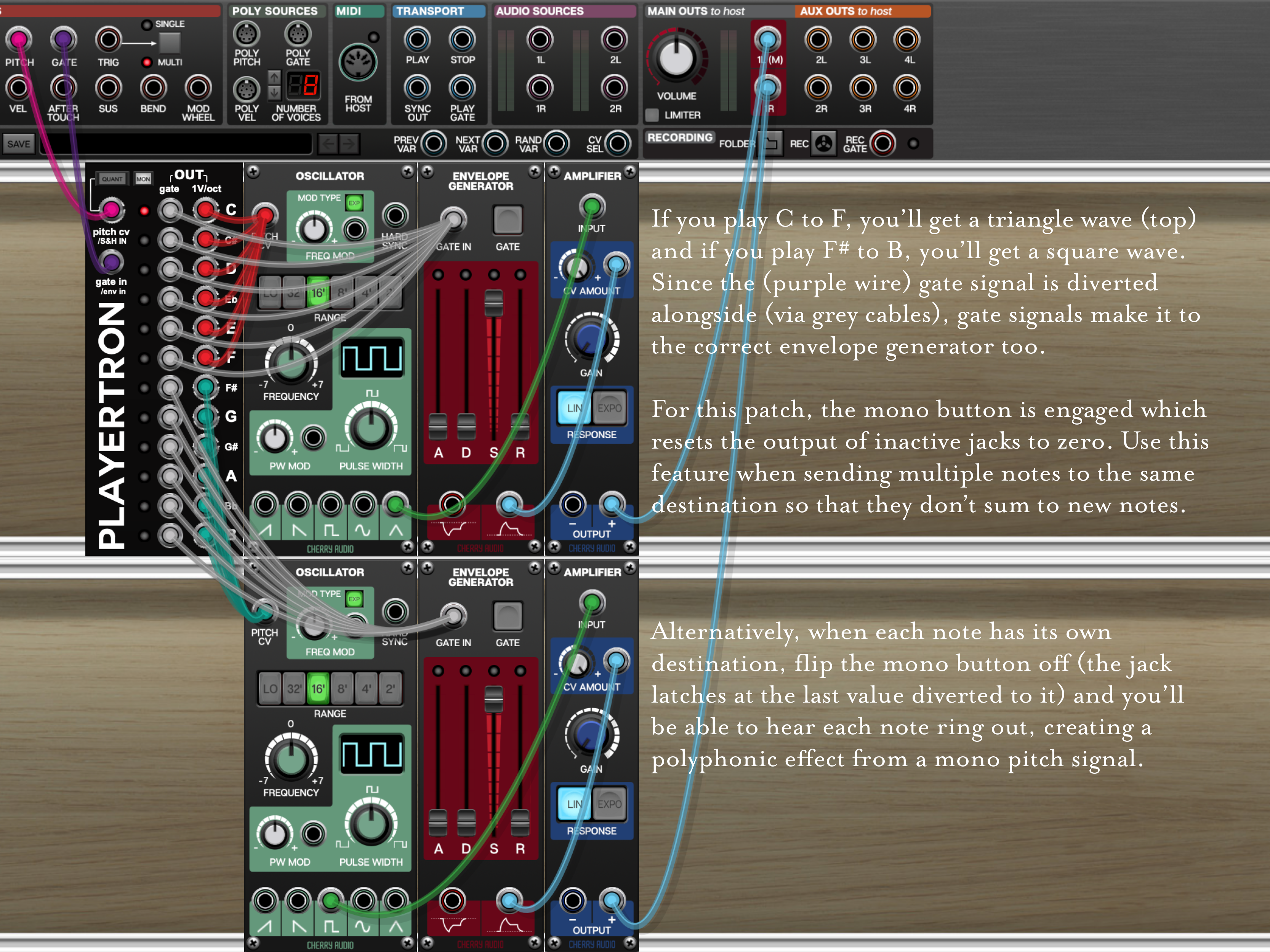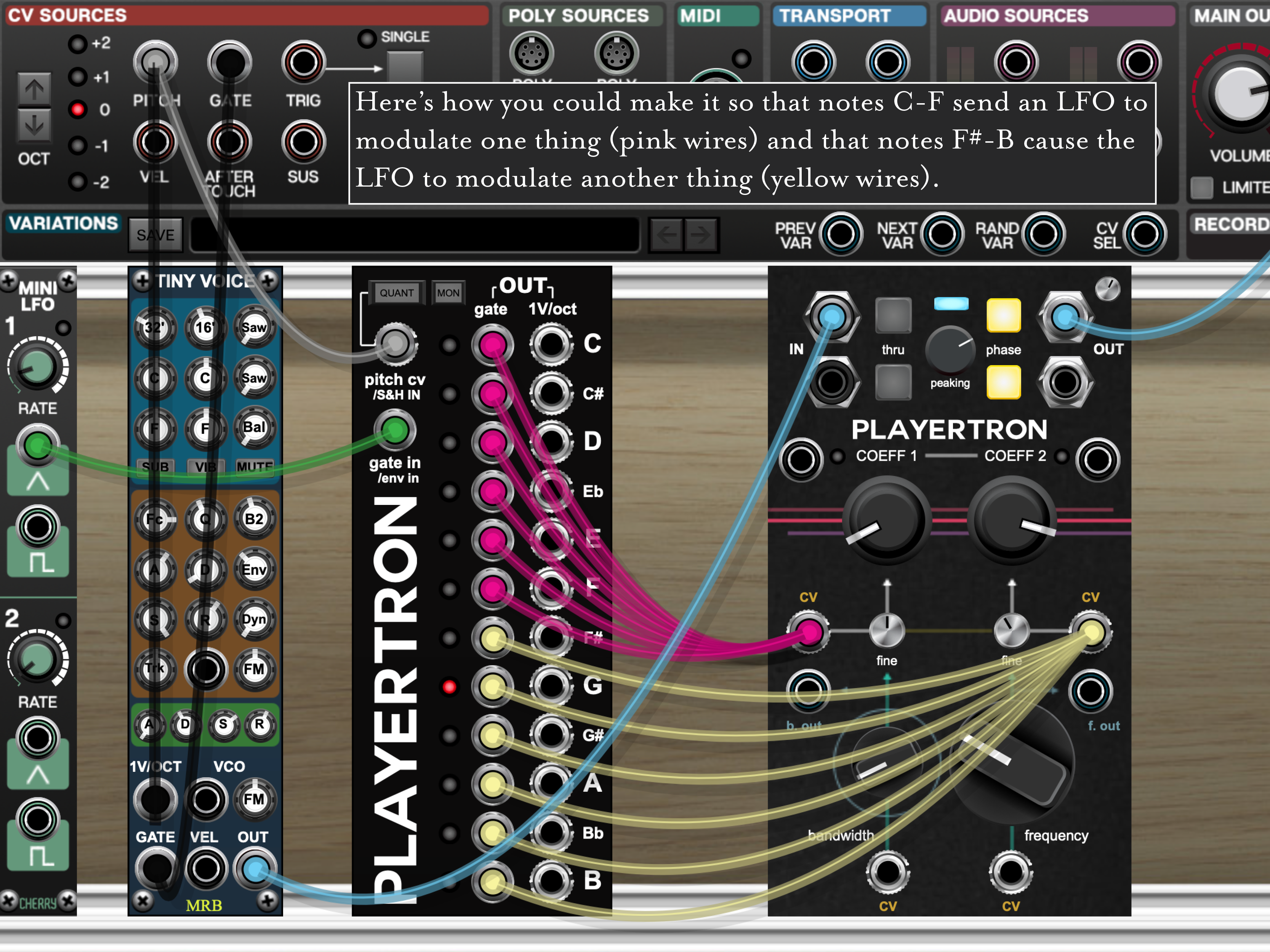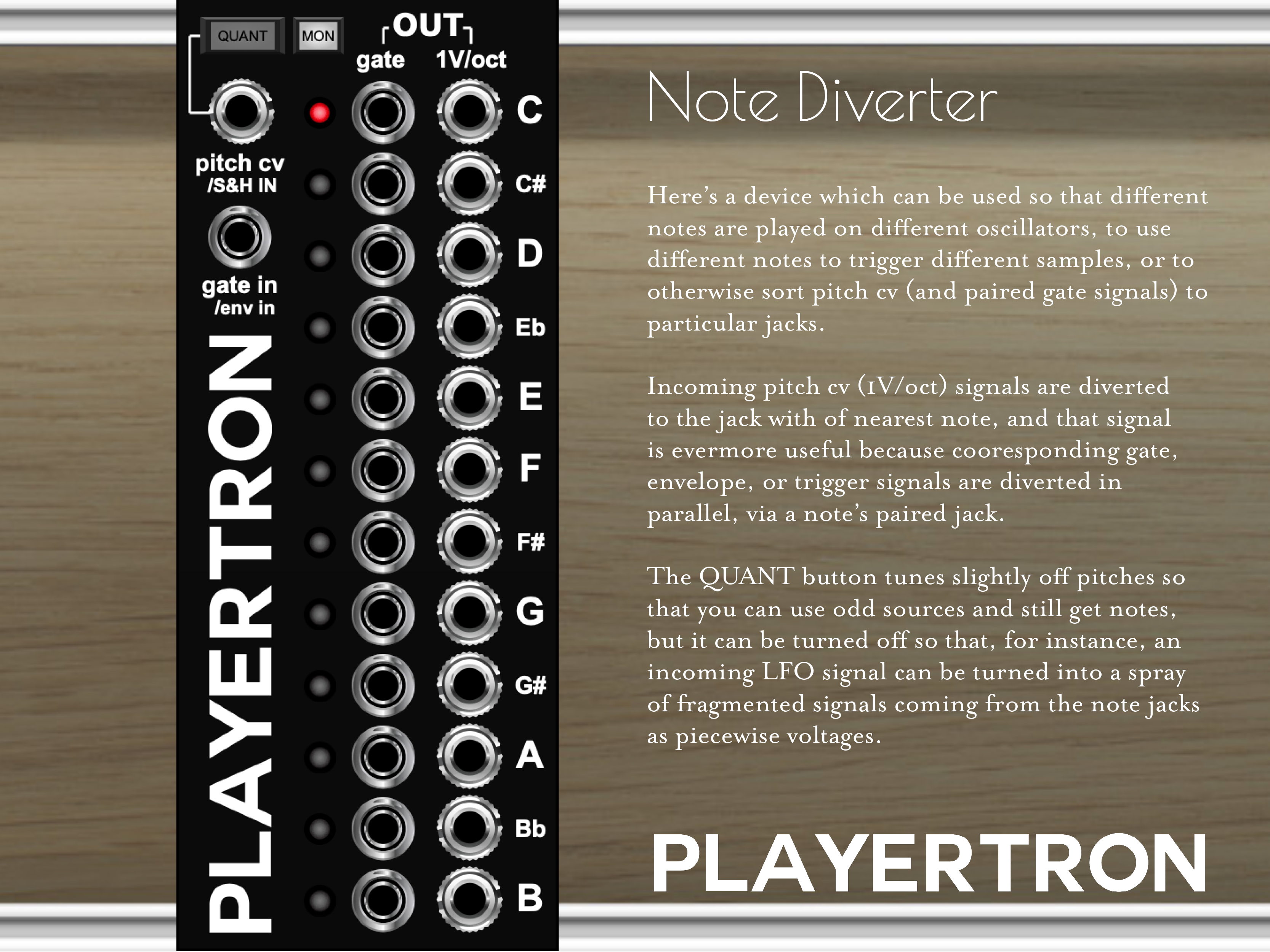 The Note Diverter sorts incoming pitch cv to the nearest note’s output jack. A secondary Gate In jack’s signal gets diverted along with the pitch signal to a paired jack. This means that you can give each note its own oscillator and downstream signal path, that you could use different notes to trigger other modules/samplers/etc, and that you can selectively choose notes to transmit while leaving unconnected notes ignored.
