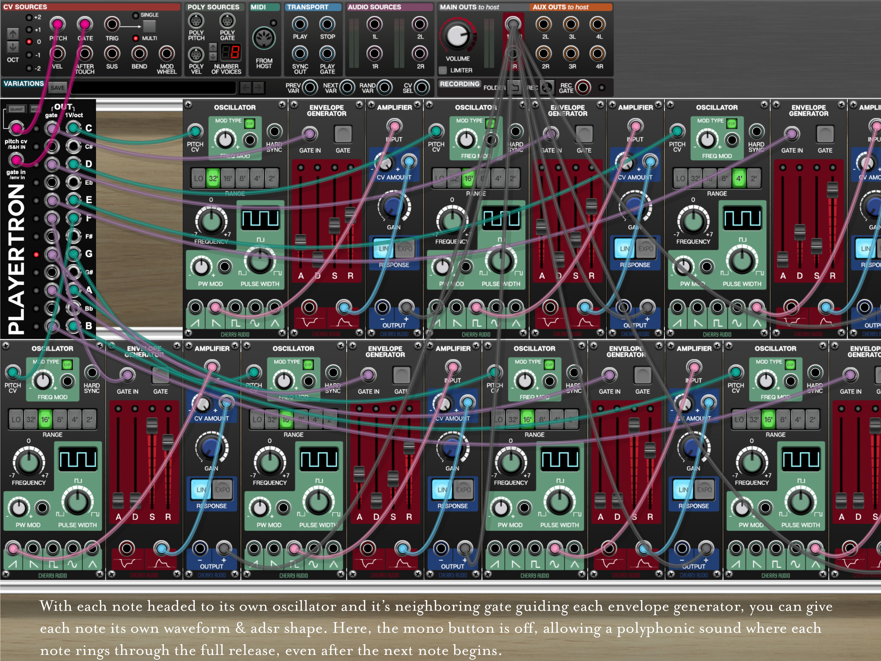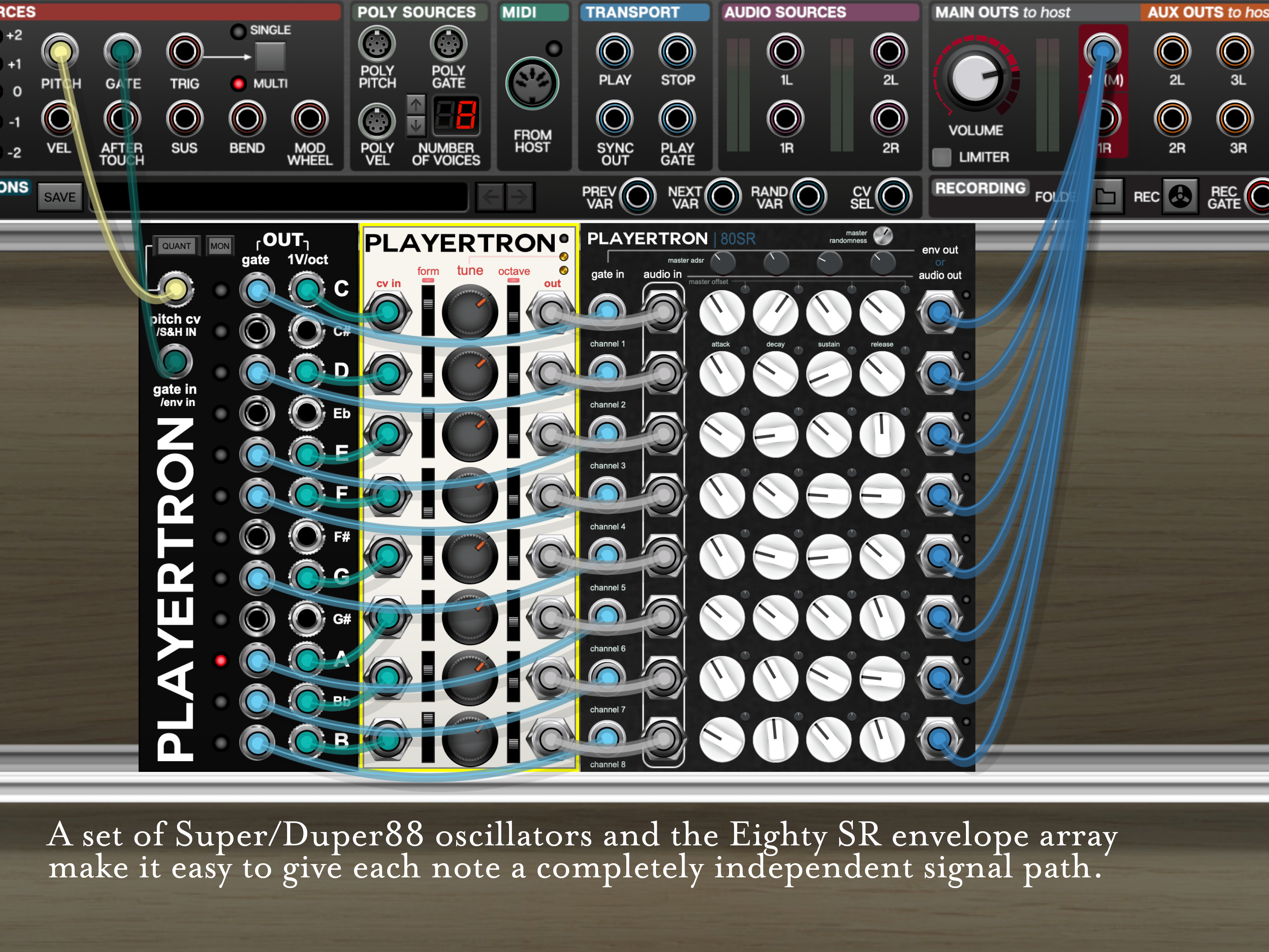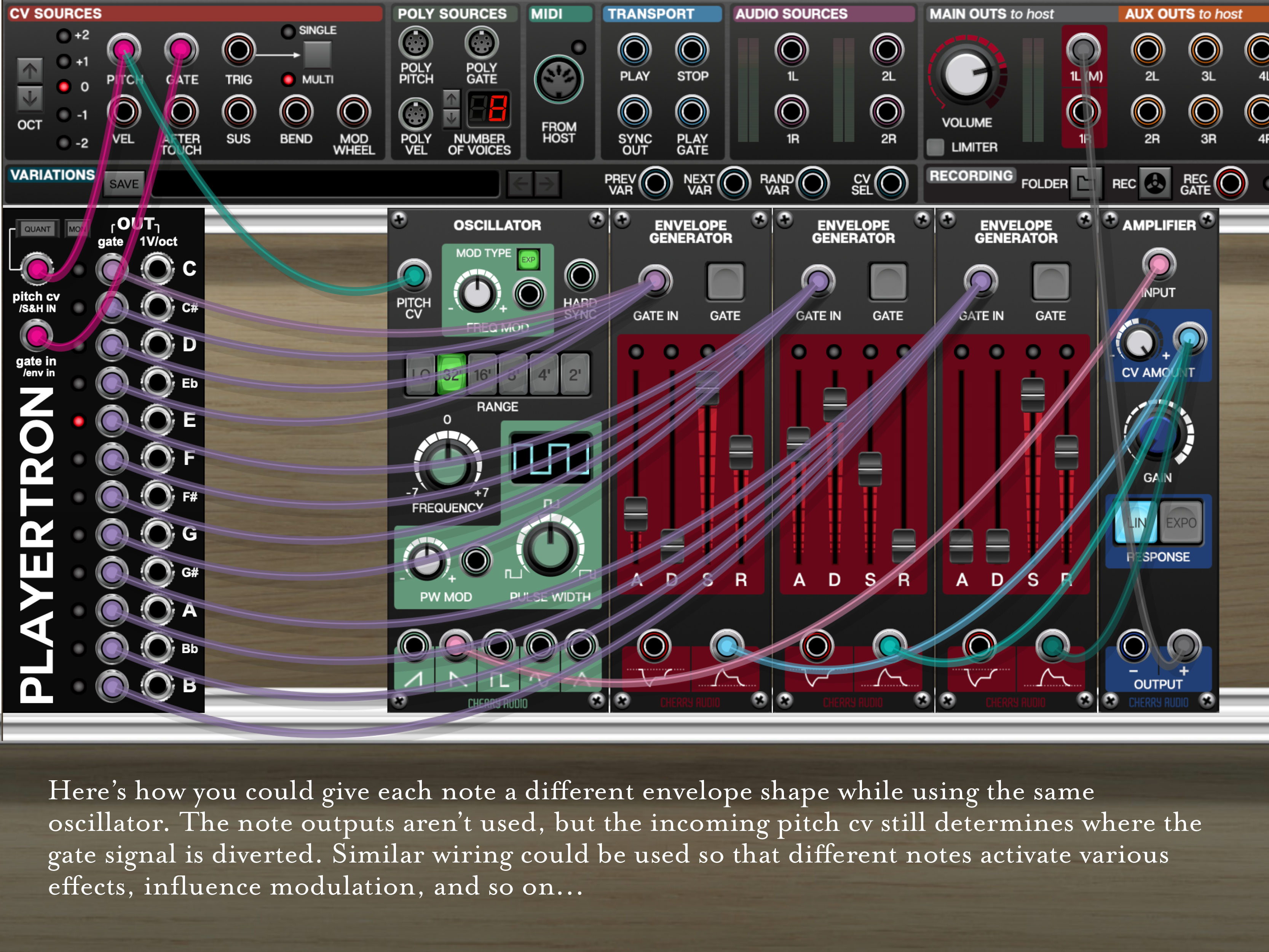 If the gate input is left unconnected, active gate output jacks generate their own gate signal so that you can activate events from a keyboard or note sequencer. Or, other signals can be fed, such as an LFO so that it can be connected to different devices on a per note basis, modulating filter frequency on a C or pulse width on a D for instance.