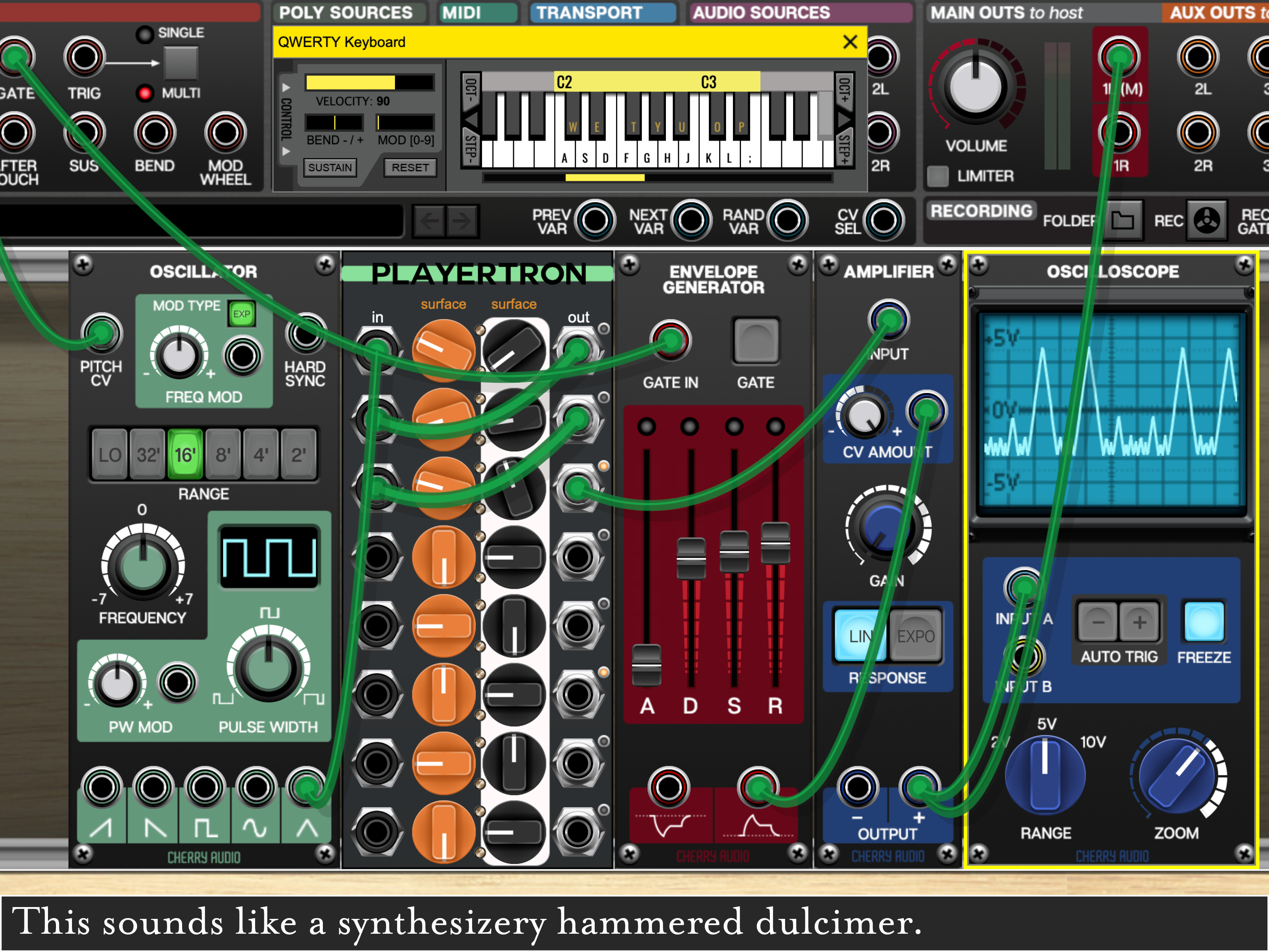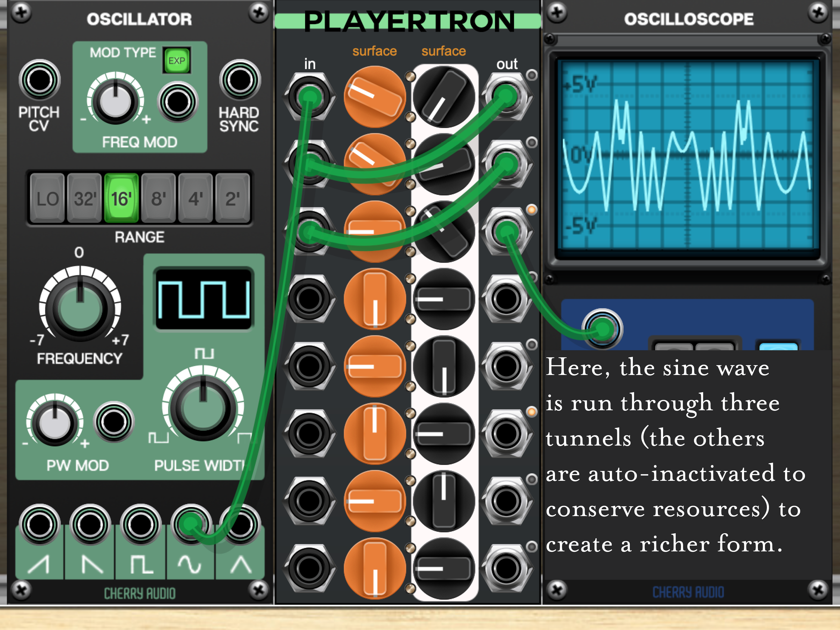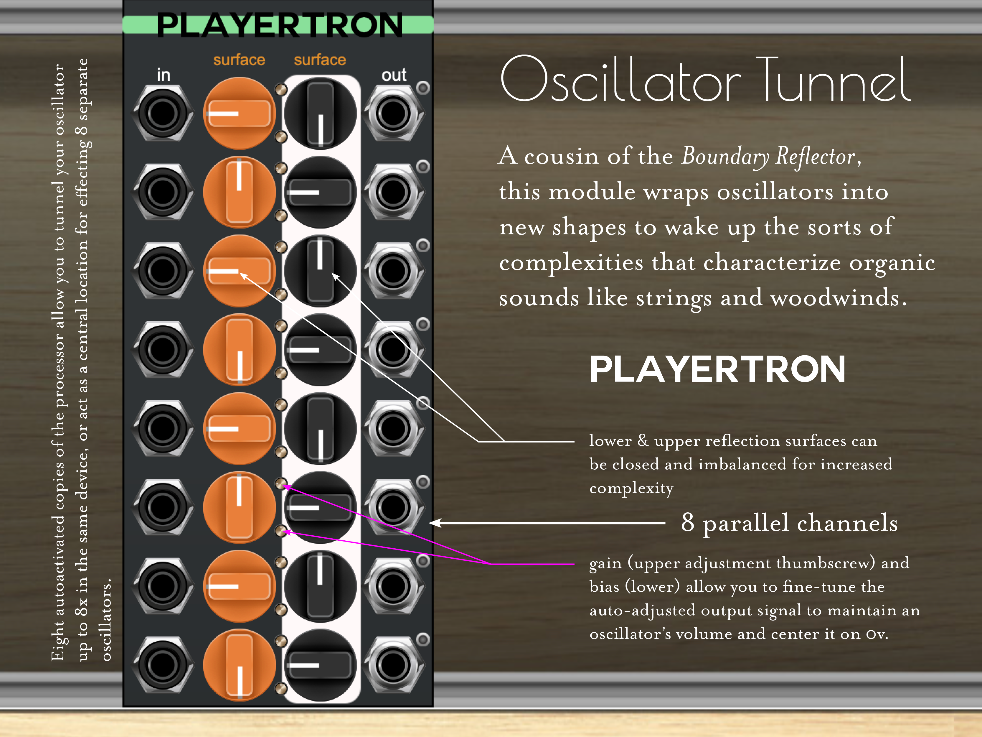 Wrap oscillators into new forms for the complexities of strings and woodwinds, with the character of synthesis. The Oscillator Tunnel acts as a sort of light tube of sound, adding a little deterministic chaos through simple reflections upon a waveform. This cousin to the Boundary Reflector prioritizes audio output, and offers controls for re-centering outputs and managing amplitude, with a little touch of automation in the right direction, so that the results cooperate with your mix. Multiply that by eight channels for parallel processing and/or convenient reprocessing, and you have a useful tool for coaxing your oscillators into new spaces.