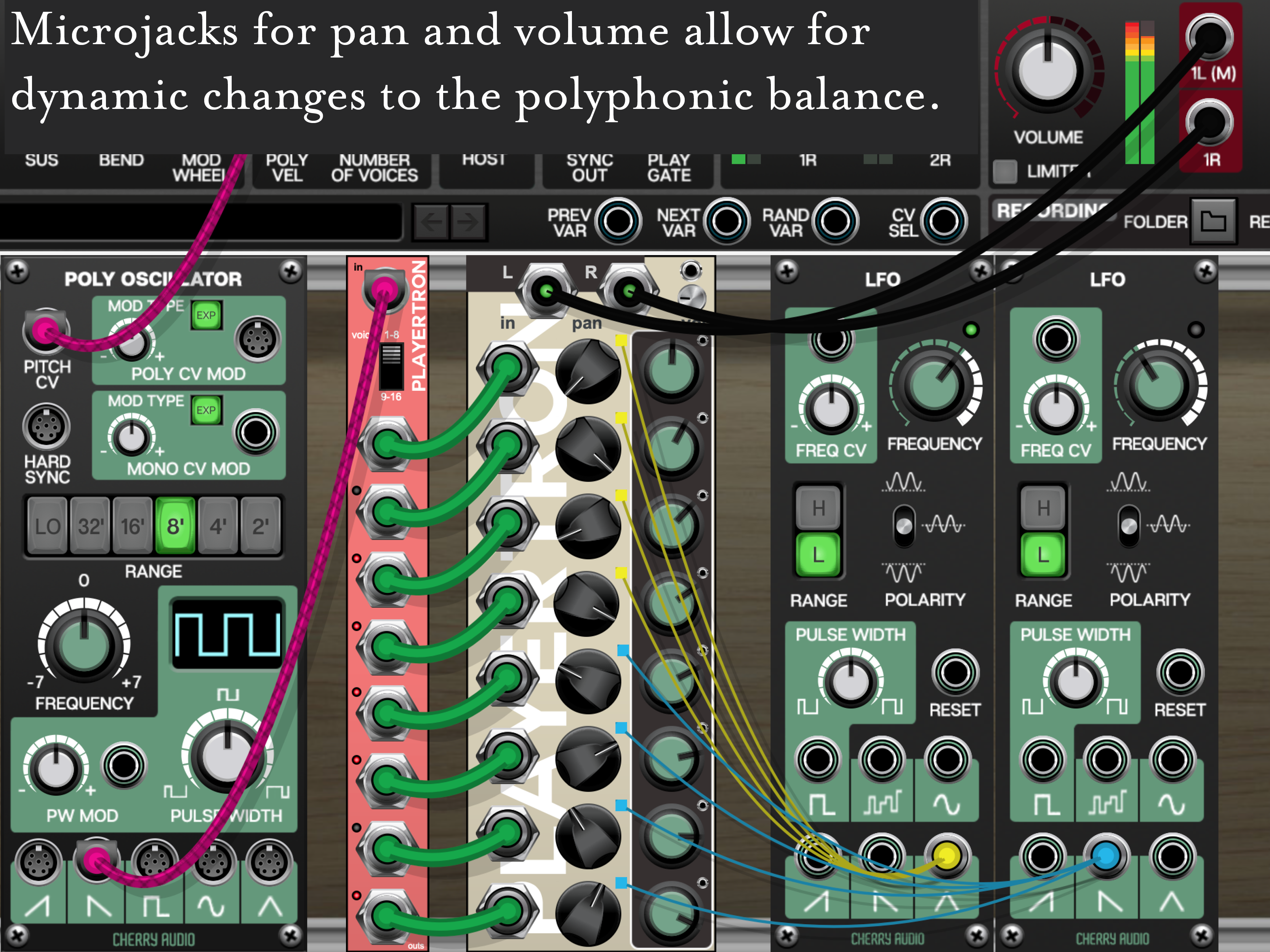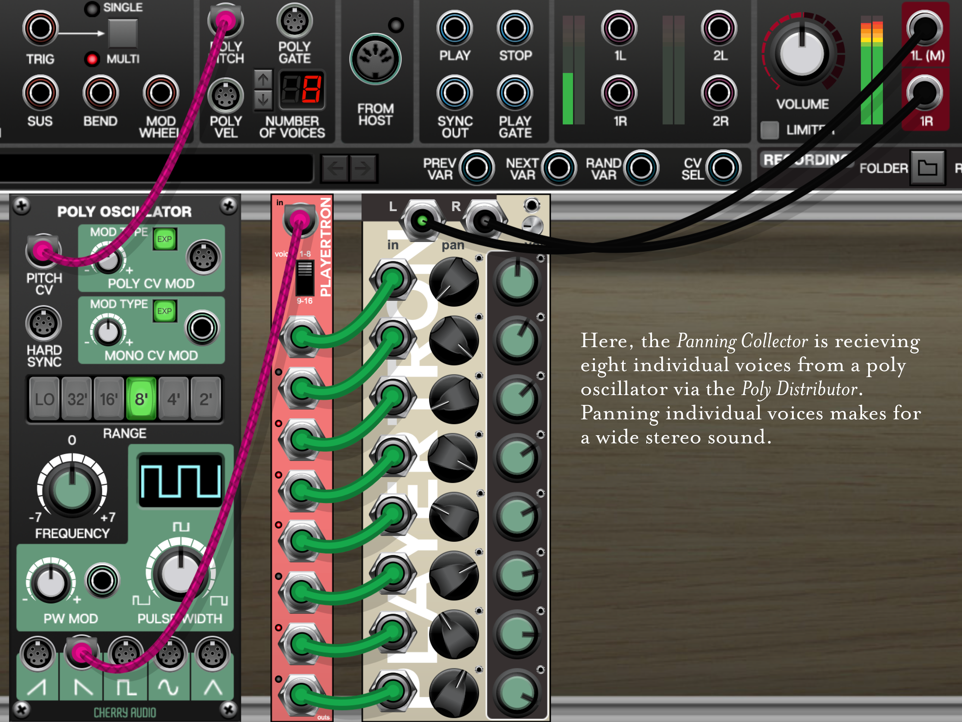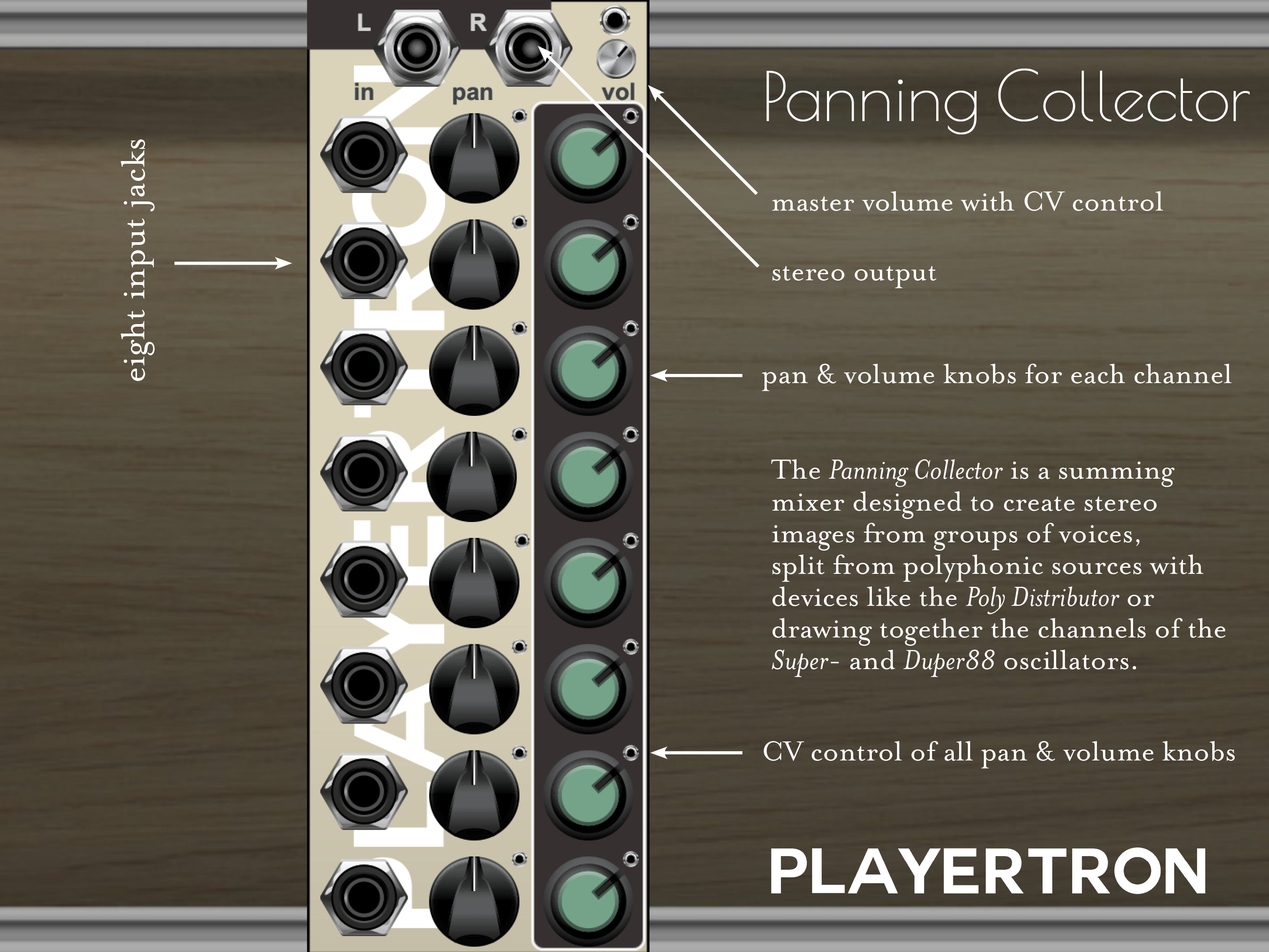 An eight channel summing* mixer with CV controlled panning and volume, the Panning Collector is designed for stereo imaging from mono sources. CV microjacks keep the footprint small, and they can be connected to regular jacks, all the same as usual. Use this device to create wide sounds, to place sources in space, to spread polyphonic voices (try it with the Poly Distributor), and for automating dynamic mix changes. It also makes an excellent partner for the Super- and Duper88 oscillators, granting you the opportunity to adjust the panning and volume of individual oscillators, and add the 80SR, Filtrate, and Poly Distributor to make a full polyphonic synthesizer with individualized voices (an 8x LFO unit is on the way too).