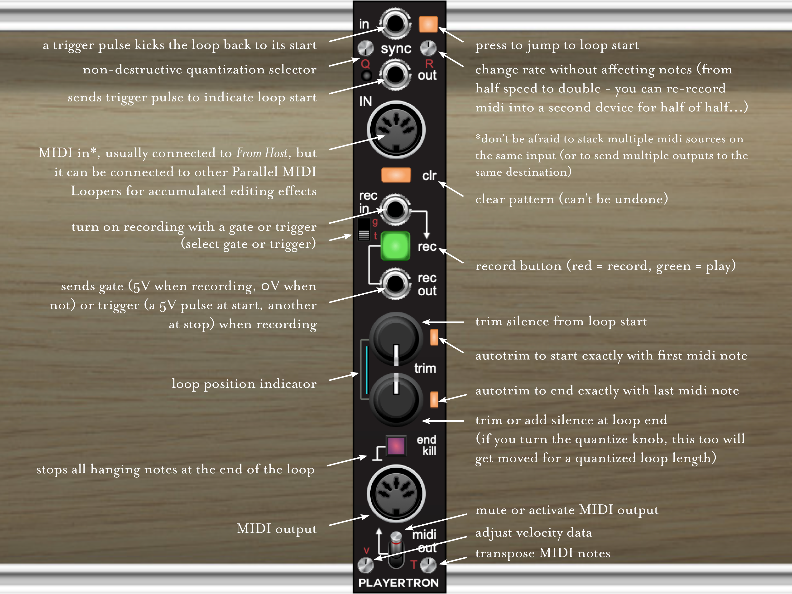 Loops can be synced via a trigger pulse that kicks it back to the beginning, with a sync out for sending the same such pulse to other devices, perhaps more MIDI loops. Loop lengths can be trimmed with dials or auto-trimmed (neighboring orange buttons) to extract start or end silence. Recording can likewise be controlled via trigger or gate signals and likewise sends such signals of its status so that recorded loops can be the exact length of another sequence, with single sample precision.