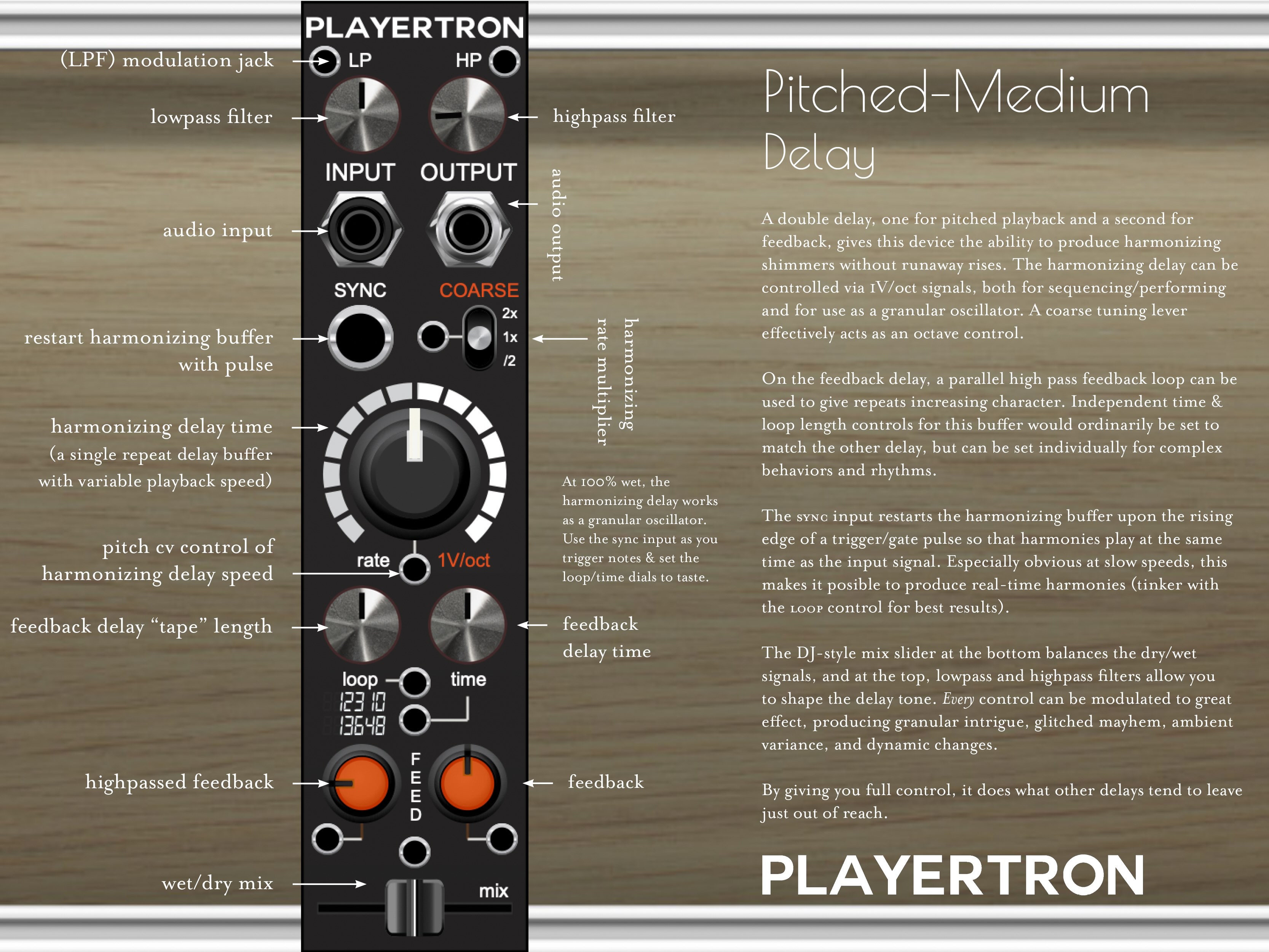A double delay, one for pitched playback and a second for feedback, gives this device the ability to produce harmonizing shimmers without runaway rises. The harmonizing delay can be controlled via 1V/oct signals, both for sequencing/performing and for use as a granular oscillator. A coarse tuning lever effectively acts as an octave control.