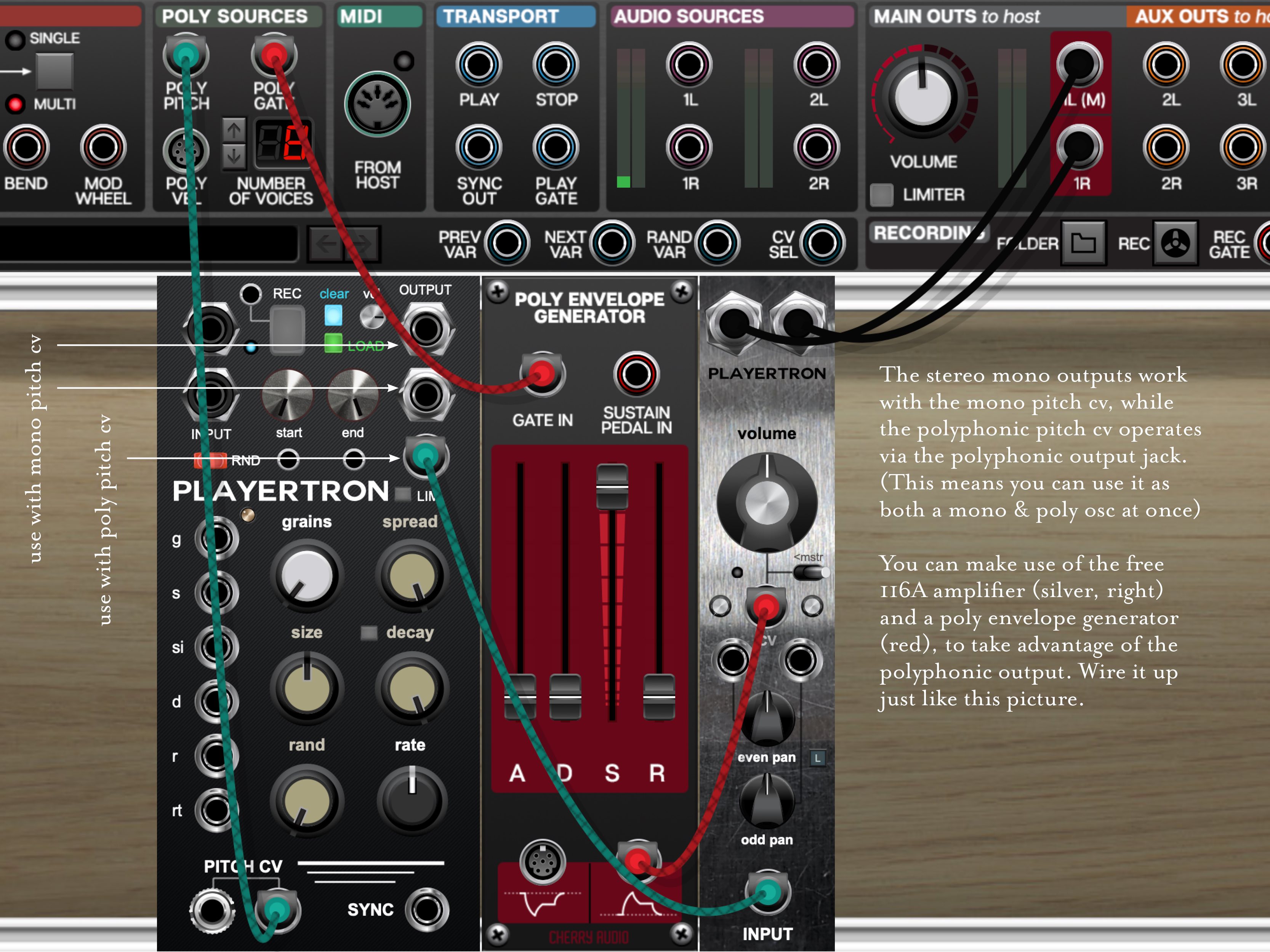 Modulatable start & end controls define slices, and can be backward for backward playback. The other cv-controllable dials stack, scatter, crossfade, and randomize grains for increasingly abstract sound. Mono & poly pitch-cv input sit side by side, as do mono & poly audio outputs, ready to adapt to your patch.