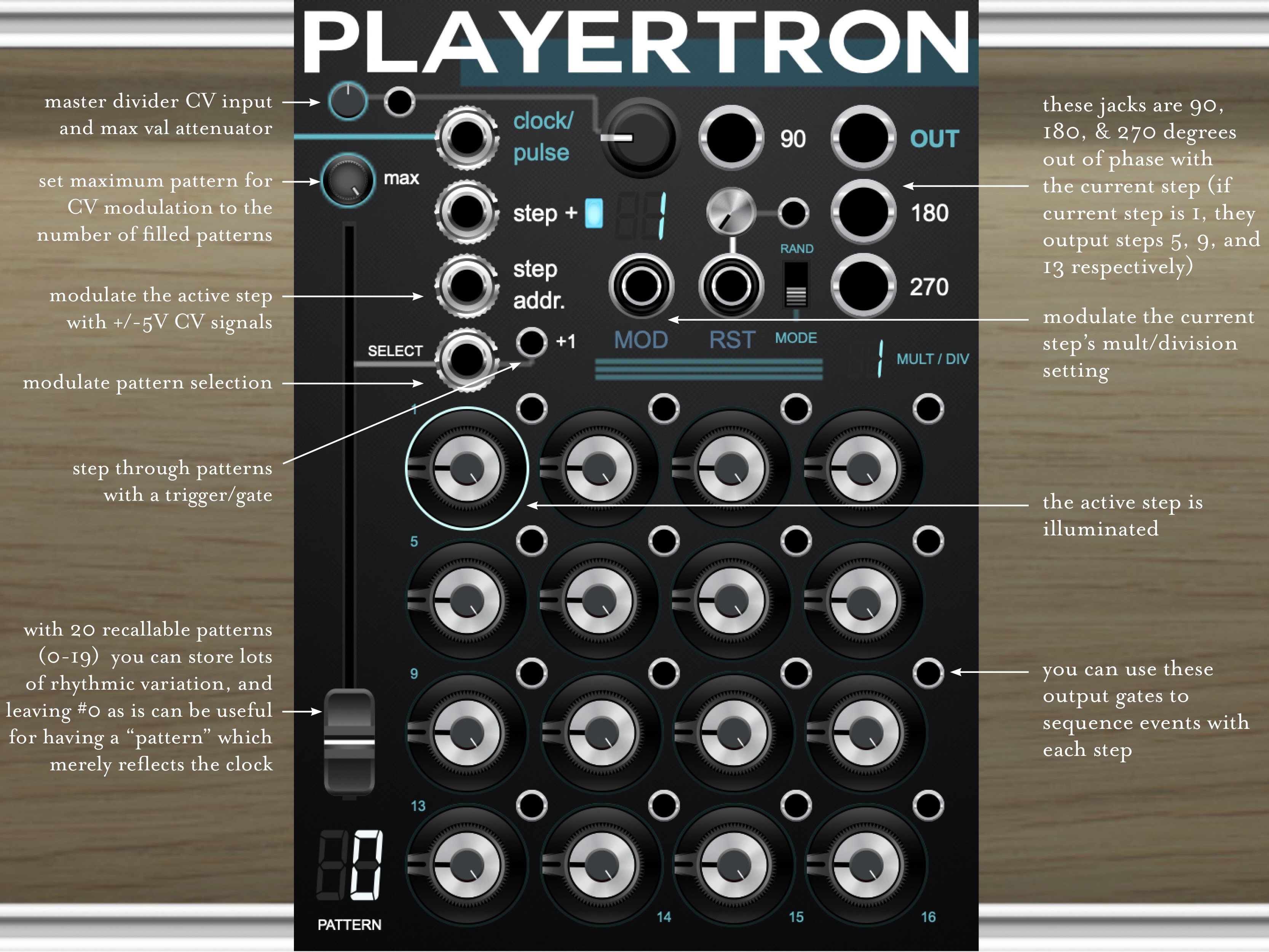 Also, there’s a pattern slider at the left, recalling entire sequences as you last left them, whenever you move it to a new position (0-19). It too can be modulated (SELECT jack), stepped through (+1 jack), and limited (max dial) to just those sequences you’ve made. The mod jack modulates the mult/div of the current step. The master clock divider (how many input pulses required to advance steps) is also modulatable (top-left).