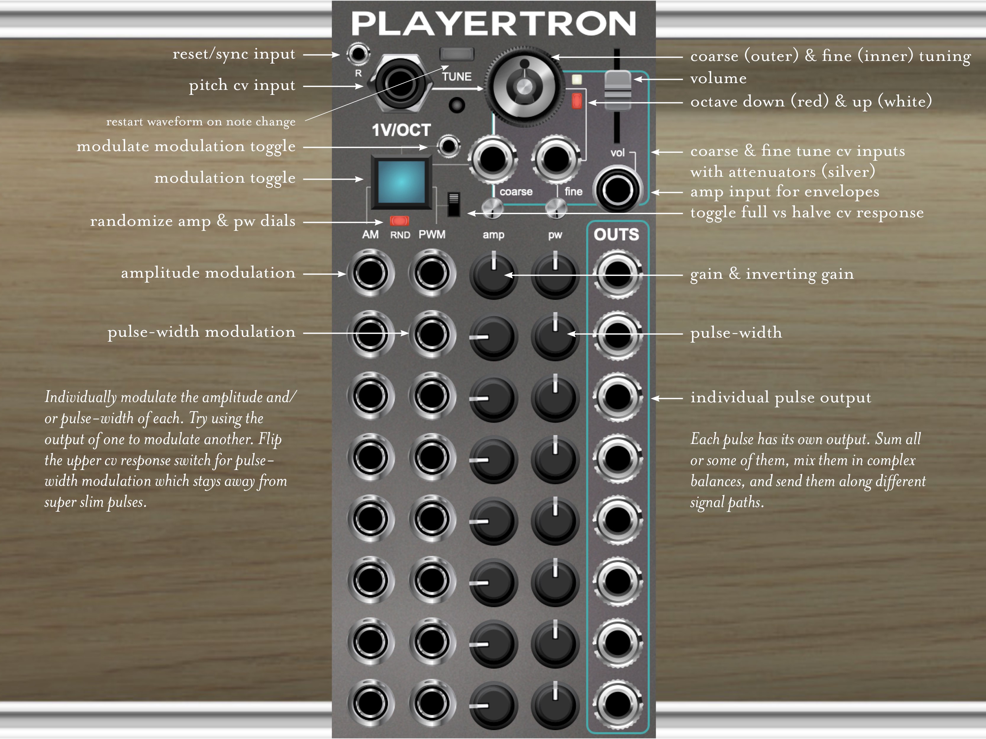 8 pulse waves have harmonic relationships to each other (and to the pitch cv input) and they have individual outputs. You can sum these (simply connect them to the same destination) to produce a full waveform. You needn’t use all of them, and you can individually vary their pulse widths and amplitudes (which can be negative) via the onboard dials or via CV. A RND button (red) lets you randomize the settings for quick exploration, and the big blue button lets you shut down the modulation when you need to get a hold of things. At default settings, the outputs sum to produce something of a stepped saw wave.
