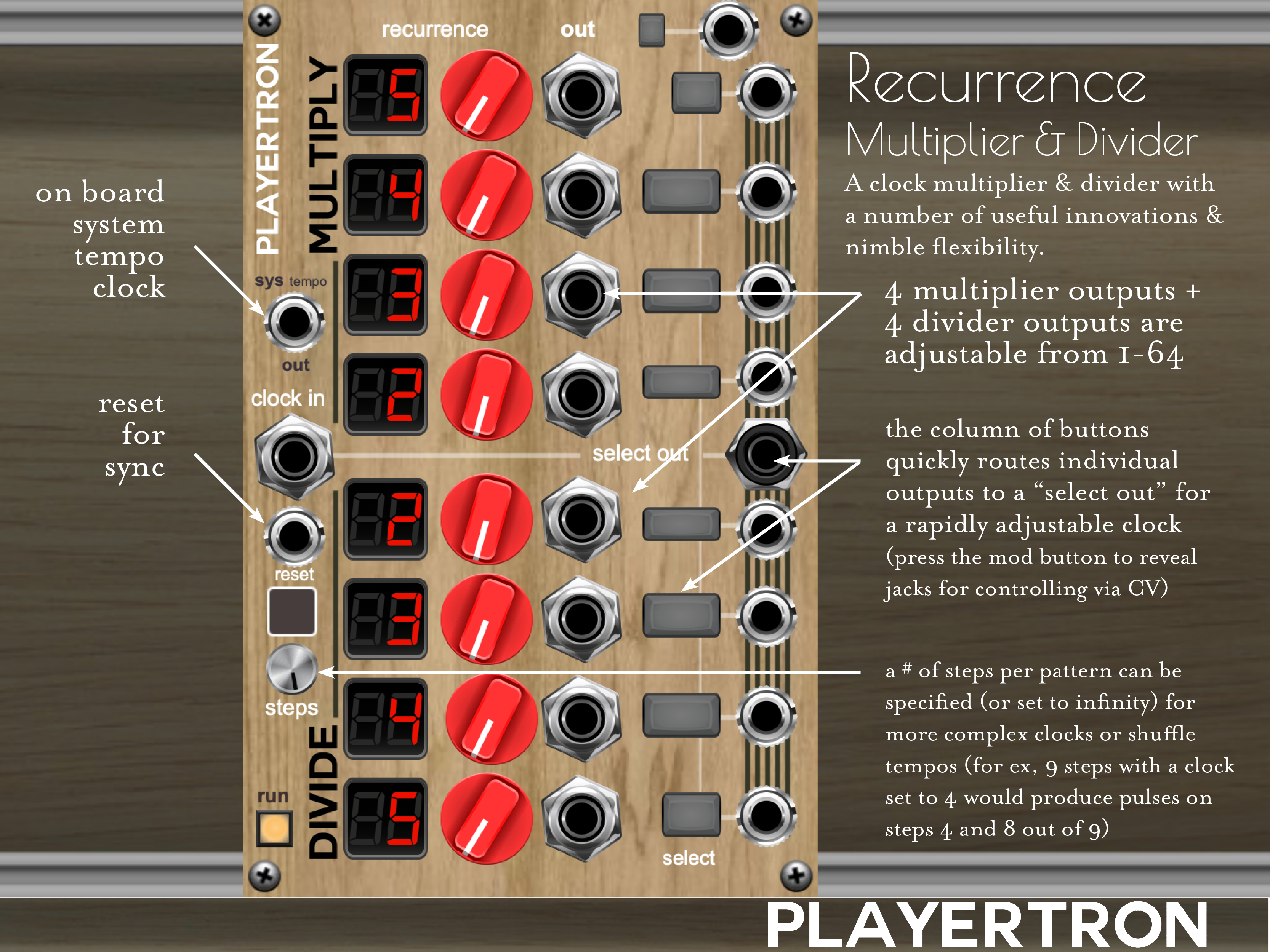 A flexible set of 4 multipliers and 4 dividers, the Recurrence module accepts clock trigger pulses and sends them out 1-64x faster or at 1-64ths slower rates. Individual jacks for each make it a hub for lots of coordination and an additional “select” output lets you toggle between them rapidly with selection buttons or via CV triggers. A “steps” knob lets you produce syncopated steps by setting an overall pattern length where, for instance, you could set a pattern length of 7 steps and a divisor of 3 to produce a clock on steps 3 and 6 with 3 and 4 pulse intervals. For convenience, an onboard system tempo output trigger pulses once per beat and can be wired right to the clock input and/or to your other devices.