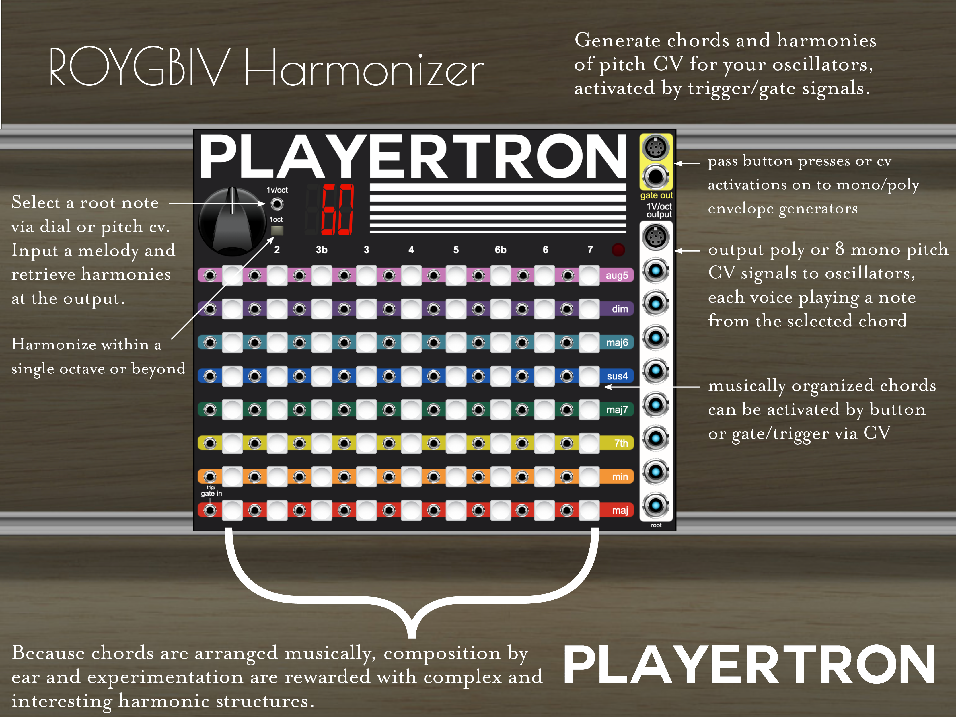 With a grid of harmoniously patterned chords that can be activated by button/gate/trigger and the ability to accept incoming pitch cv to produce outgoing harmonies via those chords, the ROYGBIV harmonizer helps you paint colorful melodic structures with the oscillators of your choice. It doesn’t take over and make (un)smart musical decisions, but rather puts compositional options at your immediate disposal. Flexible connectivity allows you to make use of a polyphonic oscillator or to output eight mono 1V/oct signals to multiple oscillators. You can make use of the mono and/or polyphonic gate outputs to forward button presses or incoming gate signals to an envelope generator, making it easy to compose by ear and experimentation. A root note dial opens up lots of possibilities for matching other material or general transposition. Control the root note knob via pitch cv, and input melodies while selecting chords to produce harmonizing pitch cv at the outputs.