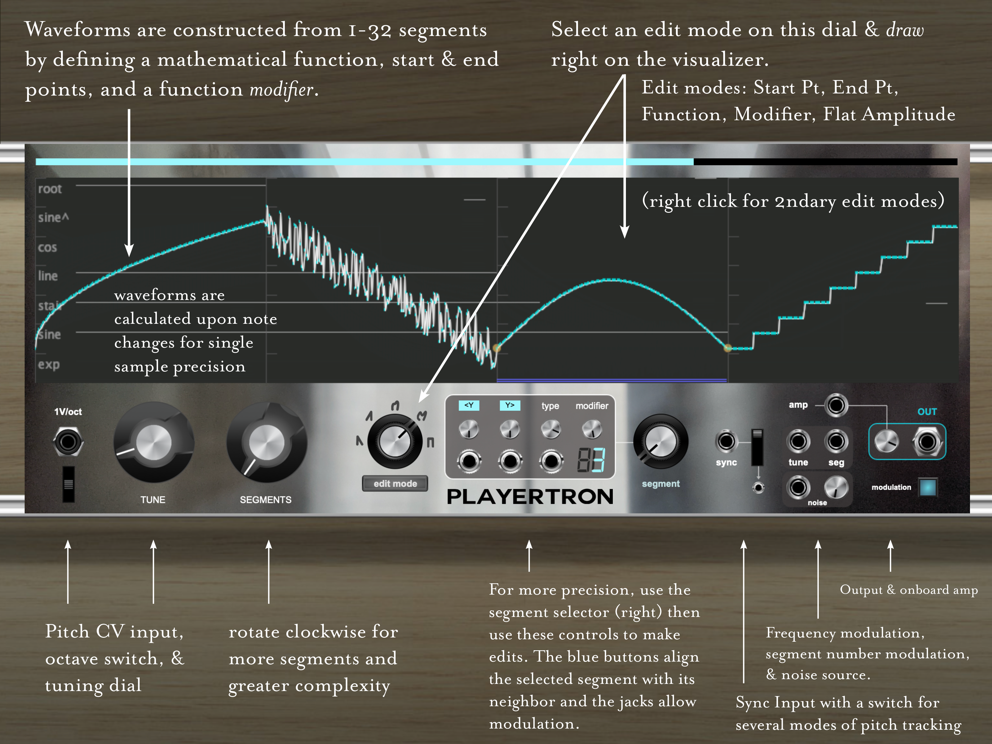 This oscillator is something special. From smooth & nuanced to dynamic & aggressive to wild & chaotic, the Serial-Function Oscillator is a shape-shifting monster. It is like a segmented organism that can be cut into pieces and regenerated at will, with modulatable segment counts ranging from 1-32. The start and end points give form to each segment as they are drawn on the visualization (there are also dials for precise settings). After a turn of the edit mode dial, a mathematical function can be chosen by dragging a segment waveform, and, in the next edit mode position, a modifier is specified to affect the mathematical path for tonal variation. Segment modulation adds further complexity. It’s not so free-form that it’s useless, while offering endless discovery — it sounds amazing.