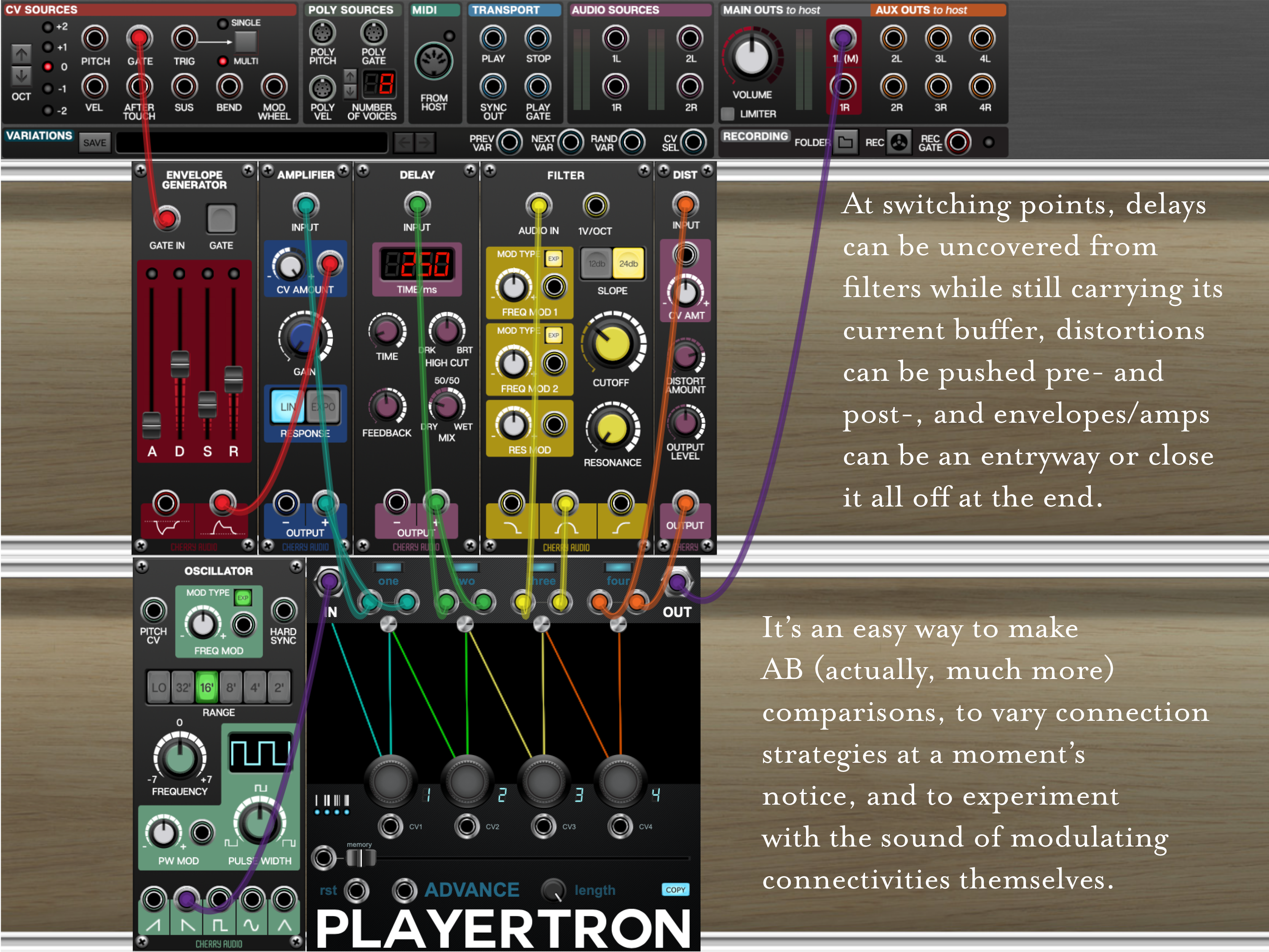 You can push a wavefolder with a filtered signal in one moment and then a raw signal in the next. A delay can be allowed to ring out and then get swapped behind an envelope/amp to close with a release. Reverbs, still holding unaffected signal, can leap out in front of filtered sound in a moment for an unusual contrasting clang. Modulated at audio rate, an effects chain can be a sound in its own right, and even at slower rates, you can harness a sound not unlike static electricity somehow still carrying musical tone. On the other hand, maybe you normally feel too lazy to compare what a patch would sound like when reordering processors and effects, and with this device, you can experiment along those lines with minimal effort and toggle back and forth (and more) readily.