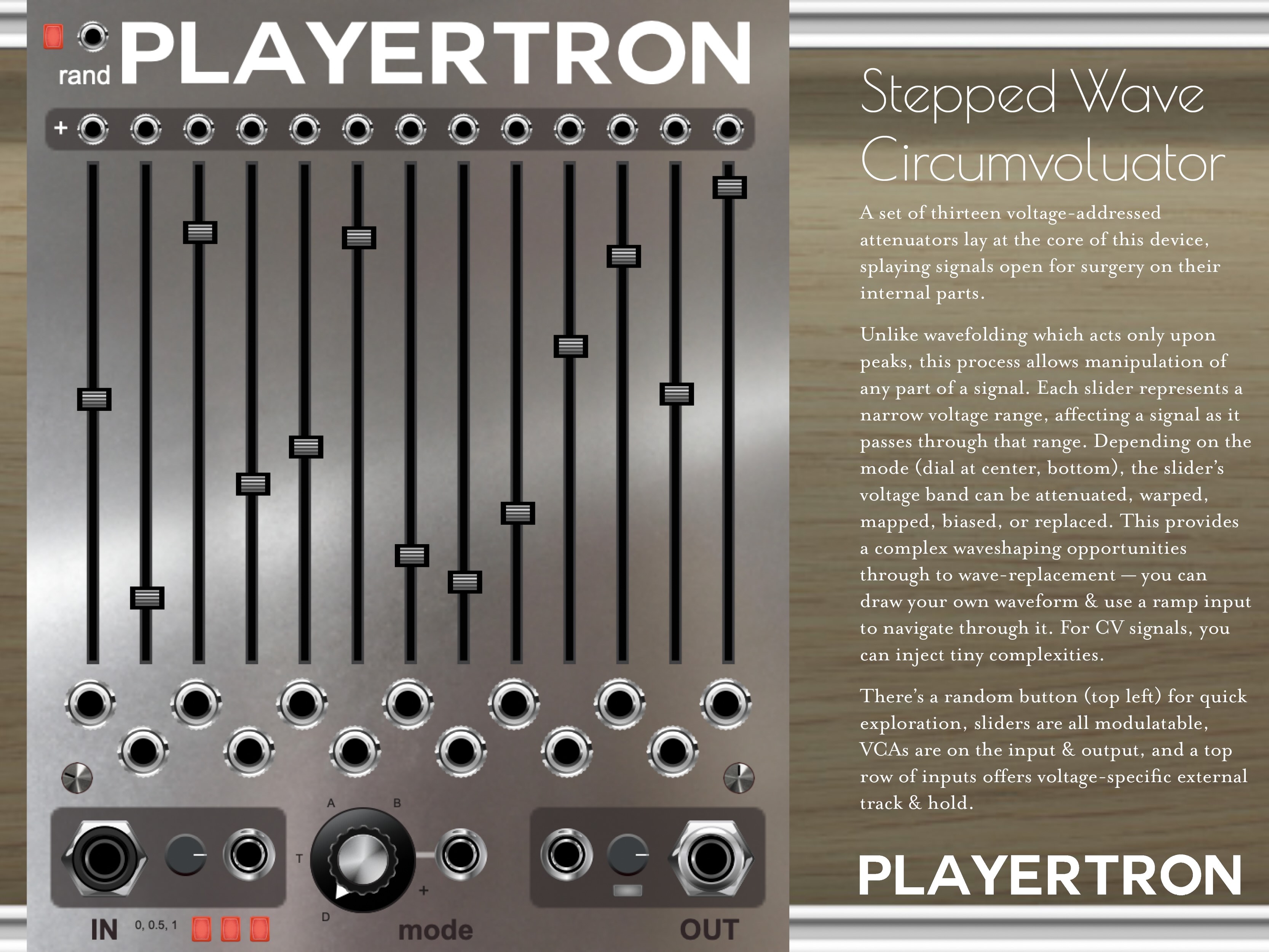 The random button (top left) helps you explore slider variations rapidly, the sliders are individually modulatable (below sliders) and offsetable (above), VCAs on the input & output make it easier to tinker, and a wet/dry dial makes subtlety just as possible as madness.