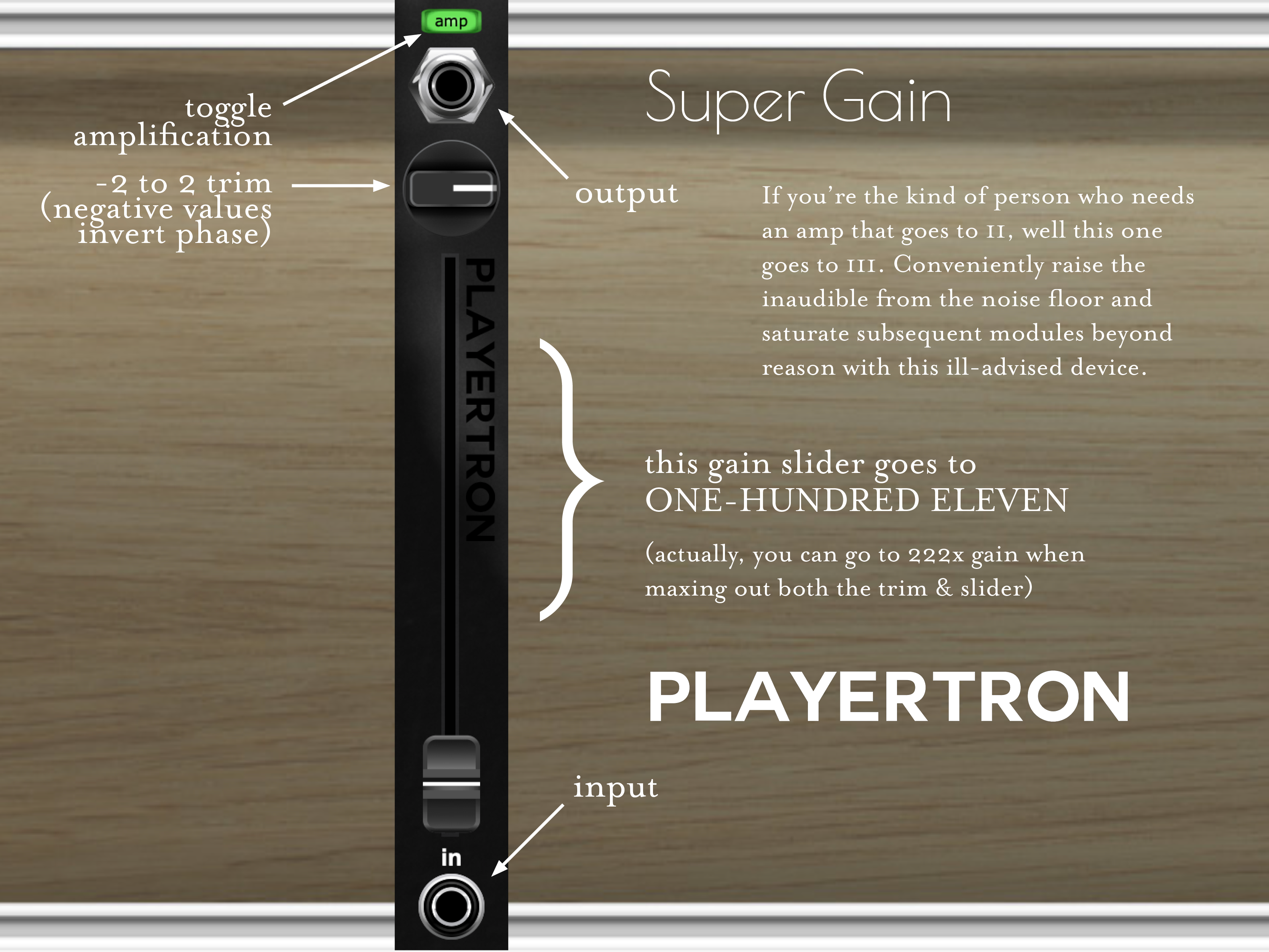 If you’re the kind of person who needs an amp that goes to 11, well this one goes to 111. Conveniently raise the inaudible from the noise floor and saturate subsequent modules beyond reason with this ill-advised device. An upper trim pot covers normal ranges up to 2x gain, but extends to negative values so that you can invert the phase too. Used in combination, the trim pot effectively determines the slider range to produce a quick and simple tool for drastic amplitude modification.