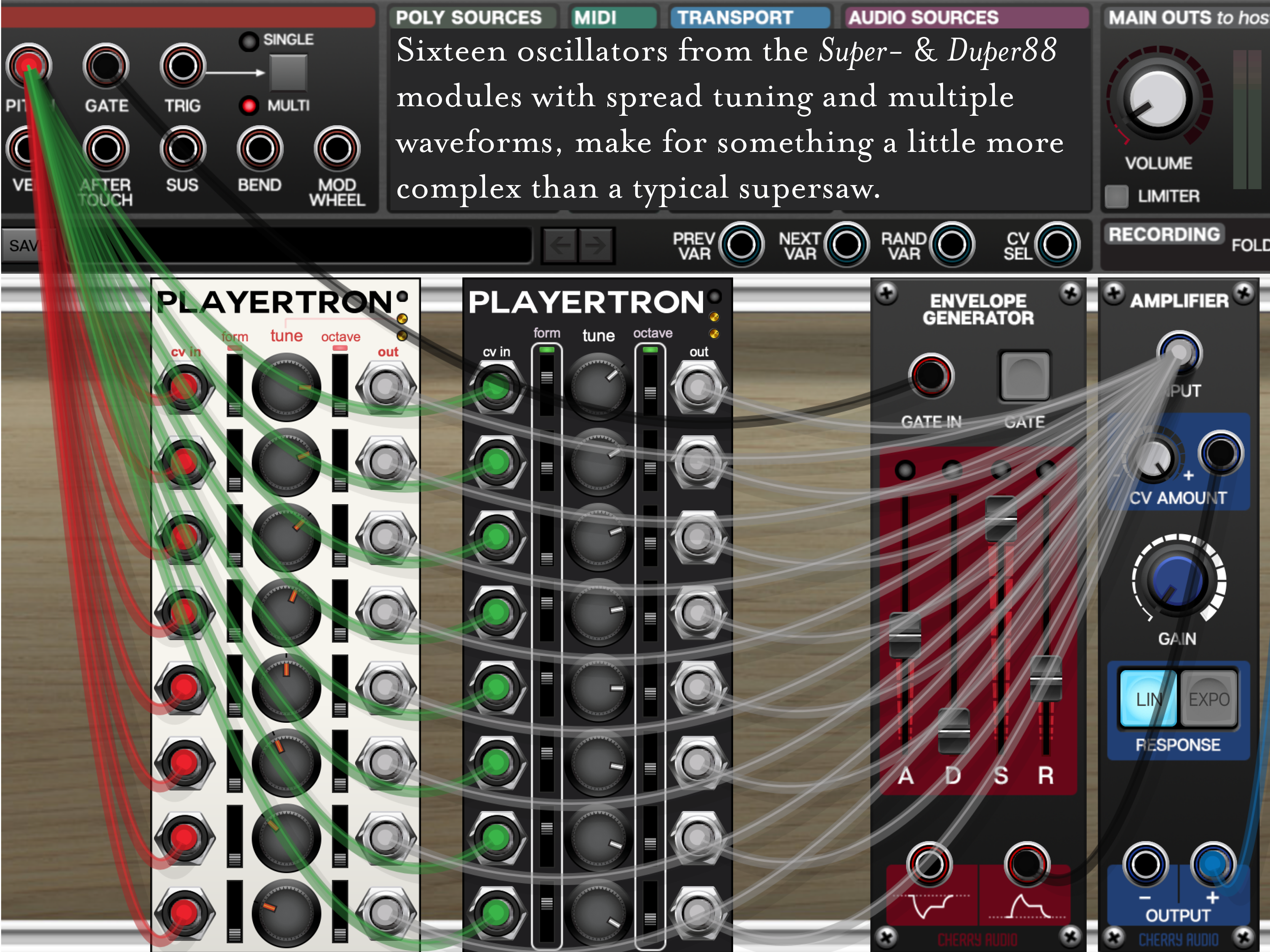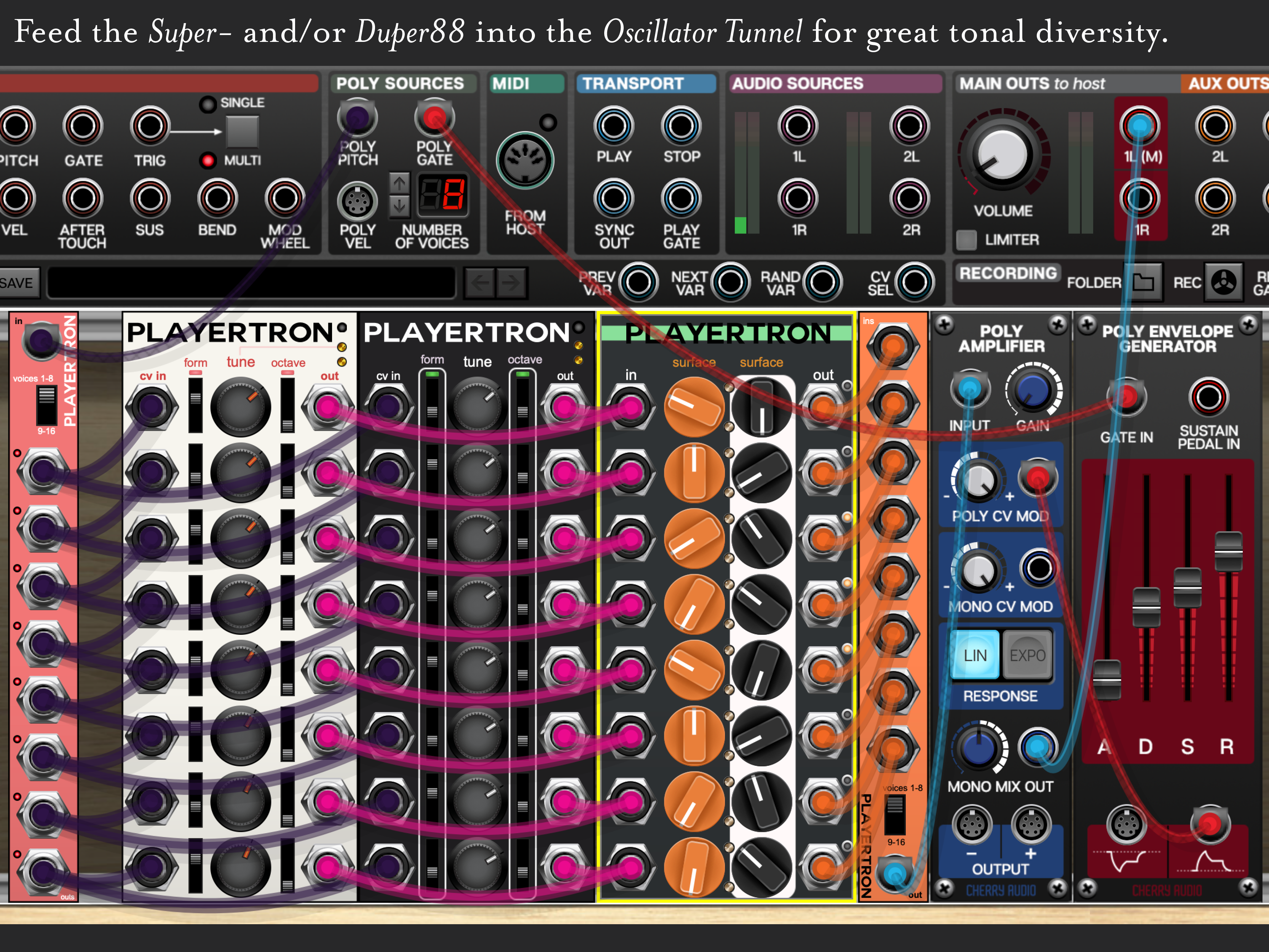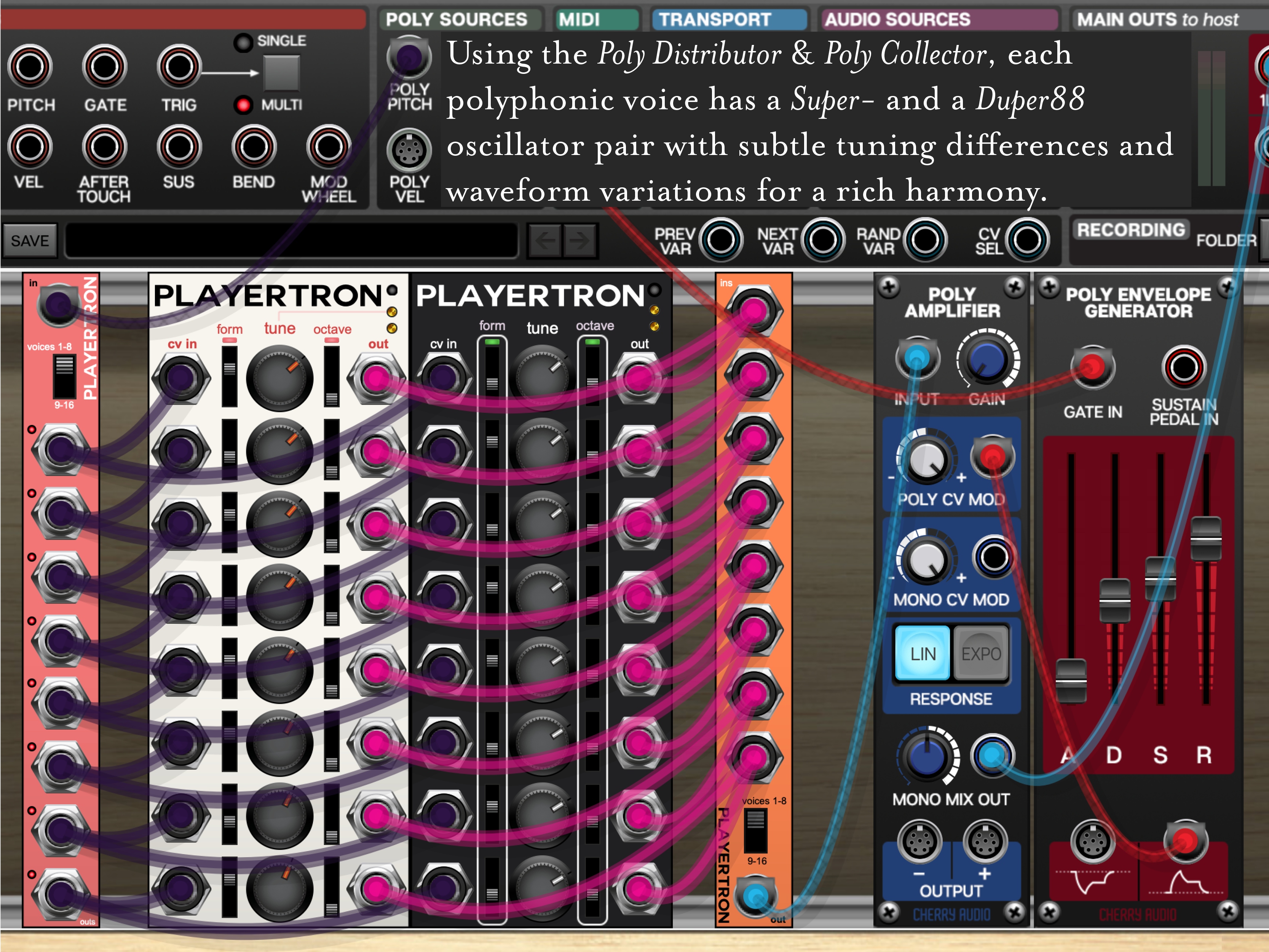 With a device like the Poly Distributor (in goes a poly connection, out comes eight voices as individual connections), eight voices can be routed to eight separate oscillators, each with perhaps subtle tuning variations or maybe even totally different sounds that blend into a more varied polyphonic sound. The result sounds like an arrangement of layers of synthesizers harmonizing together.