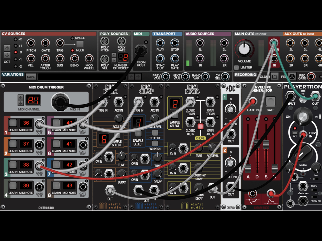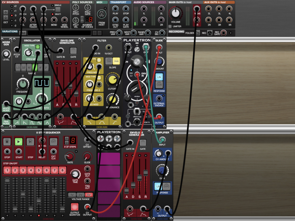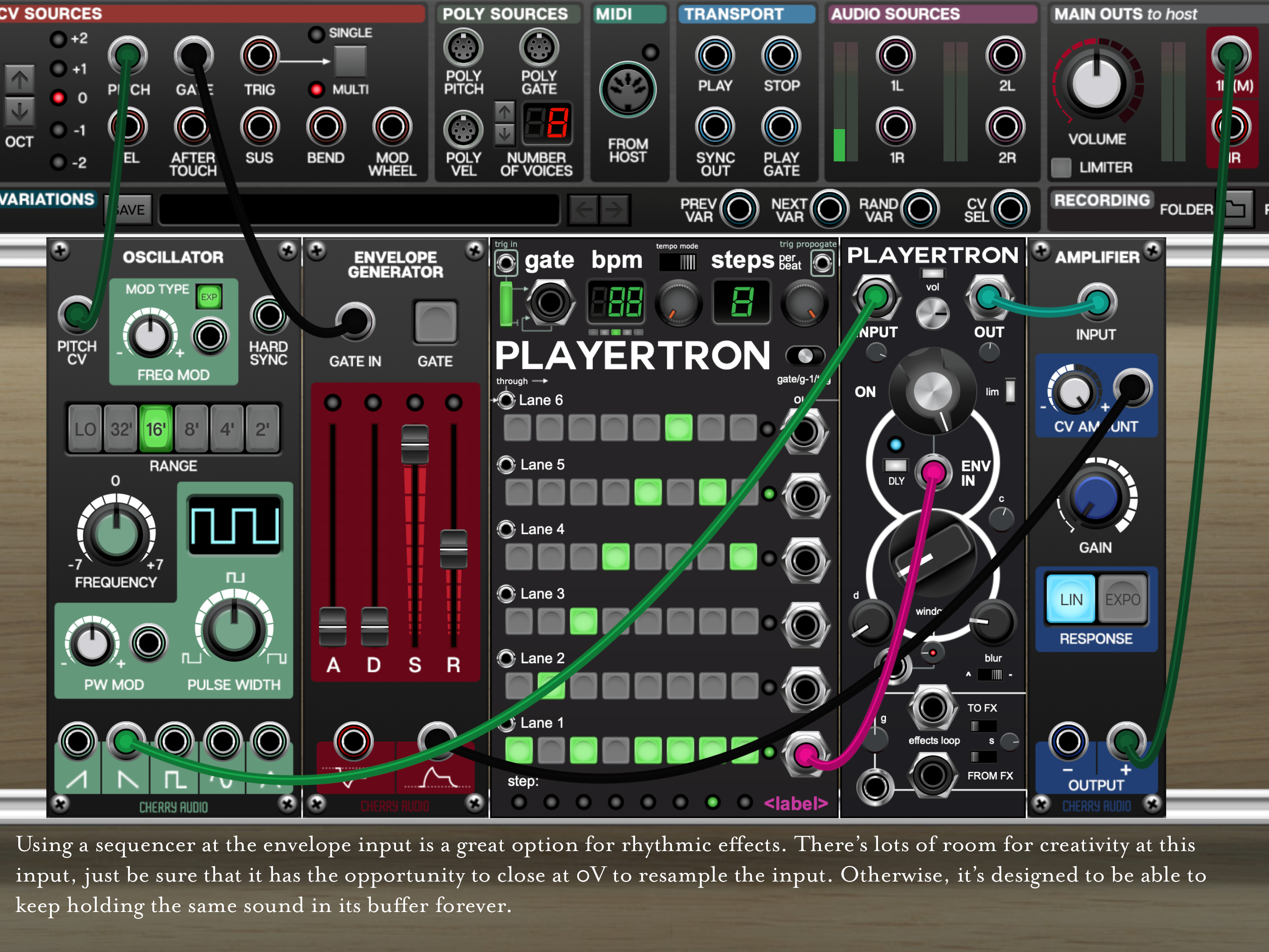 When an incoming envelope (or gate) goes above 0V, a window of sound is frozen in a loop and sent through a network of crossfading buffers, allpass filters smearing EQ bands, and other such processes. The envelope voltage affects the output volume and the frozen audio is sustained until it returns to 0V and new incoming audio can be pulled into the buffers. While the effect is engaged (by the envelope), it’ll sound sort of like a granular processor and reverb under tight control.