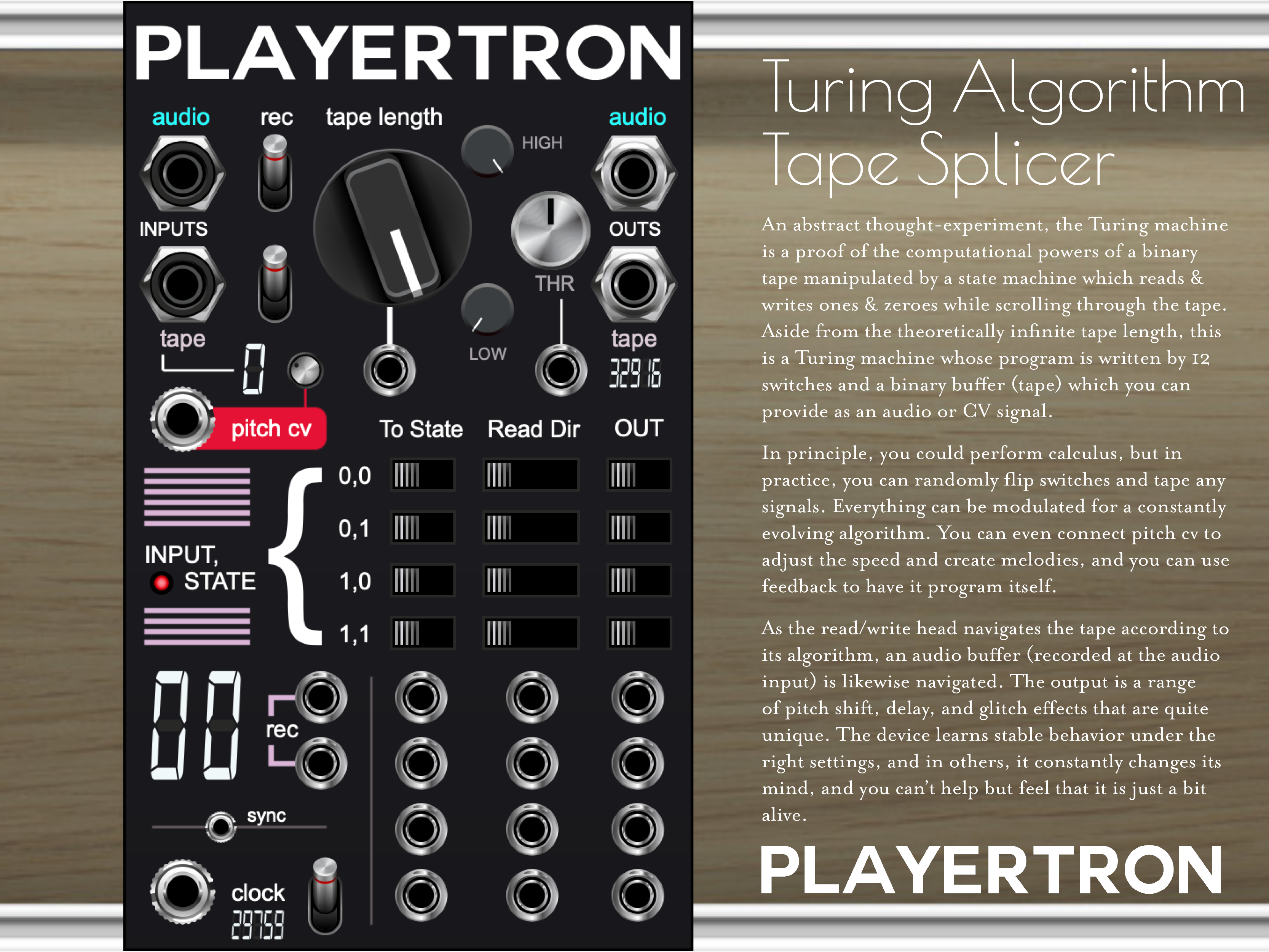 As the read/write head navigates the tape according to its algorithm, an audio buffer (recorded at the audio input) is likewise navigated. The output is a range of pitch shift, delay, and glitch effects that are quite unique. The device learns stable behavior under the right settings, and in others, it constantly changes its mind, and you can’t help but feel that it is just a bit alive.