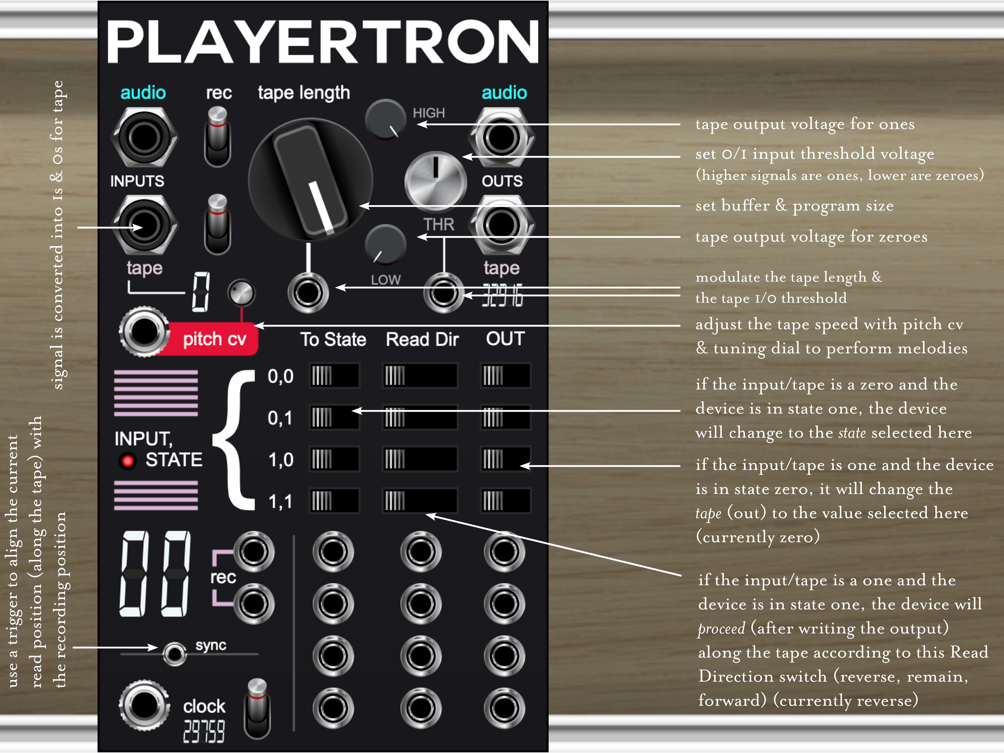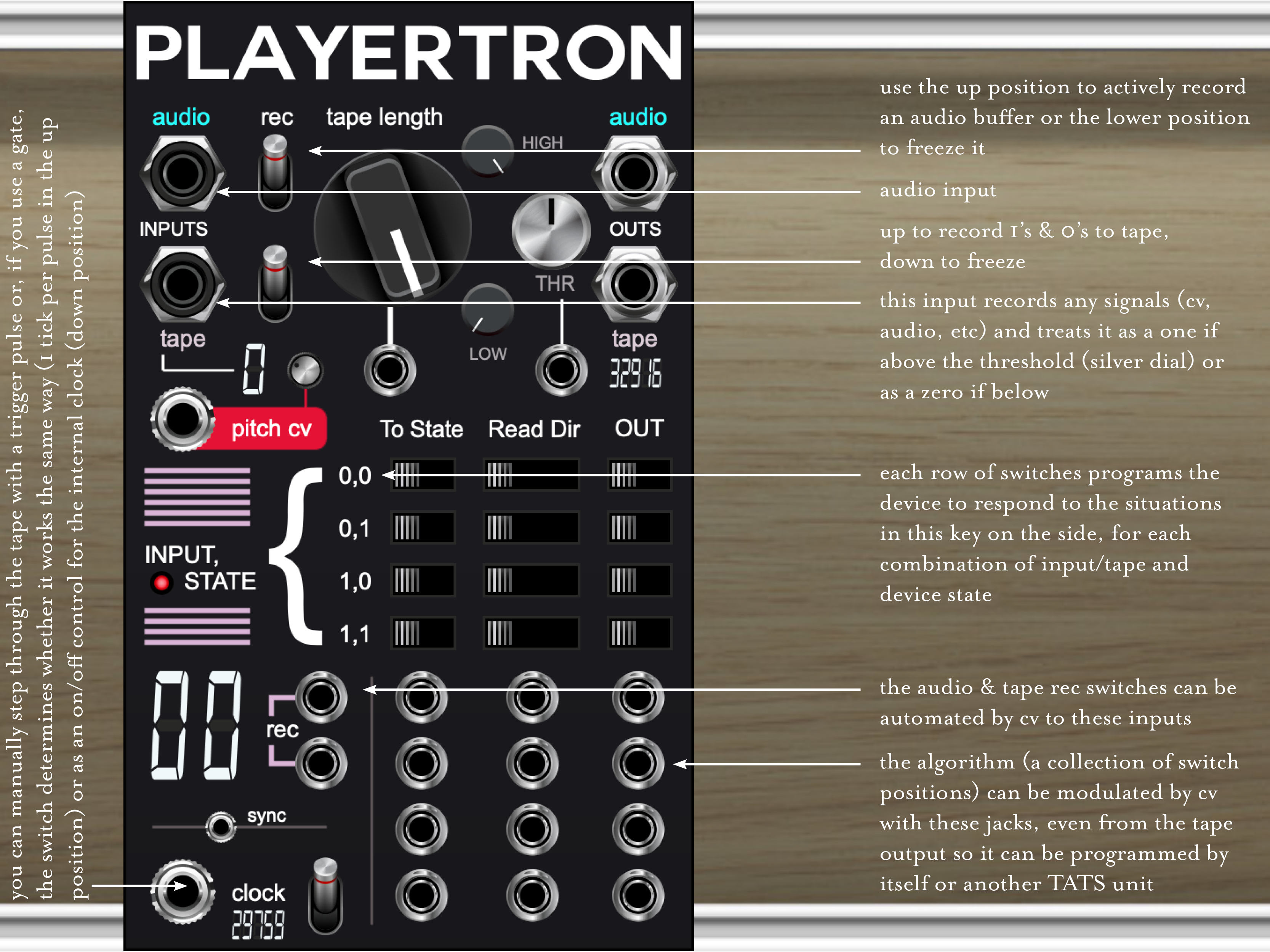 The 12 jacks at the bottom right allow you to modulate the switch positions, so you can have the algorithm changing in real time. If you feed the tape output into these jacks, the device is now programming itself. LFOs and sequencers are good ideas too. Sync and clock inputs take trigger pulses/gates to control tape position and advancing respectively, you can modulate the recording status of the audio and tape via the REC jacks with gate signals for freezing effects, and you can also modulate the binary threshold and tape length to affect the overall nature of processing.