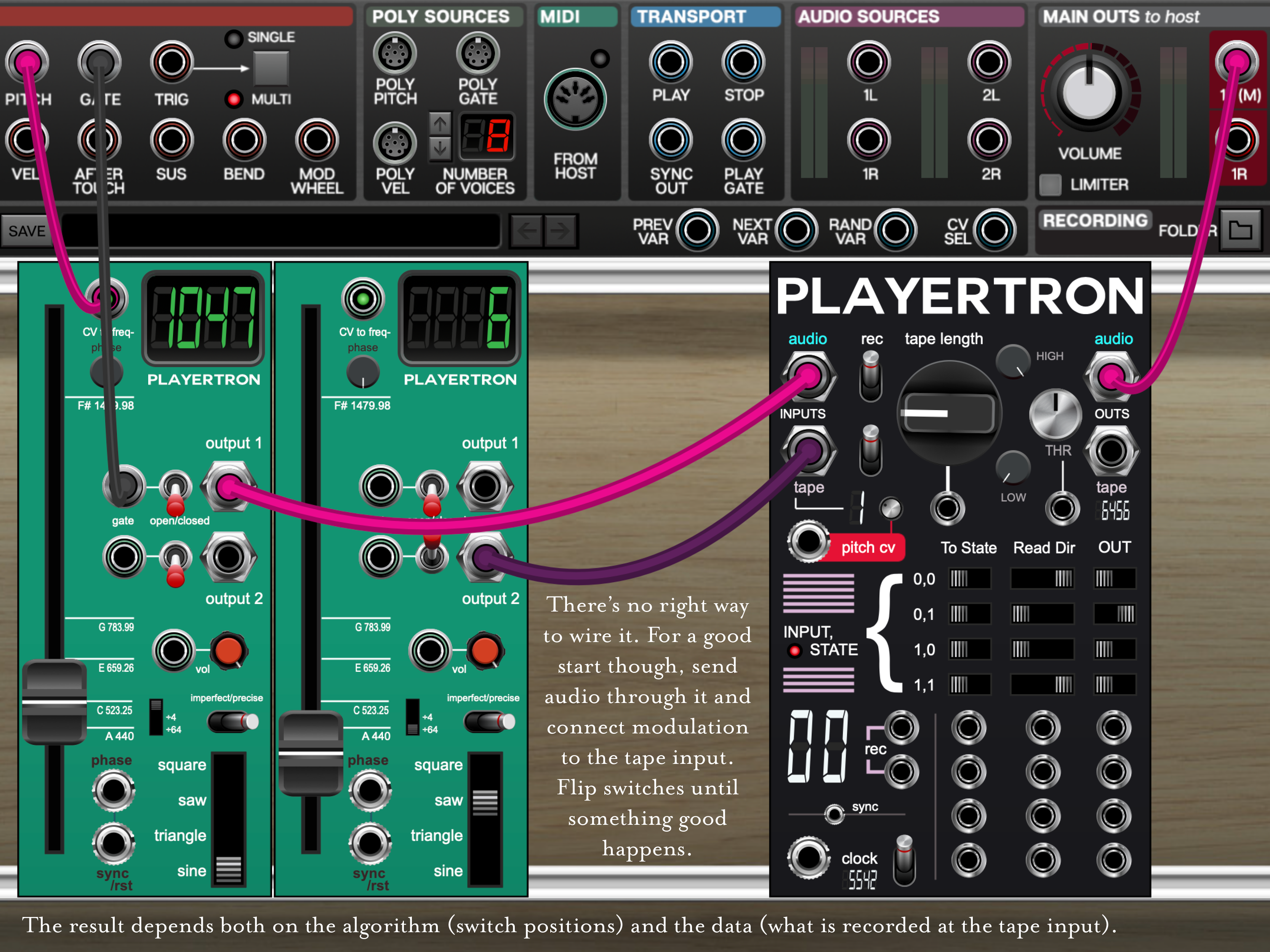 An abstract thought-experiment, the Turing machine is a proof of the computational powers of a binary tape manipulated by a state machine which reads & writes ones & zeroes while scrolling through the tape. Aside from the theoretically infinite tape length, this is a Turing machine whose program is written by 12 switches and a binary buffer (tape) which you can provide as an audio or CV signal.