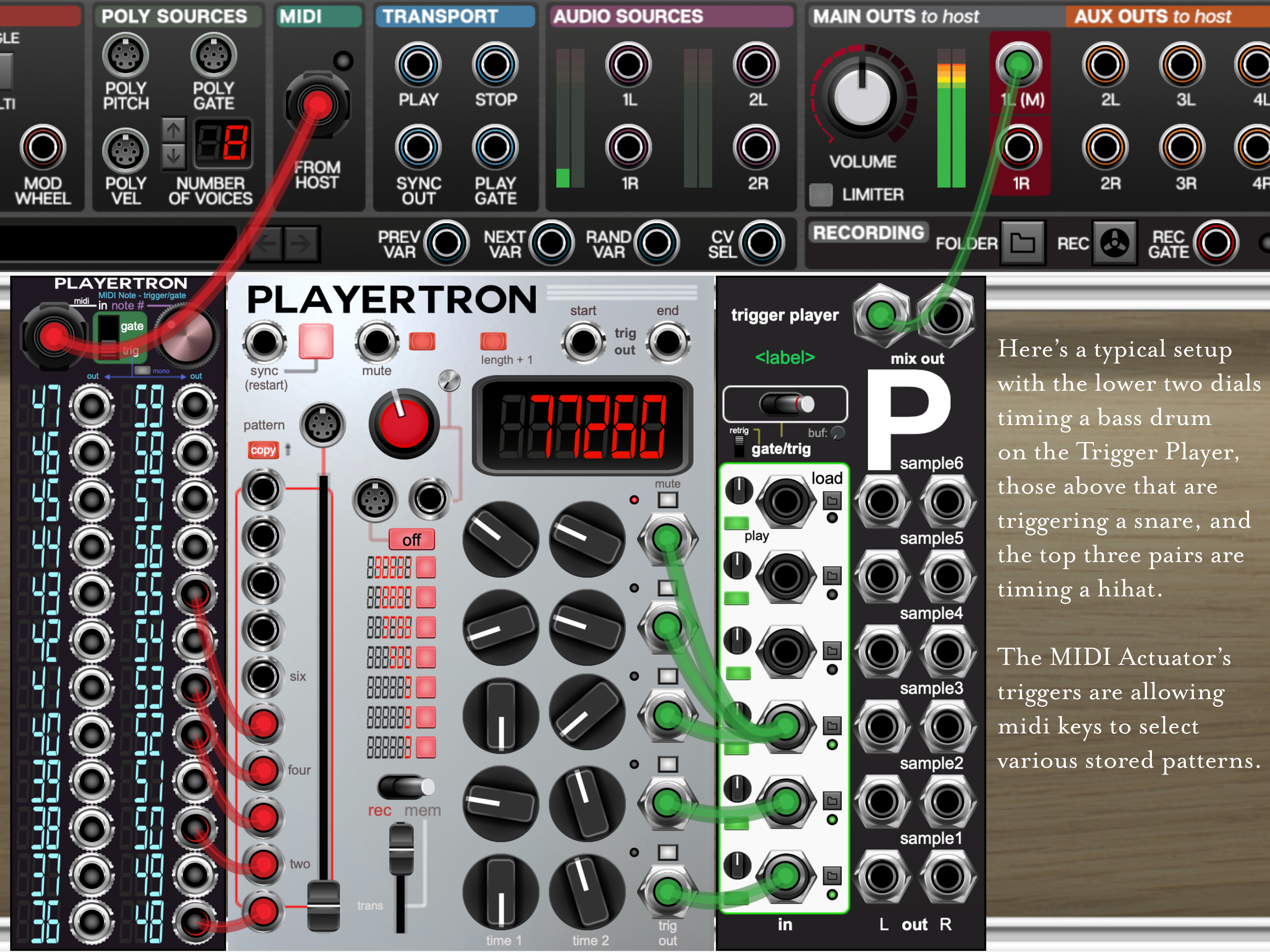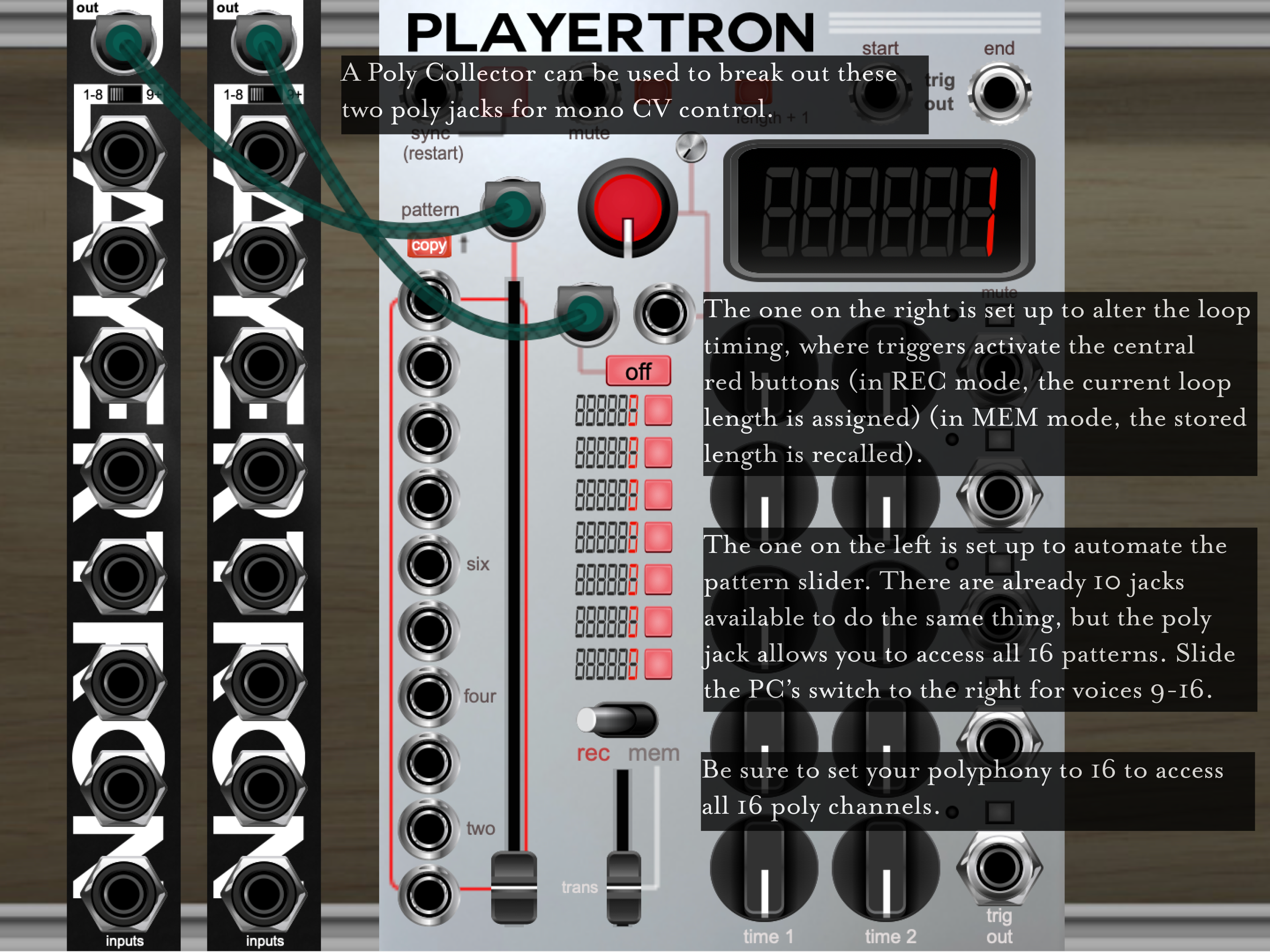 Various patterns are associated with the memory slider (left) and motorized dials snap into their previous positions as the slider is moved. Patterns can be changed with triggers to the leftmost jacks (1 per pattern) or the above poly jack (a trigger on a voice # will initiate a memory slider move to that pattern). Pattern changes don’t reset the loop position, so complex switching can create new pattern variations.