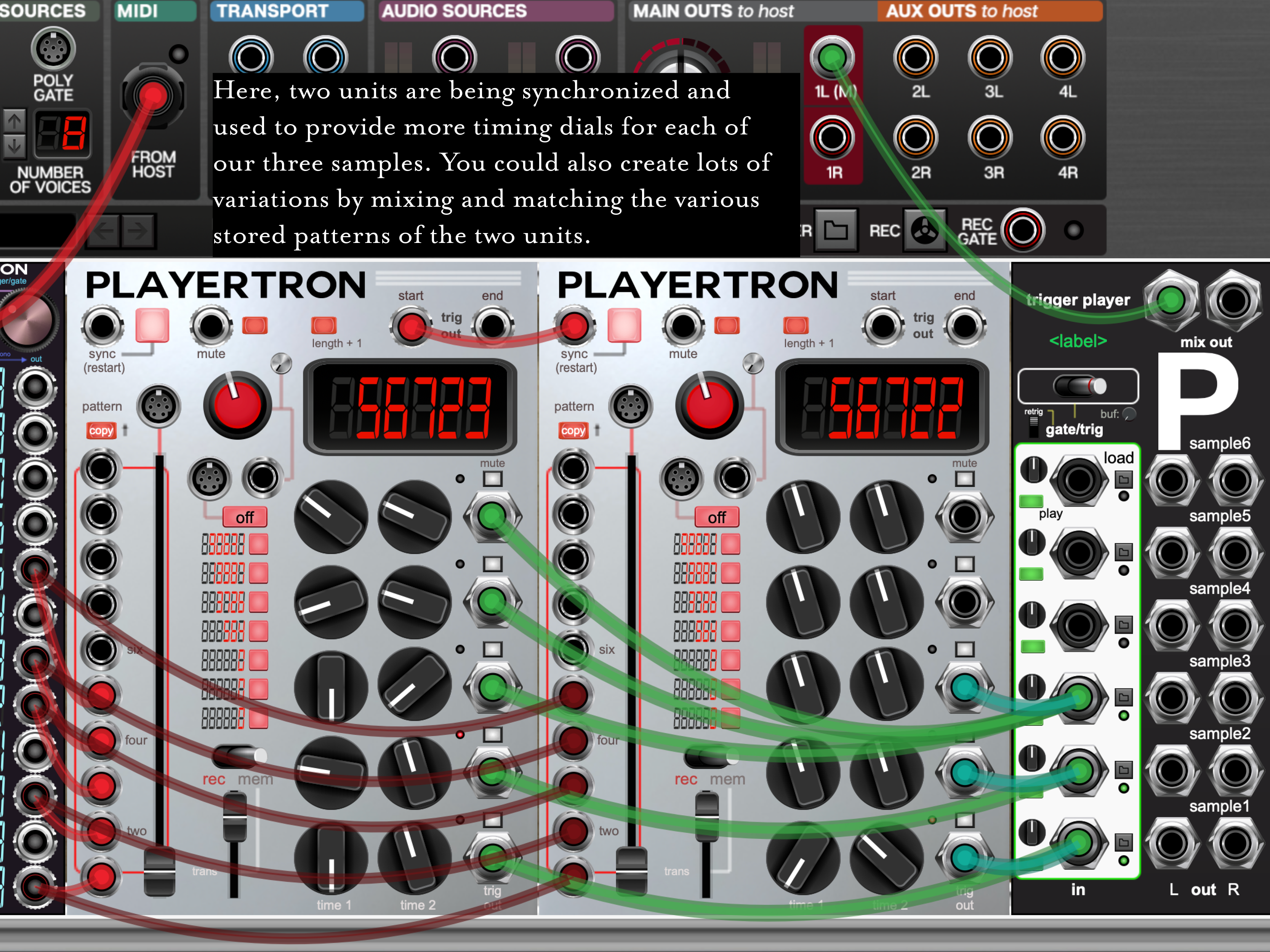 Multiple units can also be used in cooperation, syncing them from one device’s “start trig-out” to another’s “sync (restart)” input. On a side note, the “end trig-out” sends a pulse on the last sample of the loop, and can be especially useful for stopping synced loops on other devices.