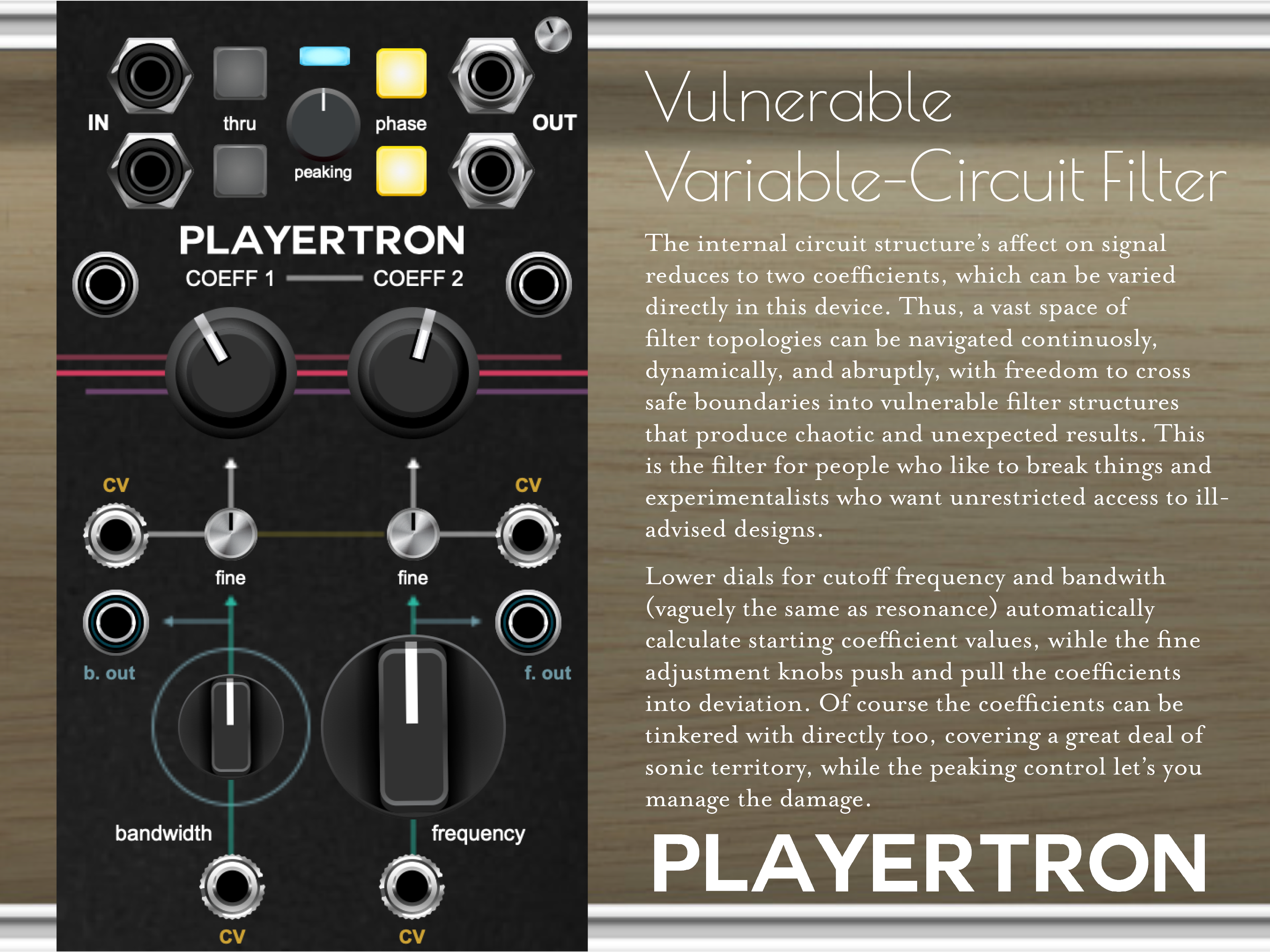 Vary circuit structure along a continuum of designs to explore the full set of possibilities, crossing through elegant curves to inviable behaviors alike, with the Vulnerable Variable-Circuit Filter. Start with the frequency and bandwidth dials to automatically calculate coefficients for a tonal starting point, then diverge via the silver fine adjustment knobs to stretch the circuit structure, potentially beyond proper functionality. Or, jump right in and scan filter structures by directly manipulating the coefficient controls. The peaking feature allows you to mitigate the destructiveness of vulnerable topologies, which are of course the funnest to dabble in.