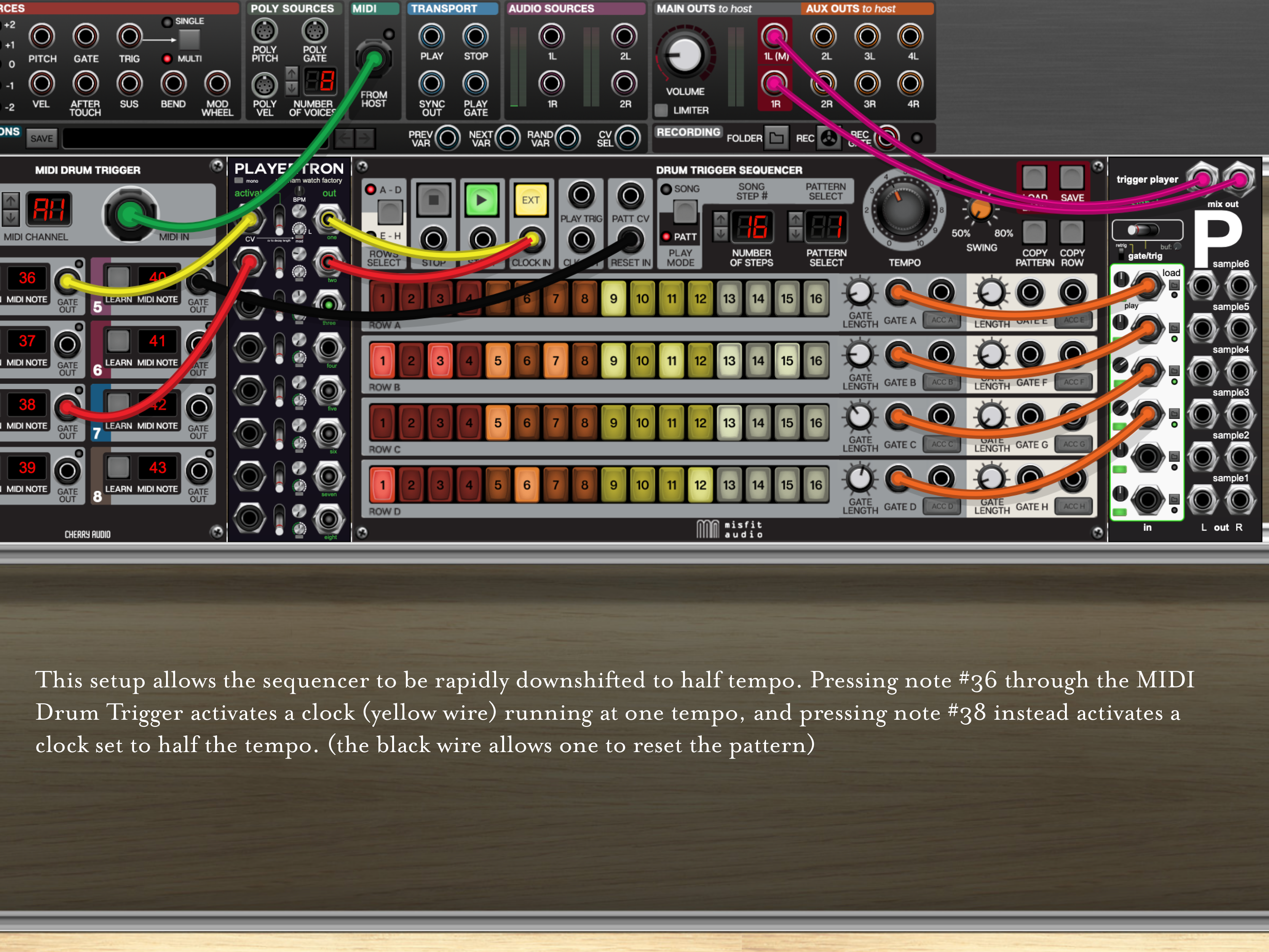 A “mono” mode can be toggled on so that only one clock is active at any time (with priority towards the bottom), which makes it a useful switchboard for activity or allows you to change the timing of a device (with multiple clocks connected to the same device) on the fly. The CV activation jack can serve double duty when the “mod” button is engaged at any given clock so that signals greater than 0V still activate the clock, but also, the pulse width/length becomes proportional to the magnitude of the voltage (5V=100%, 0.1V = super short).