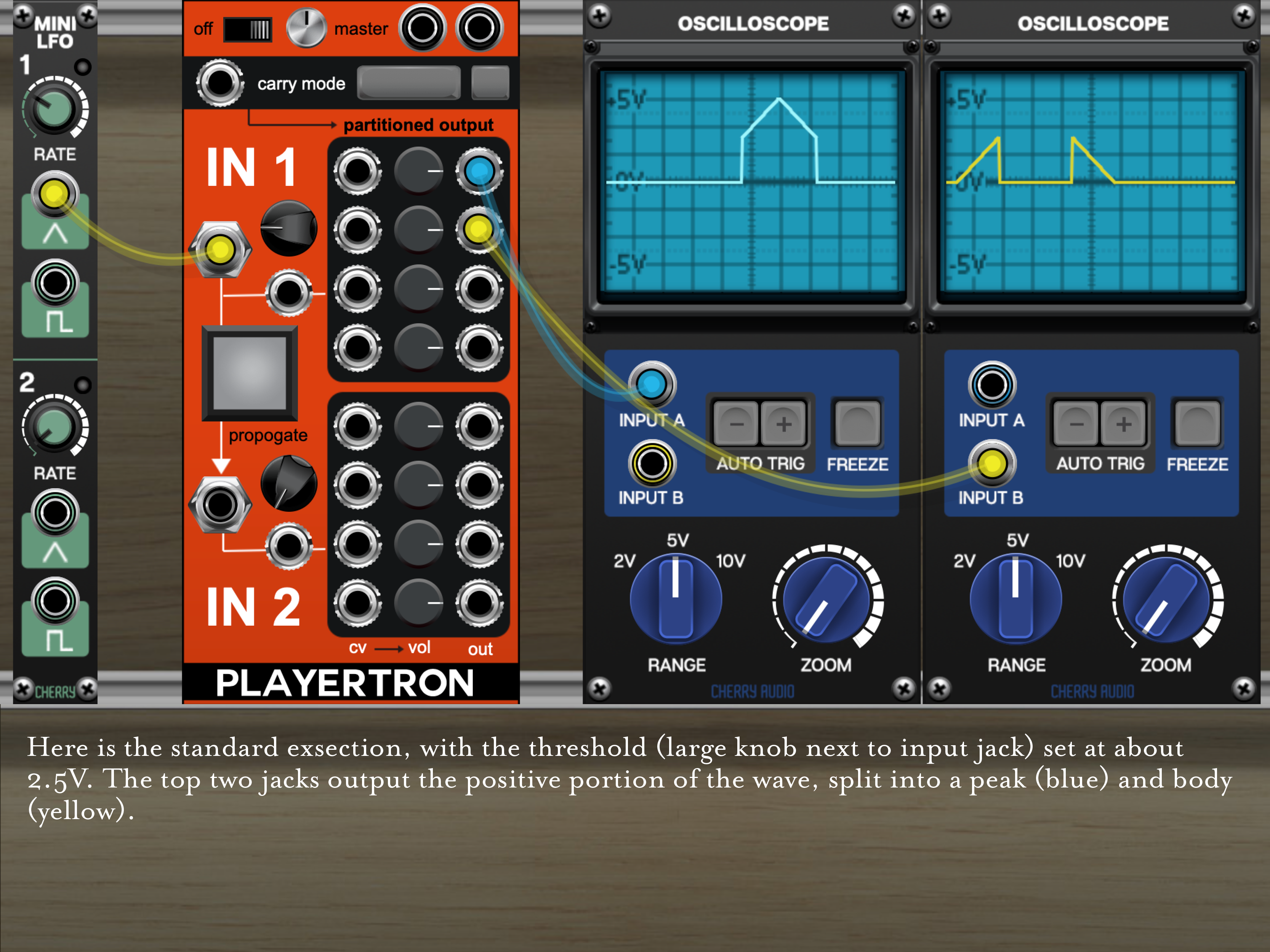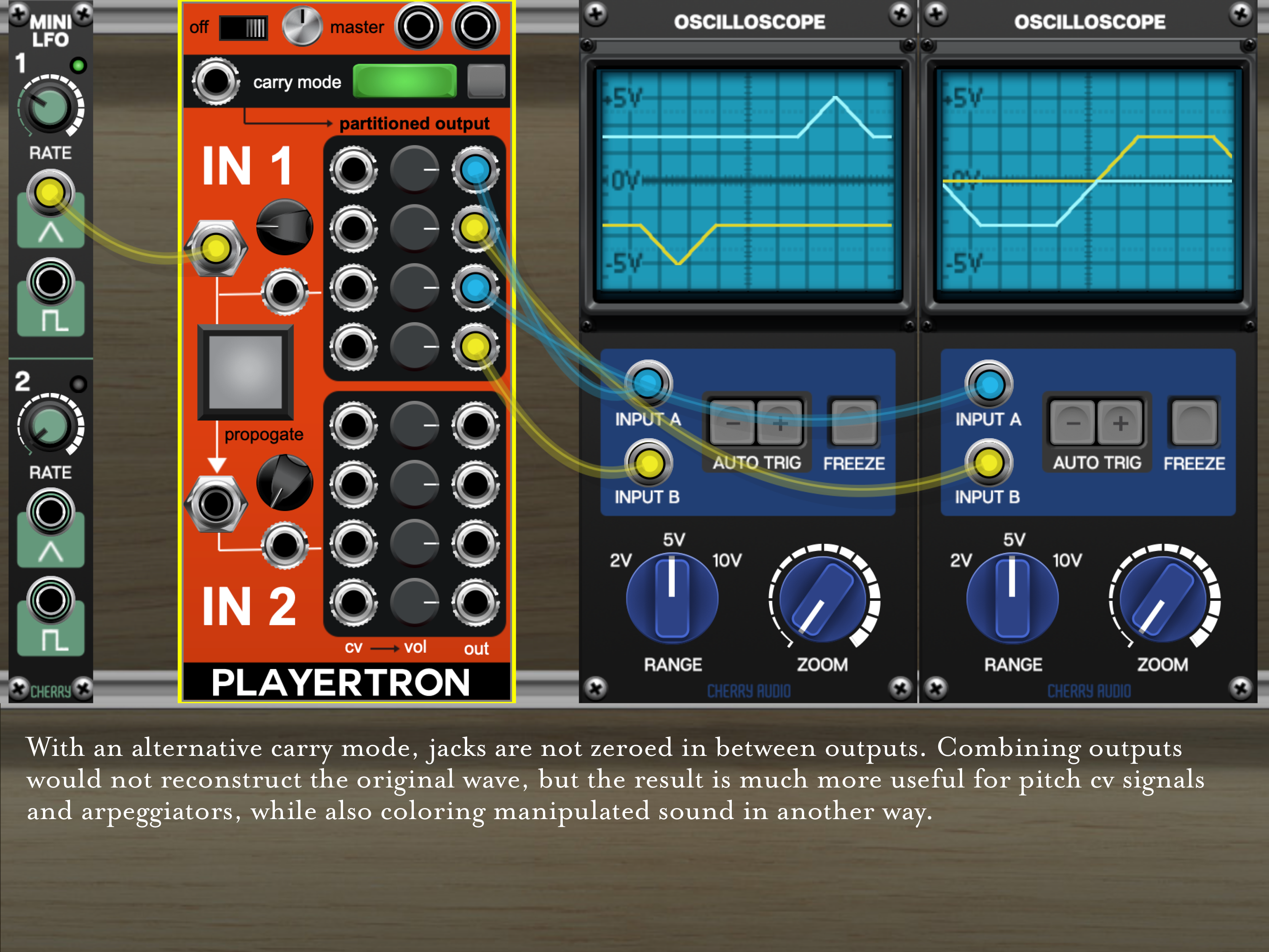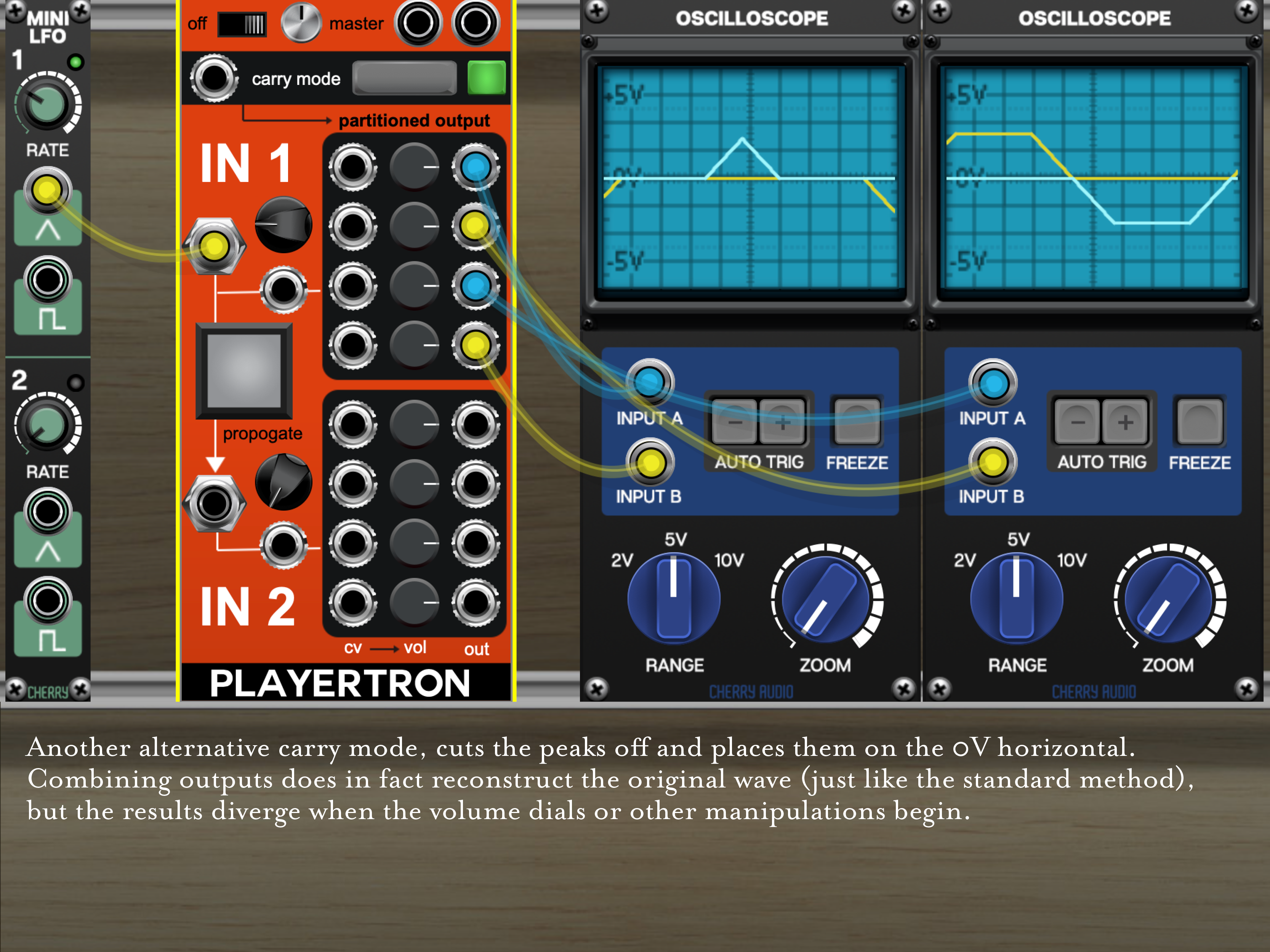Carry mode controls offer various dissection methods and can be controlled with a single CV jack. As a wave is processed, it is diverted to one of four jacks – lower & upper positive outputs and lower & upper negative outputs. With the large carry mode button on, the signal is not zeroed in between such diversions such that reassembled waves are summed incorrectly, while offering something interesting. The second, smaller carry mode button offers a secondary partitioning method, where a crest is split into two body and crest portions (rather than the whole cresting wave coming out of a single jack), producing the same reconstructed original signal when left unaffected, but allowing for different results when manipulated.